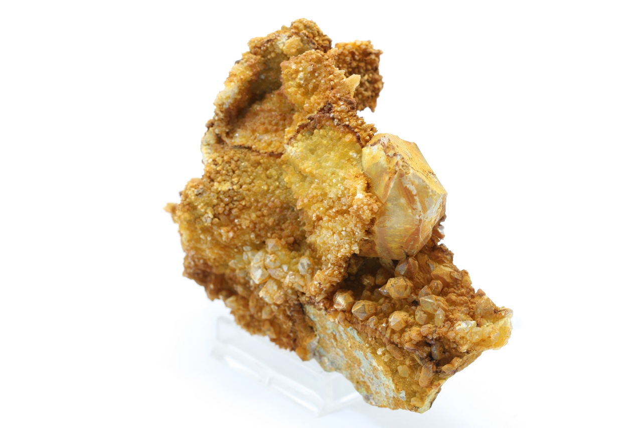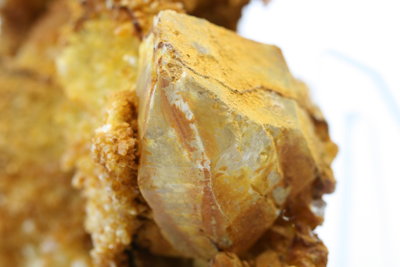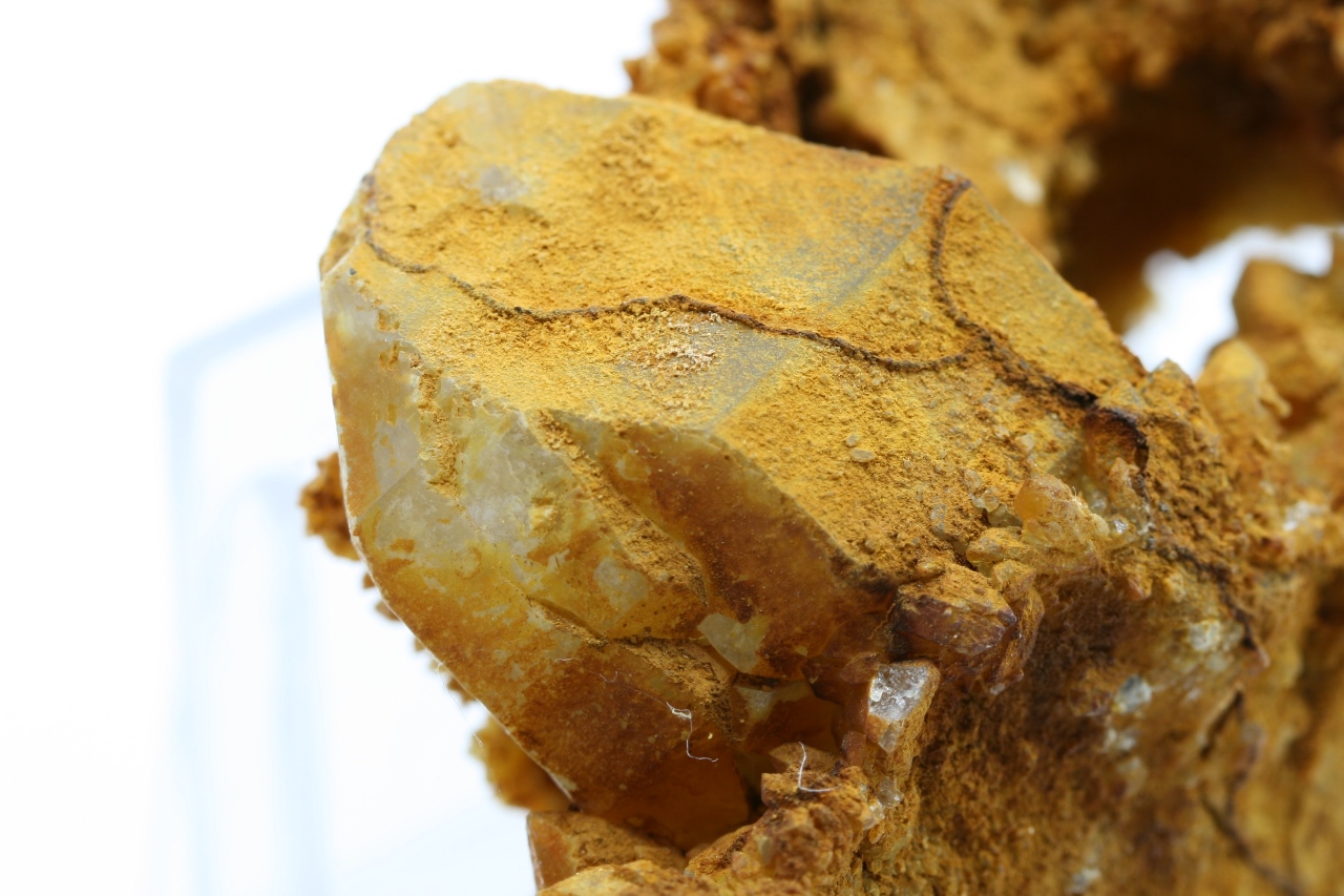 One larger and several smaller yellow rock quartz specimens typical for this locality. The largest crystal is 27 mm along the c-axis.