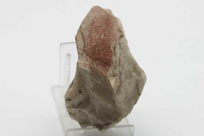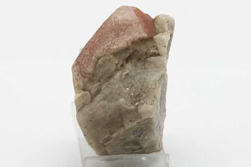 A quartz specimen with iron minerals on the surface. At the top, there is a approximately 2 cm large Zinc volborthite.