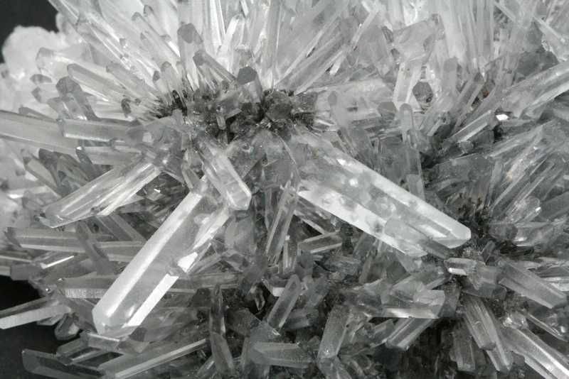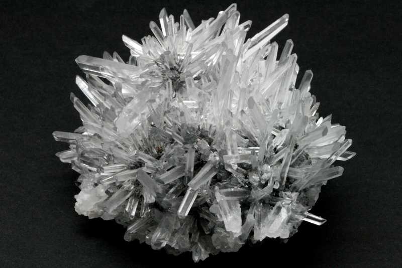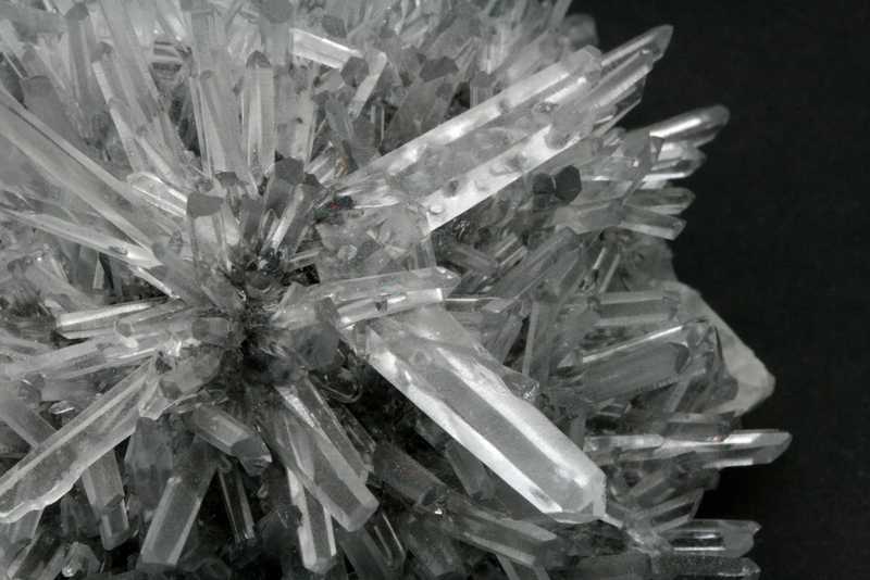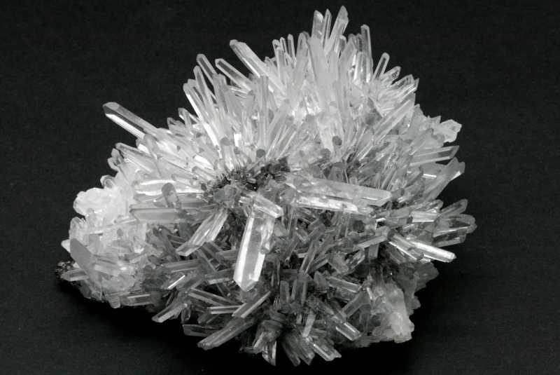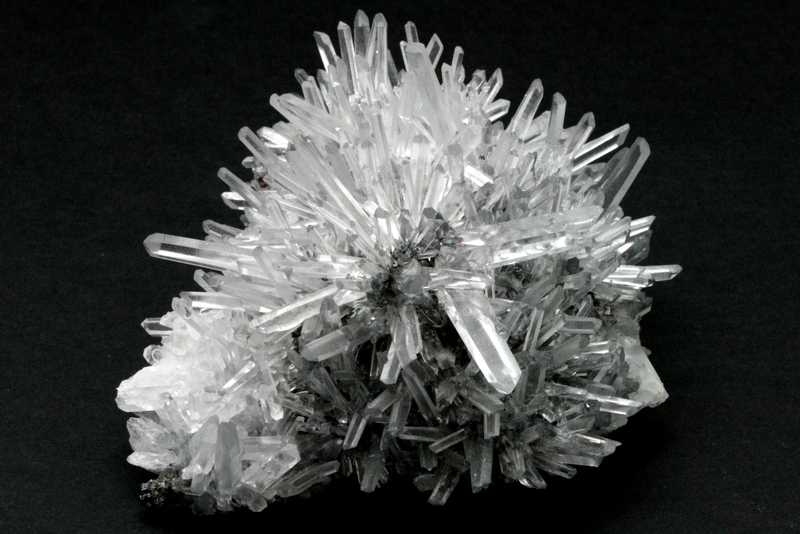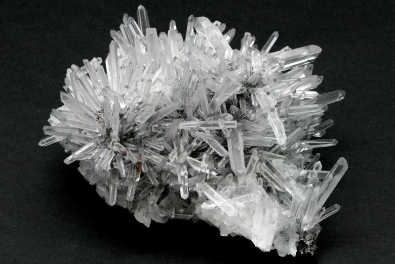 A classic example of quartz with a Japanese twin. A specimen of clear quartz crystal druse.