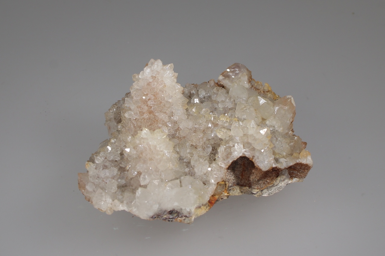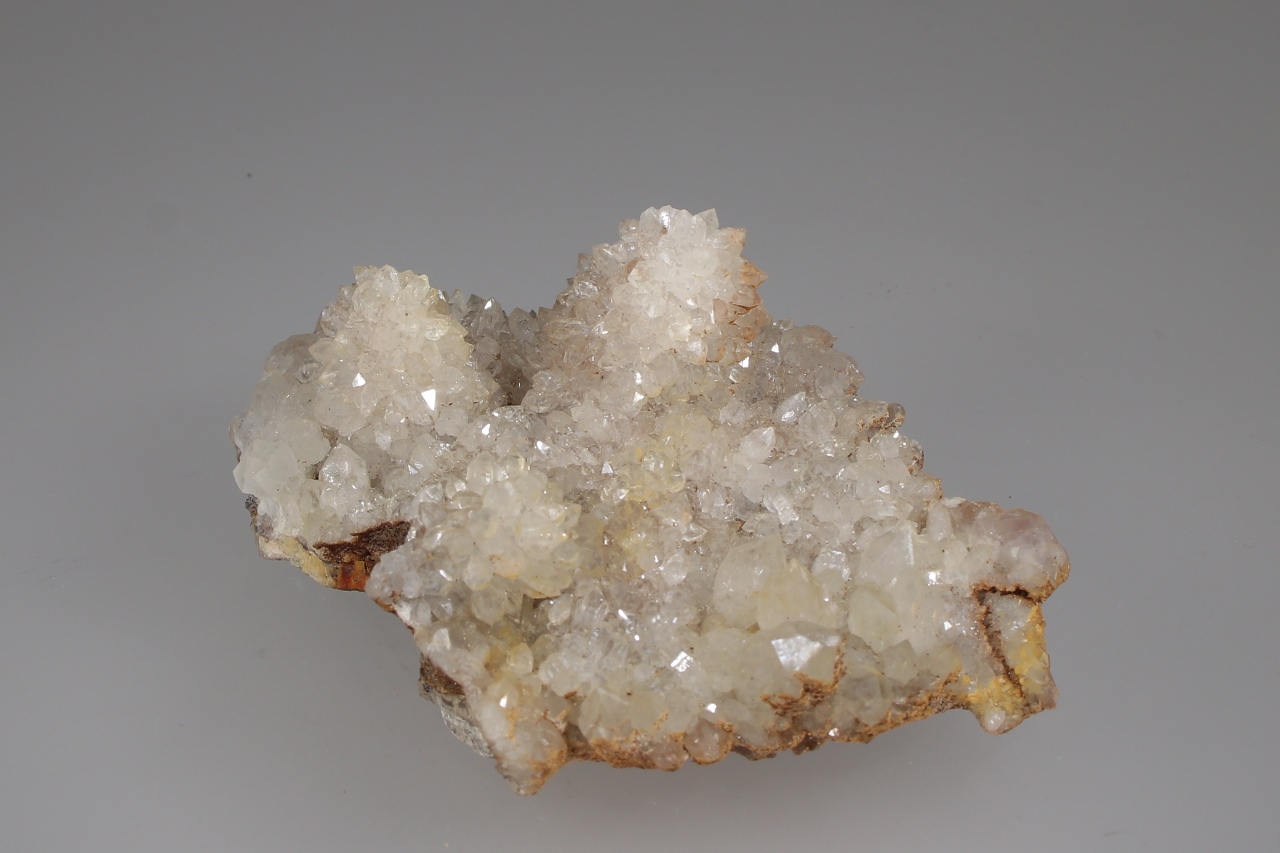 Perimorphosis of approximately 2 mm large, clear crystals of quartz grown on up to 2.5 cm large scalenohedra of now leached calcite.