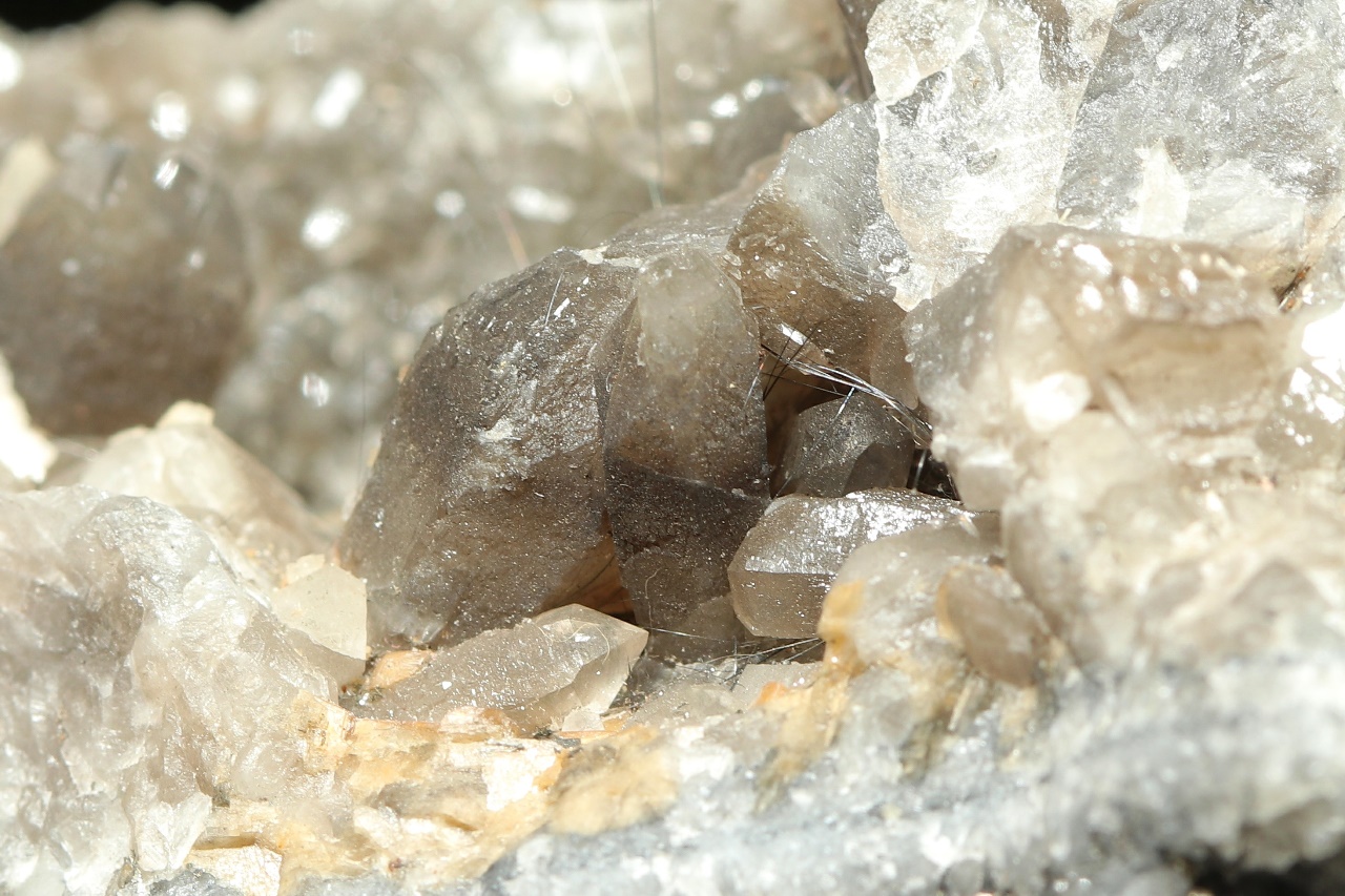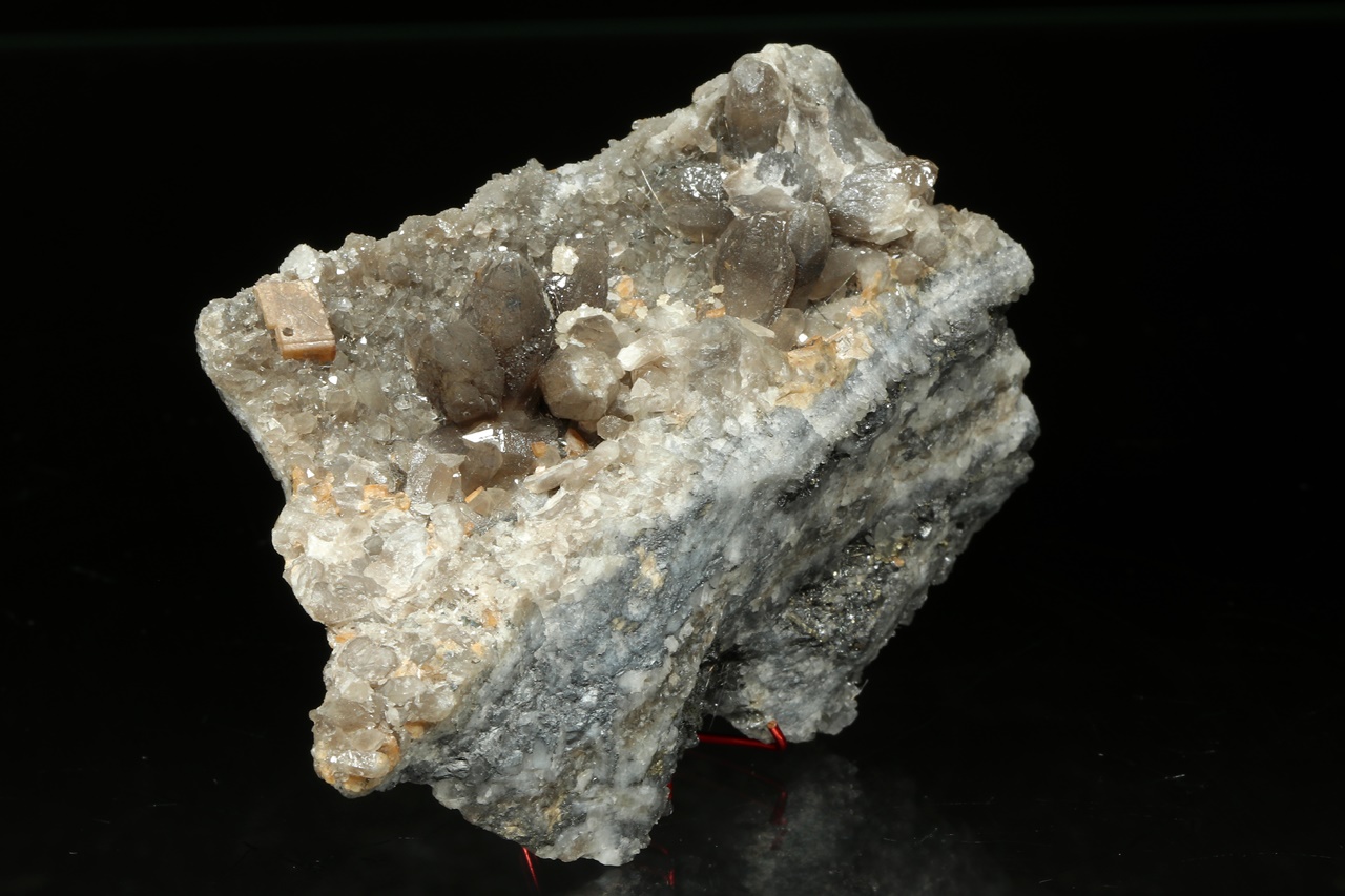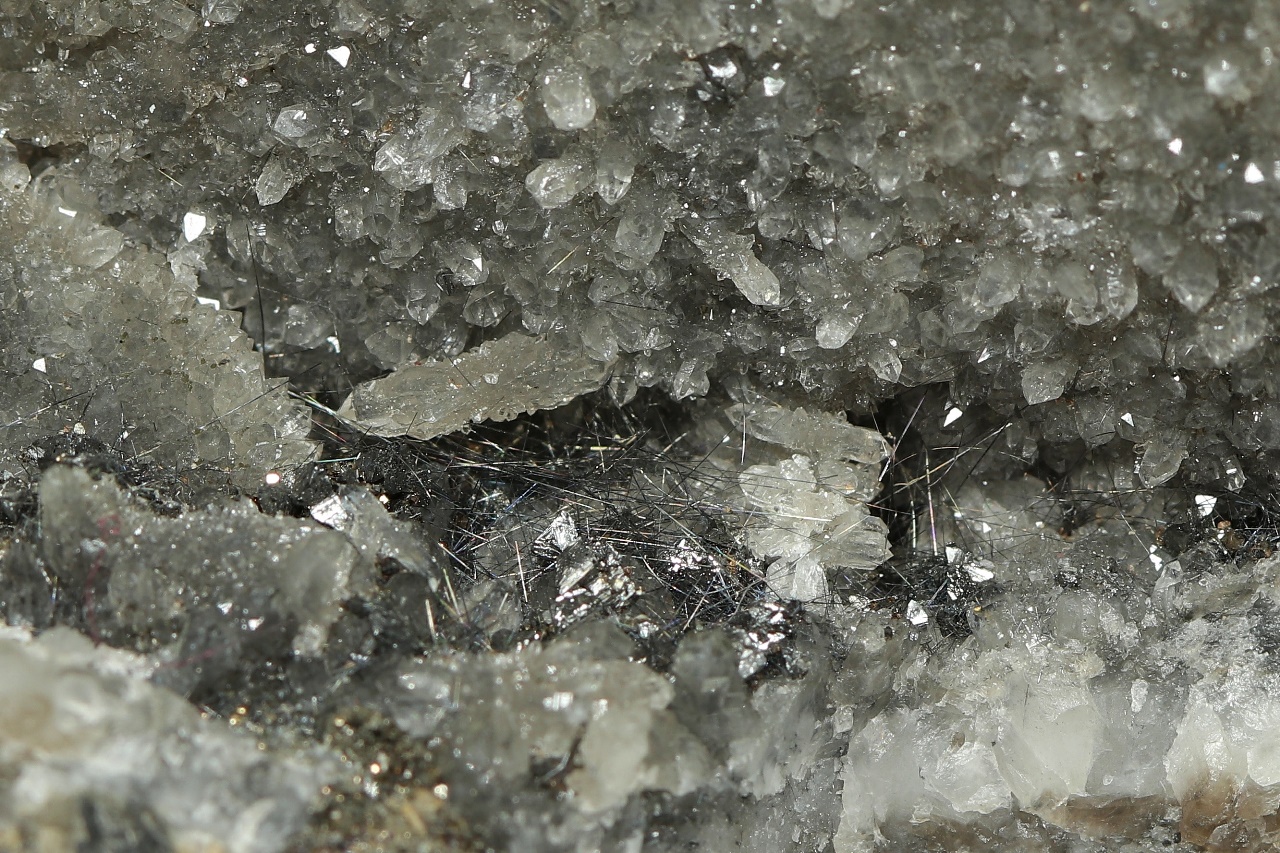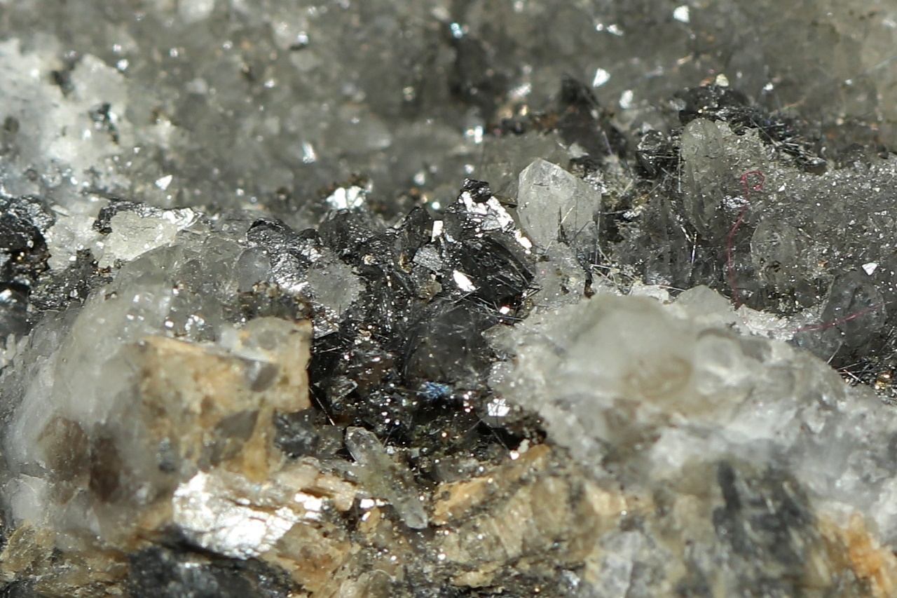 Two-sided sample, where on one side 1 cm quartz crystals of atypical brown color can be observed with rhombohedral siderite, on the other then needles of boulangerite and crystals of black tetrahedrite.
