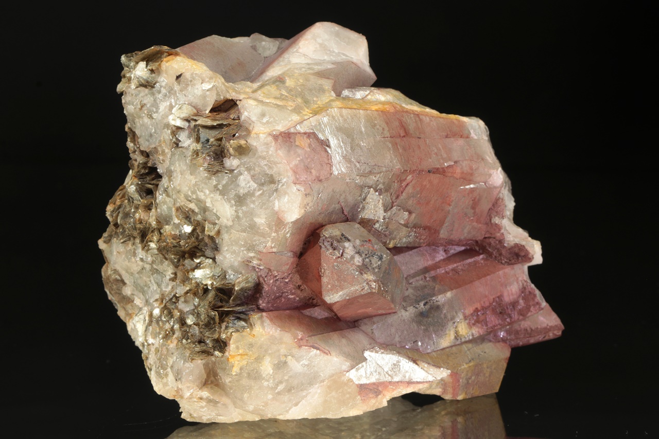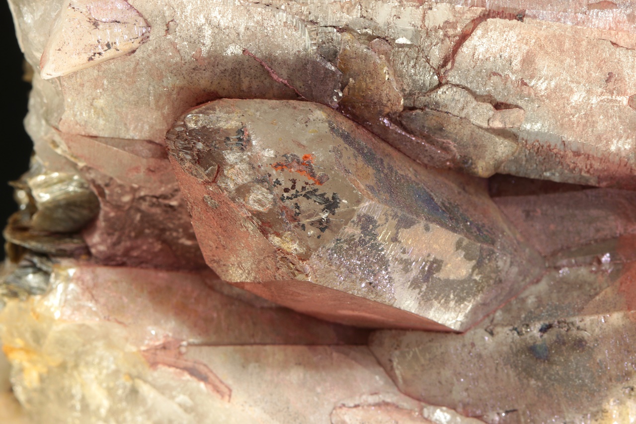 Quartz crystals overgrown with red Hematite. On the left side of the sample, there are crystals of Cinvaldite. The quartz projecting into space is 3 cm large.