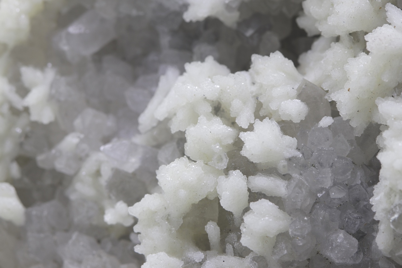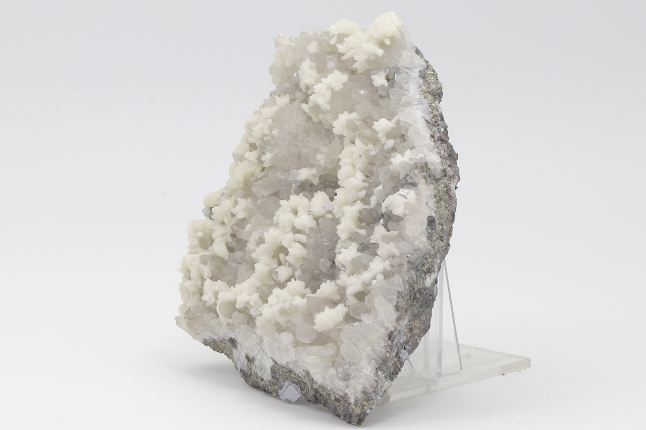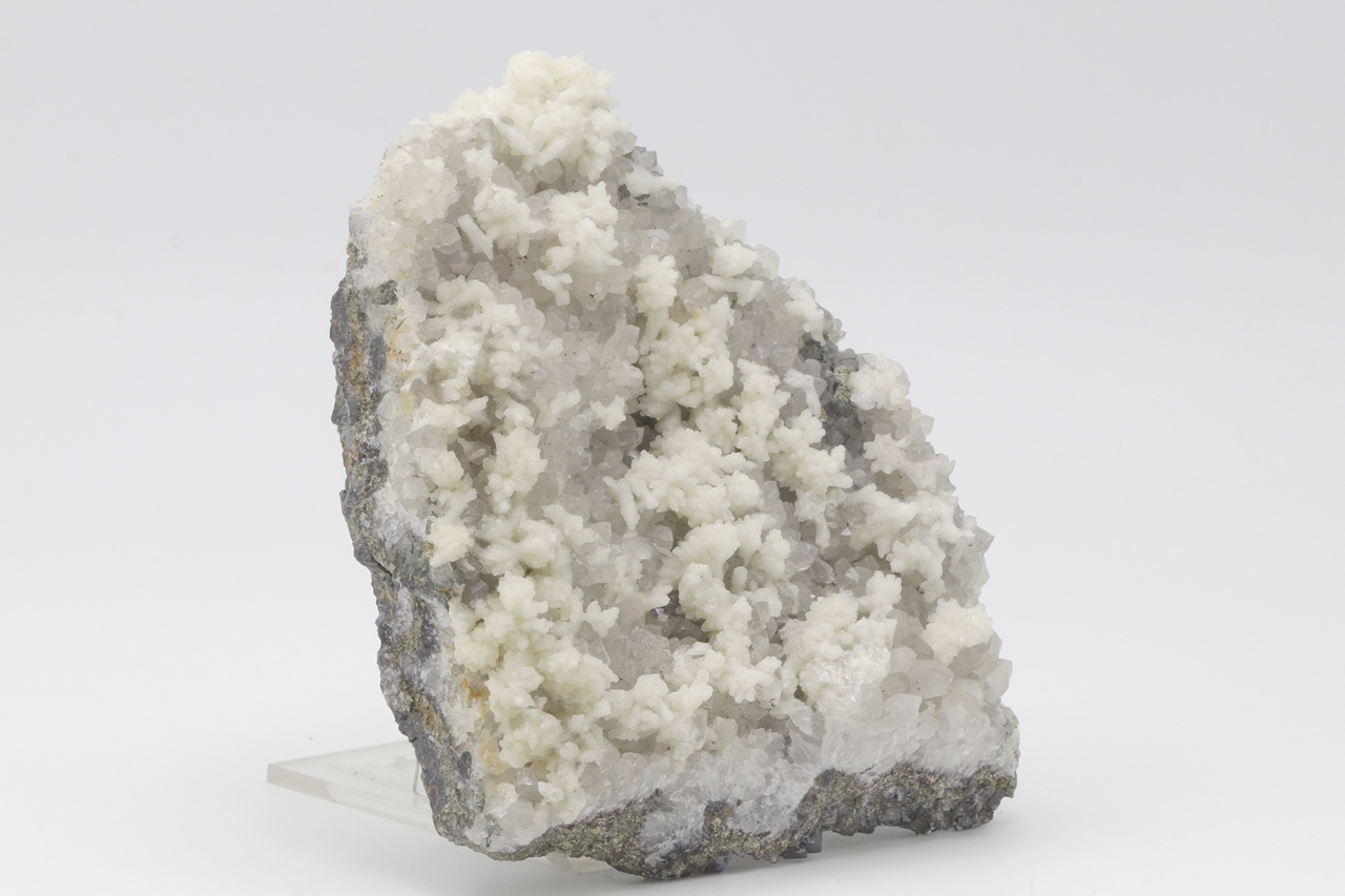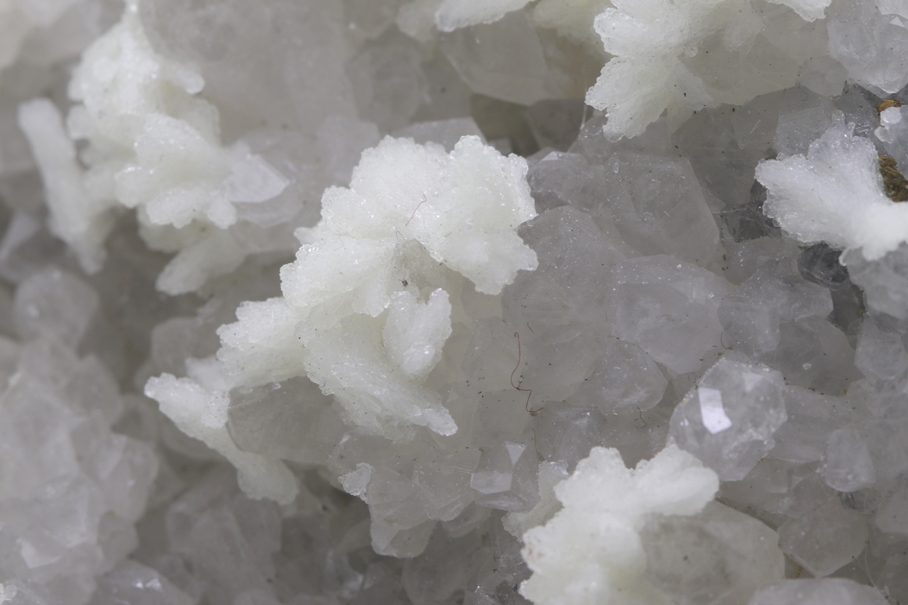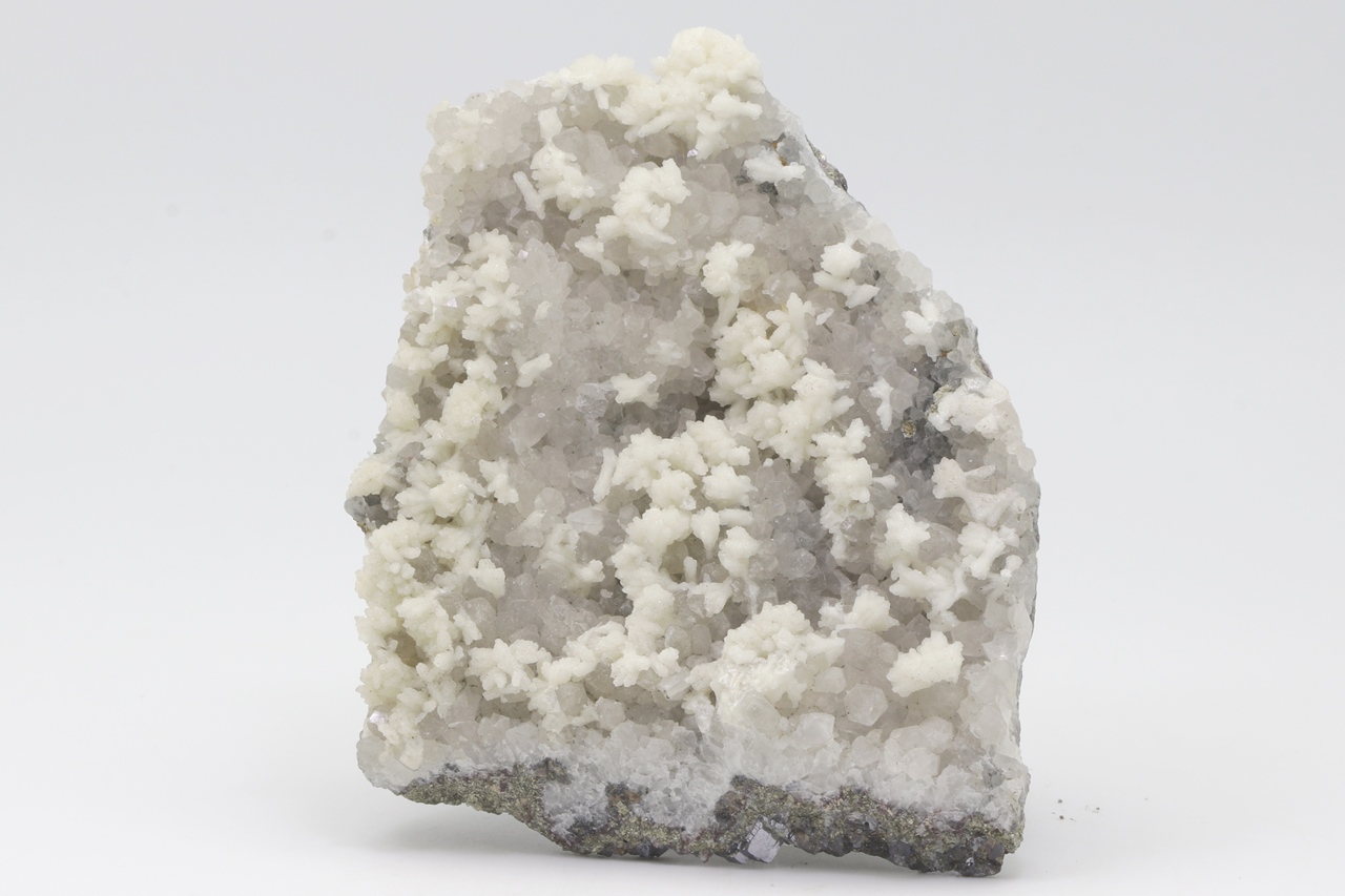 Druse of quartz crystals overgrown with white dolomite aggregates.
