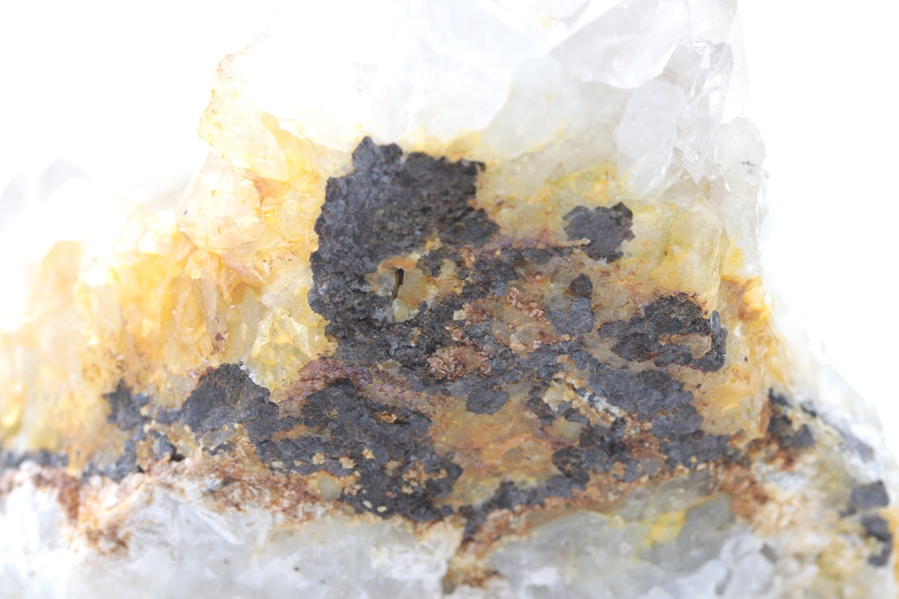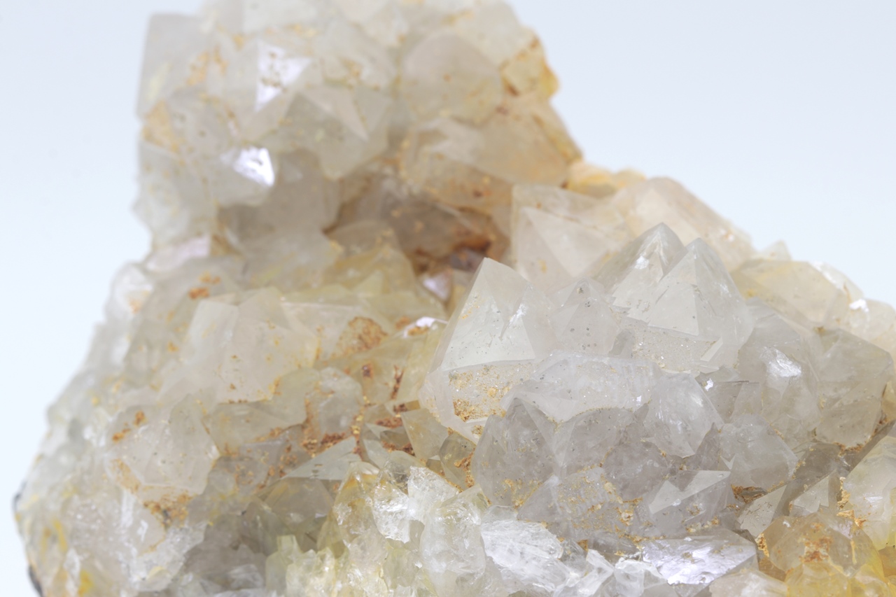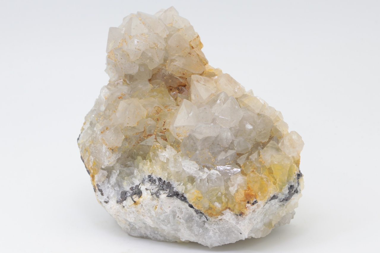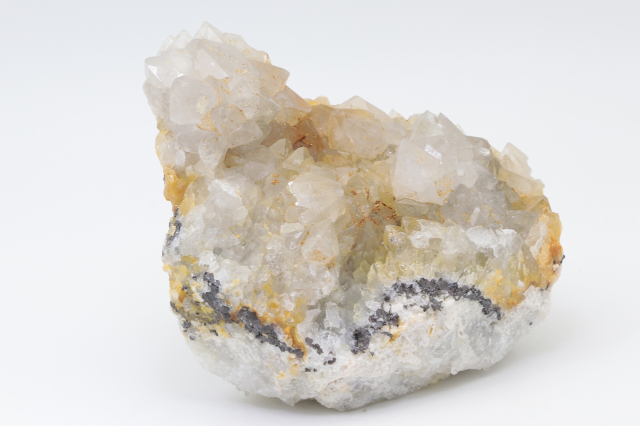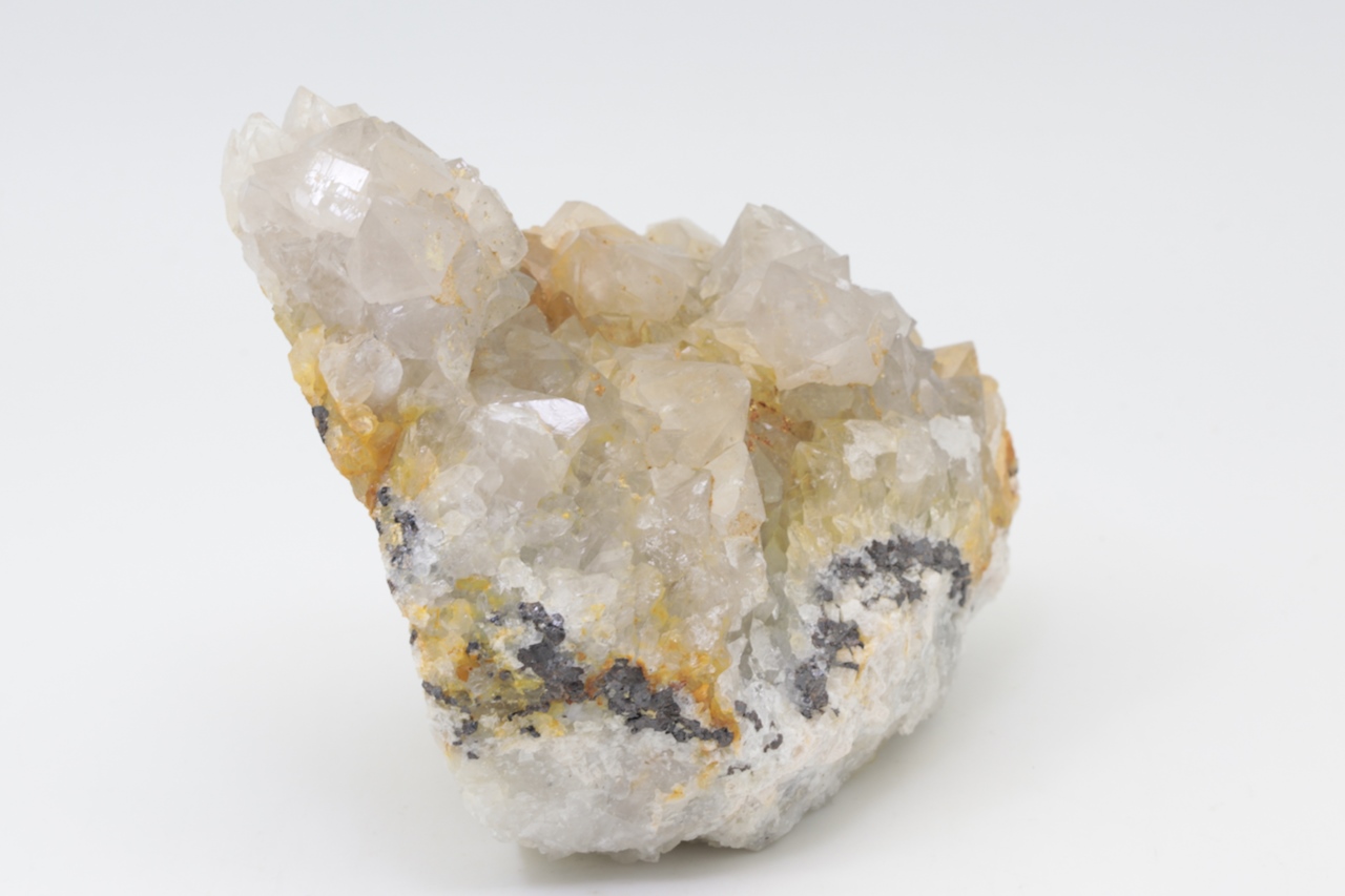 Beautiful and aesthetic specimen of transparent, vitreous luster quartz crystals. The individual crystals reach sizes up to 3 cm. In the lower part of the specimen, there are also irregular, adamantine luster, metallic gray aggregates and grains of sphalerite. This is a nice specimen of quartz from the Czech locality Stříbro.