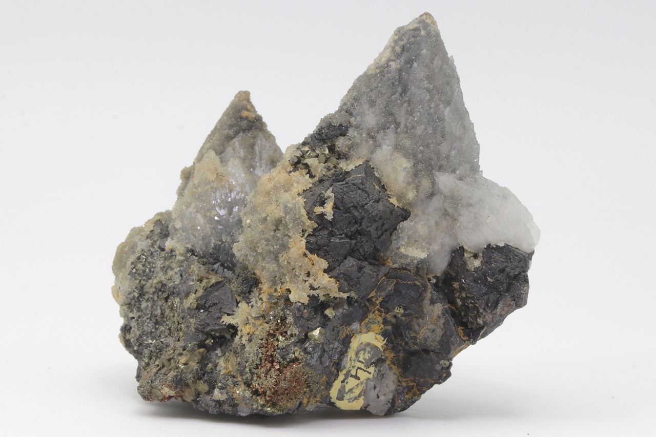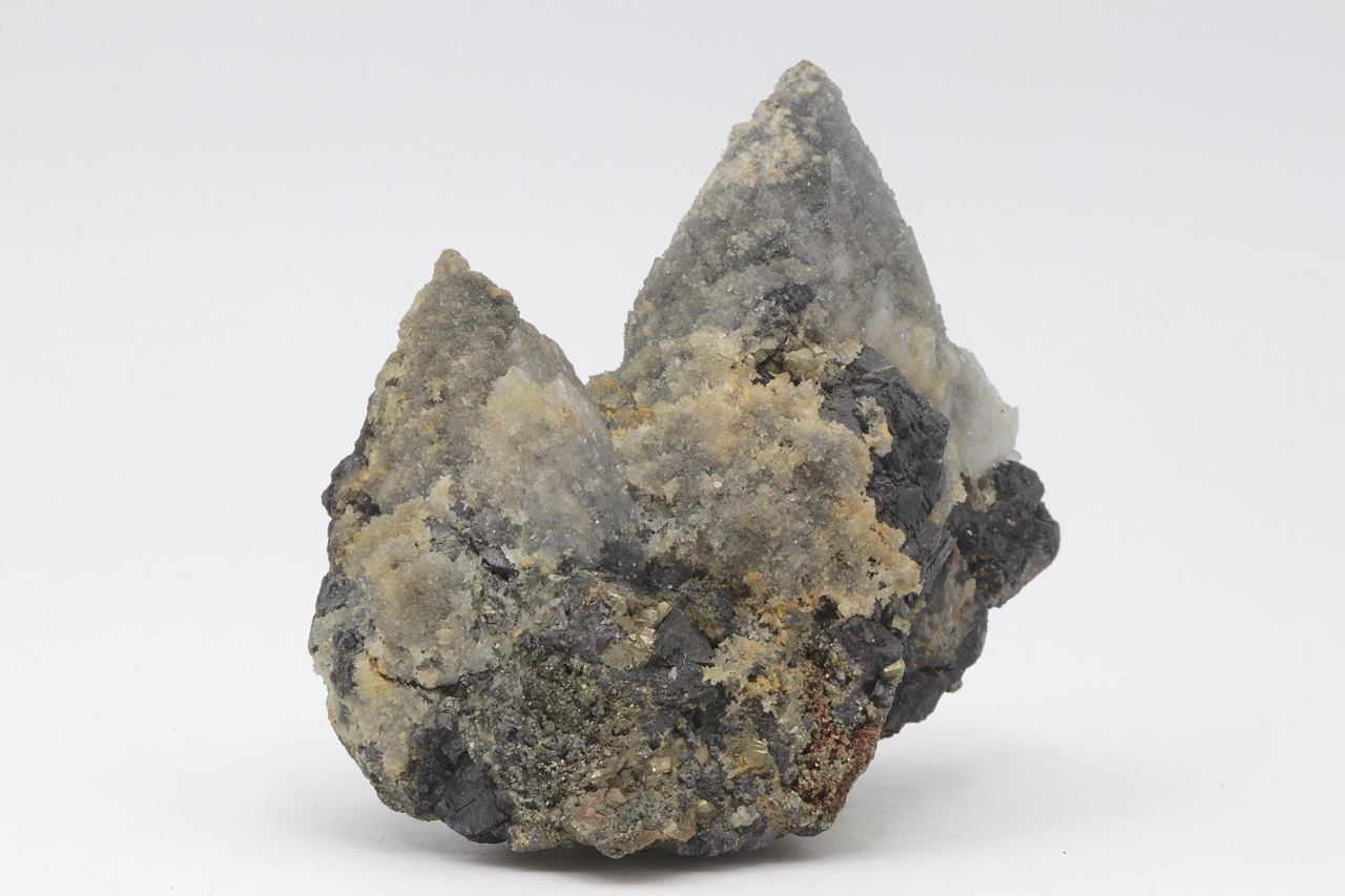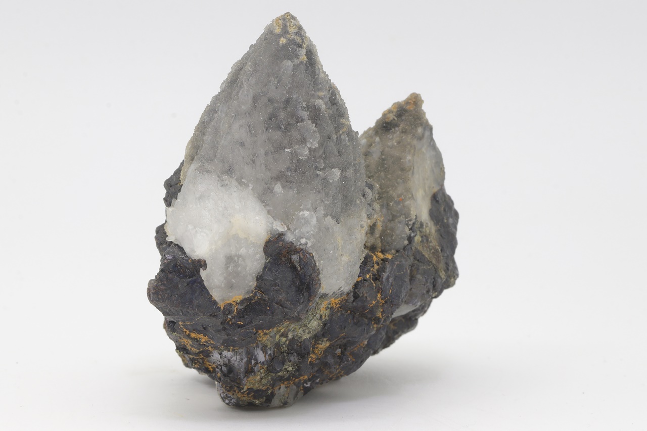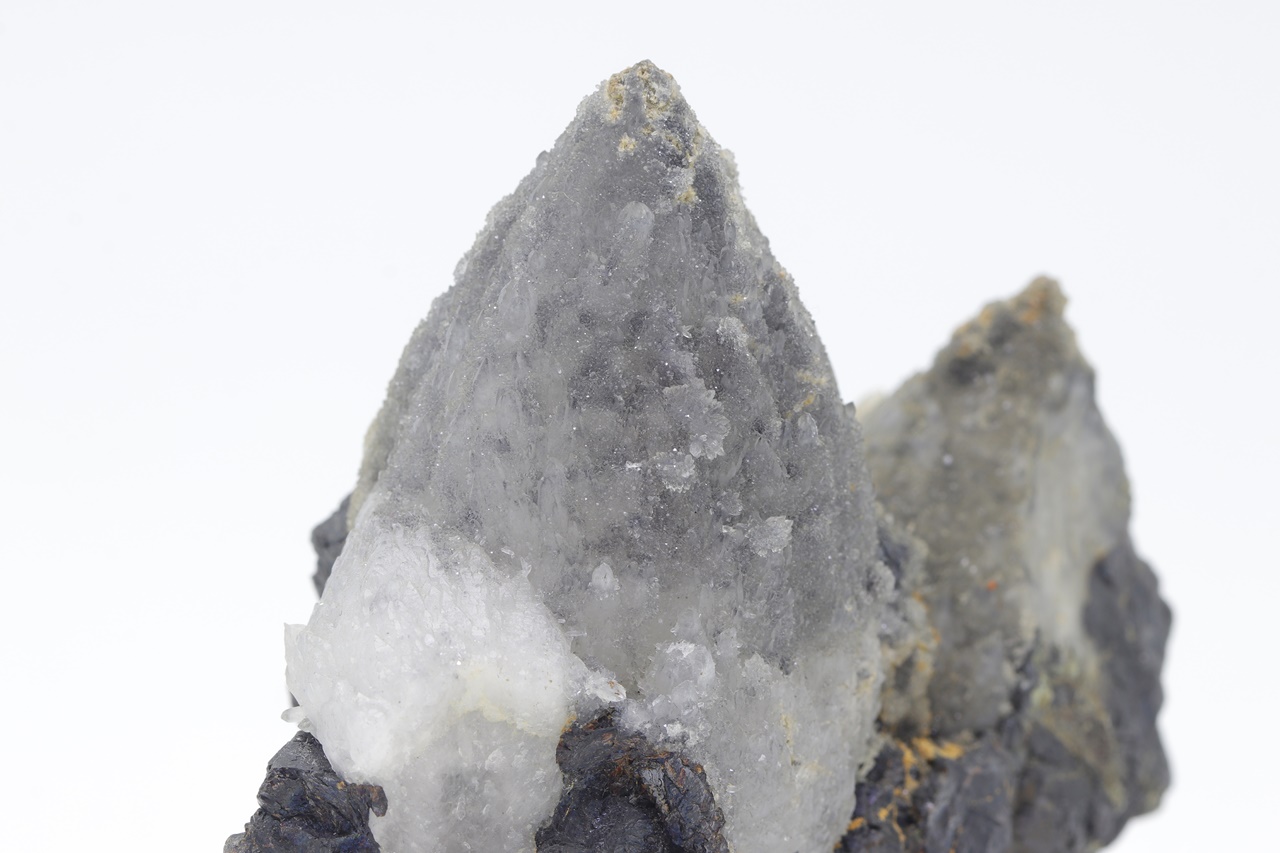 Two large quartz crystals, overgrown with smaller hypoparallel quartz crystals, on a base consisting of sphalerite.