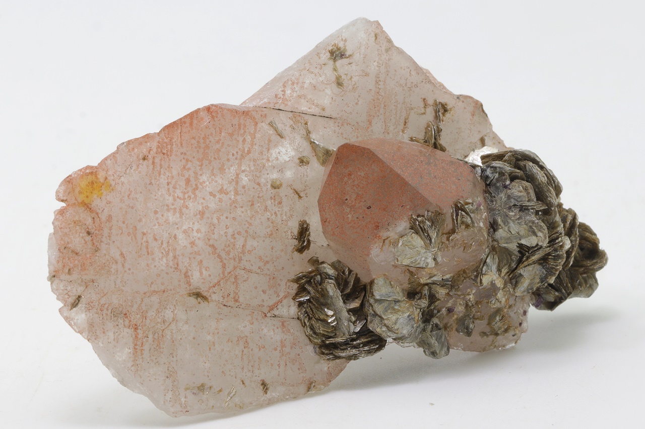 Plováček křemene porostlý tabulárními krystaly cinwalditu.Menší krystal křemene je 4 cm velký.