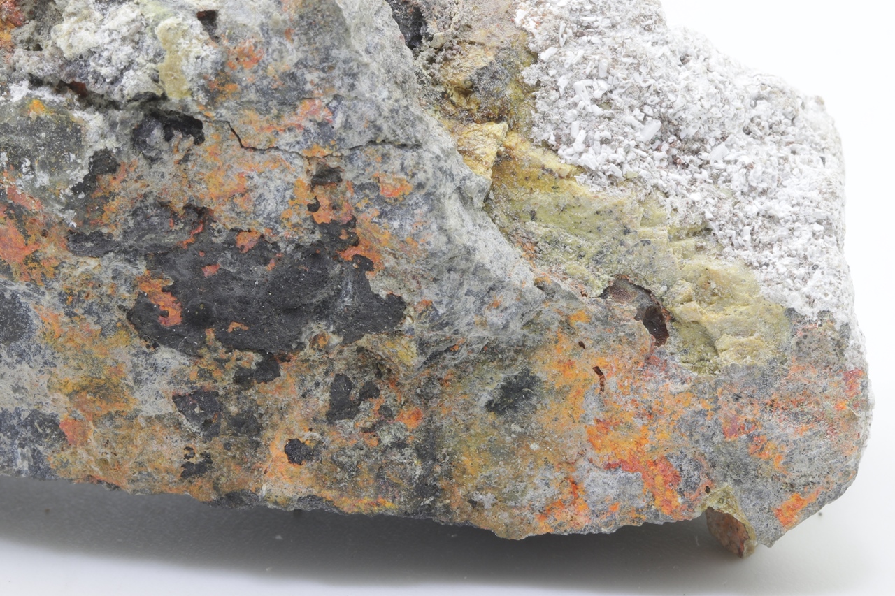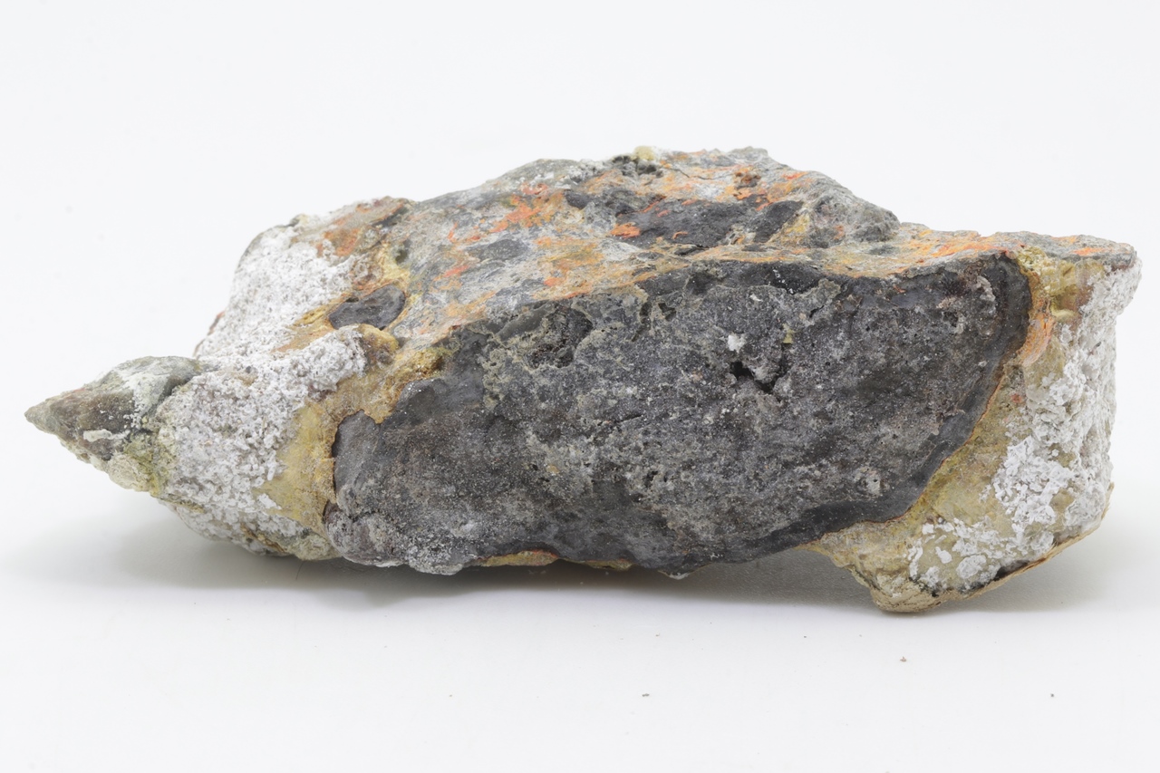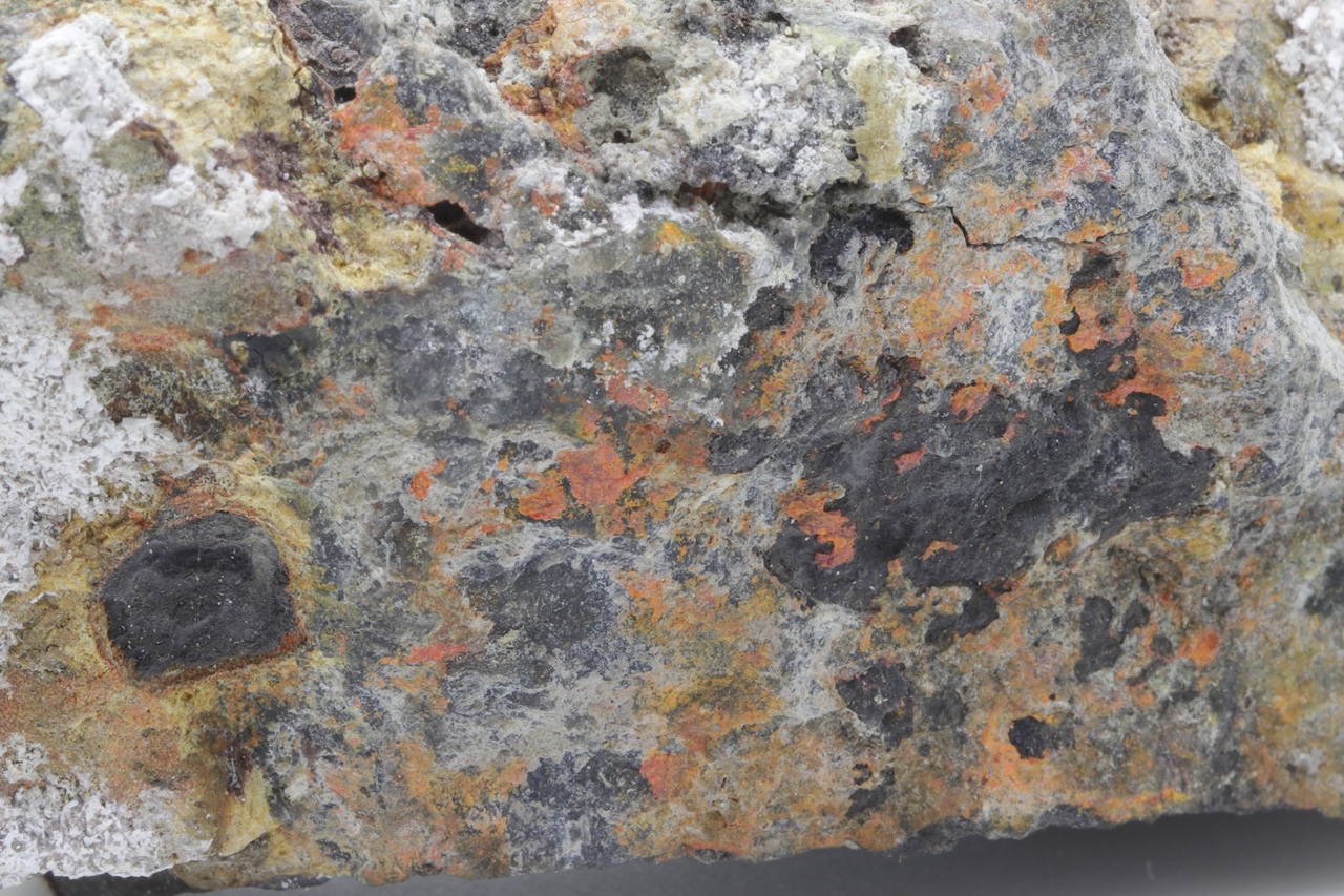 Orange realgar growths on black arsenic.