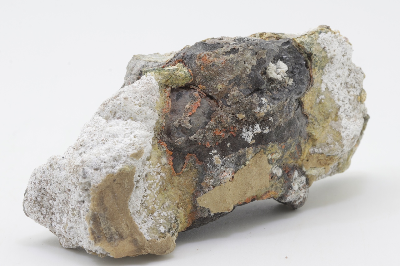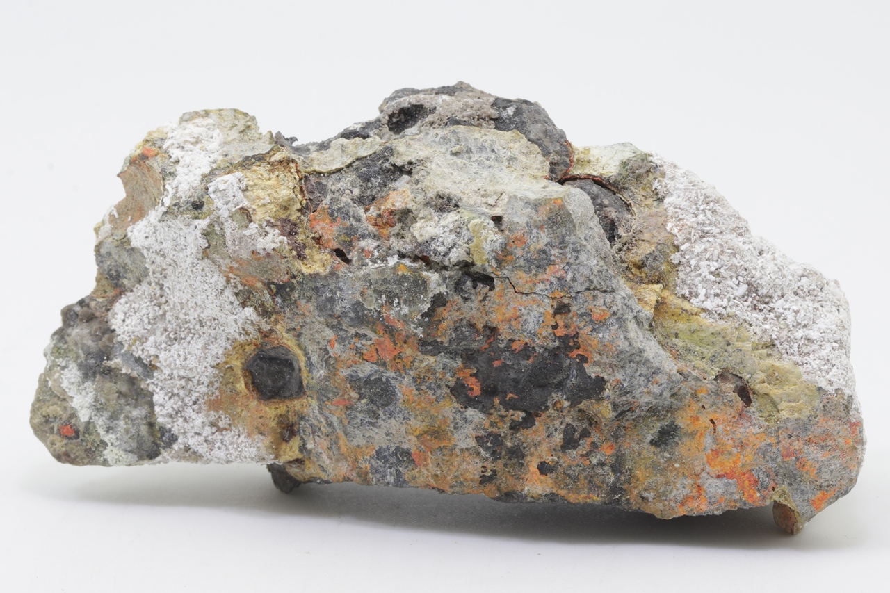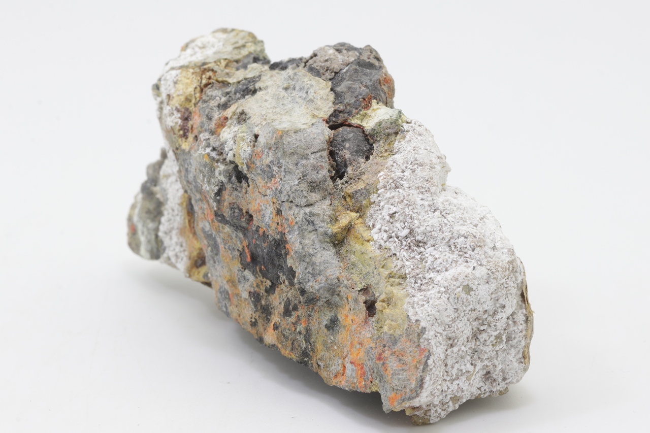 Orange realgar growths on black arsenic.
