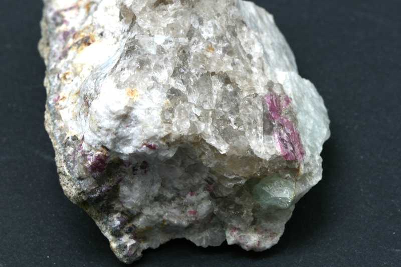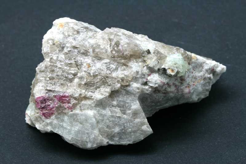 Specimen of pegmatite with rare tourmaline – liddicoatite and borate rhodizite from Madagascar. The size of the light blue rhodizite is 8 mm.