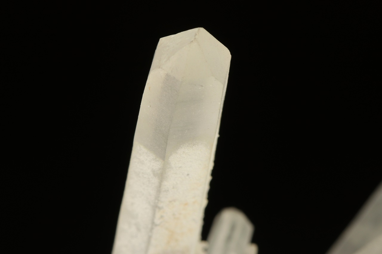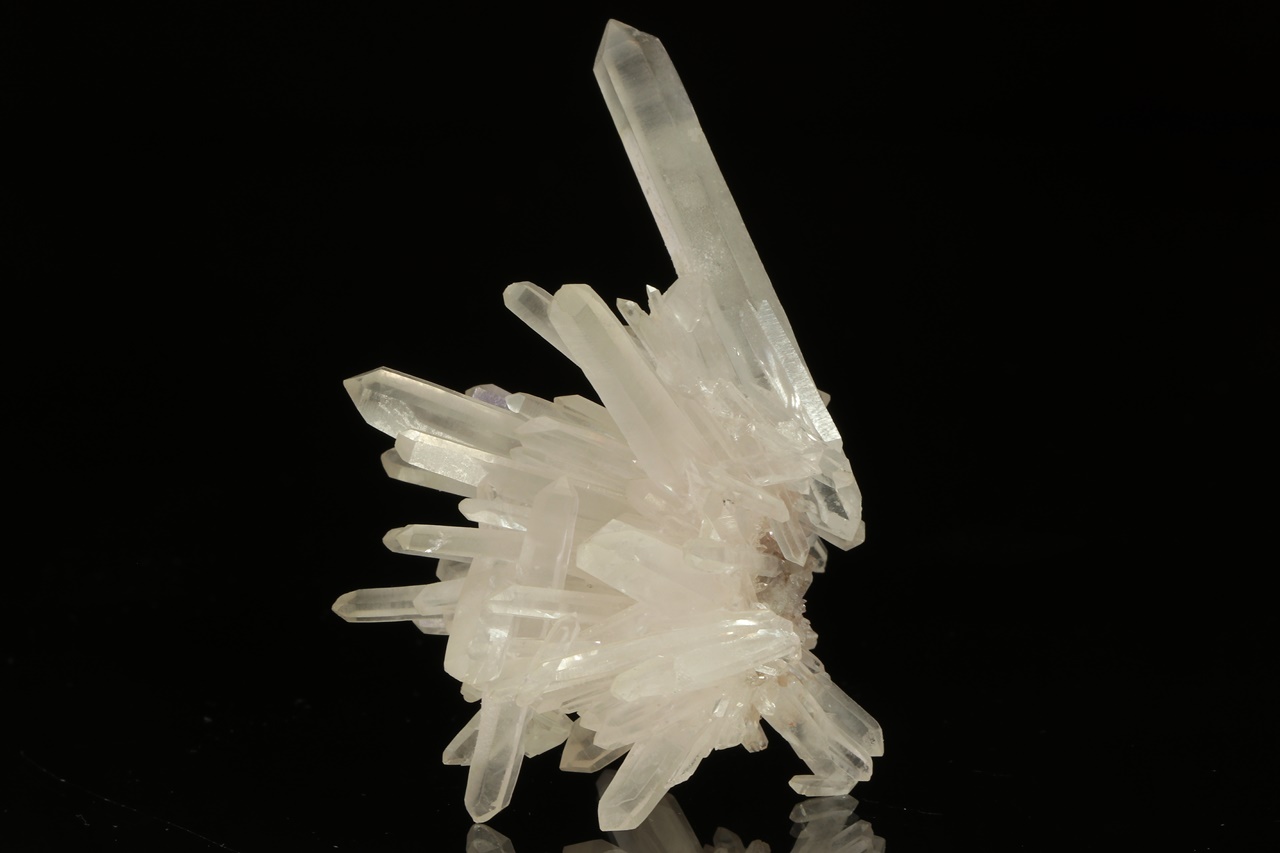 Druse of elongated rock crystals radially grown into space. The largest crystal, double-sided terminated, is 6 cm big.