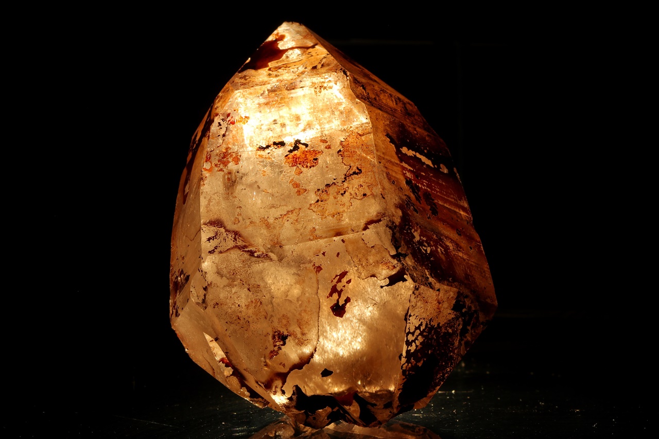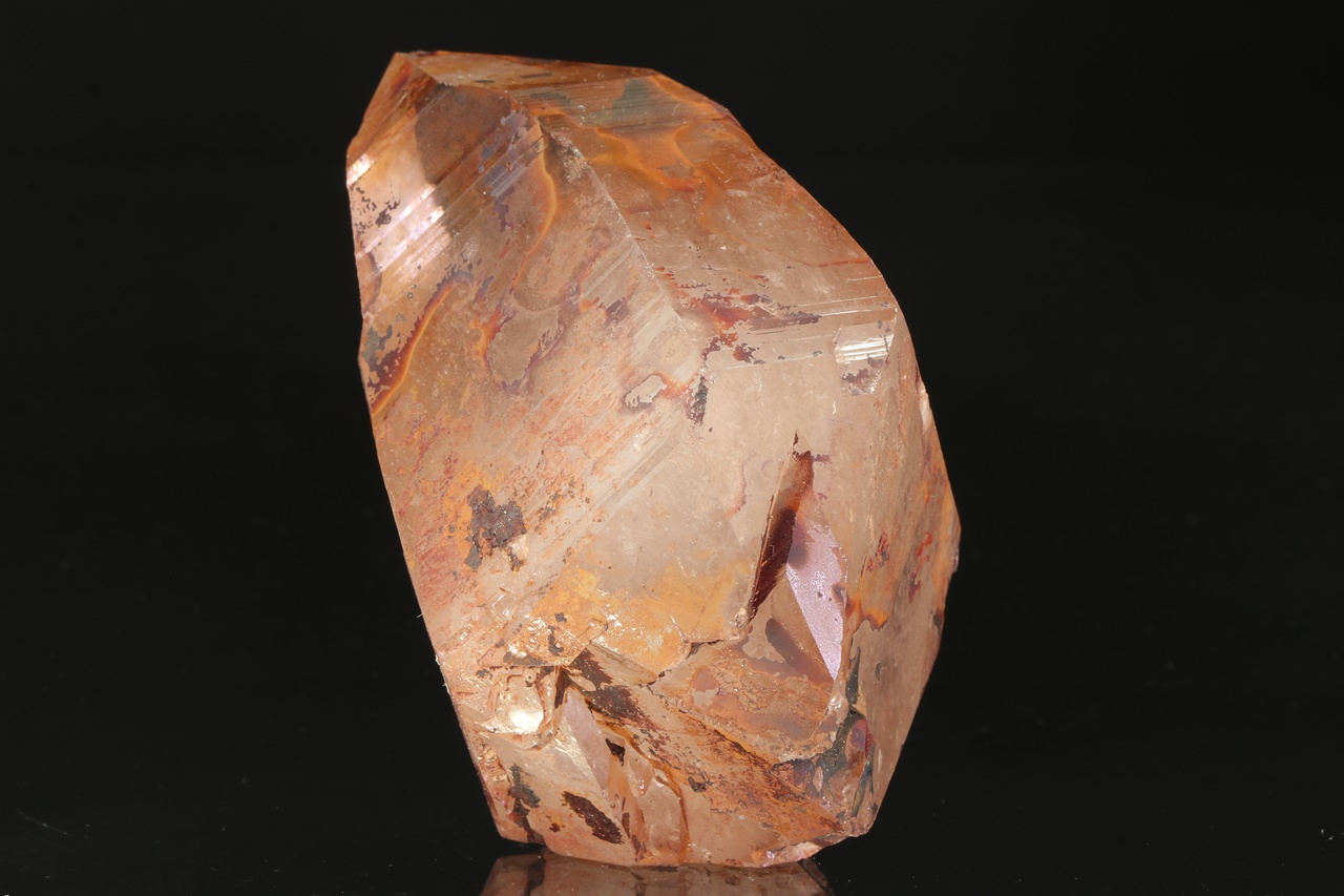 Double-terminated crystal of pure quartz coated with iron oxides.