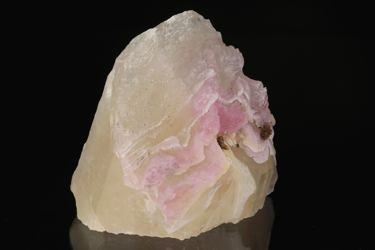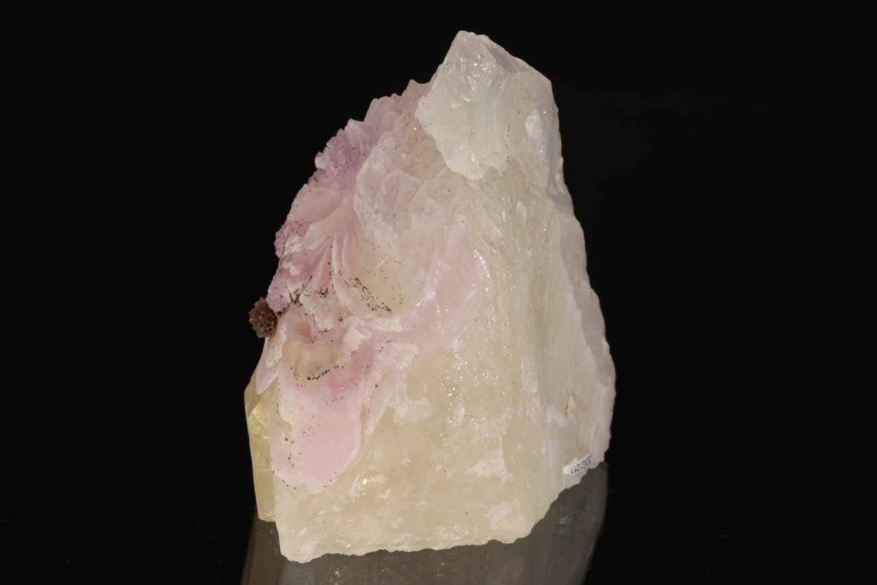 Crystalized rose quartz growing on an older crystal with radial aggregates of Eosphorite. The larger aggregate is 8 mm in size.