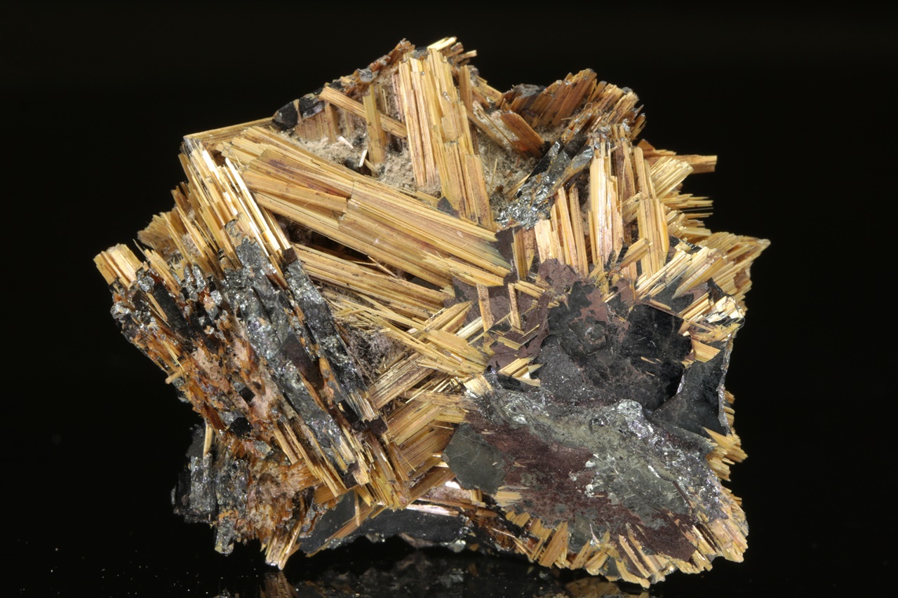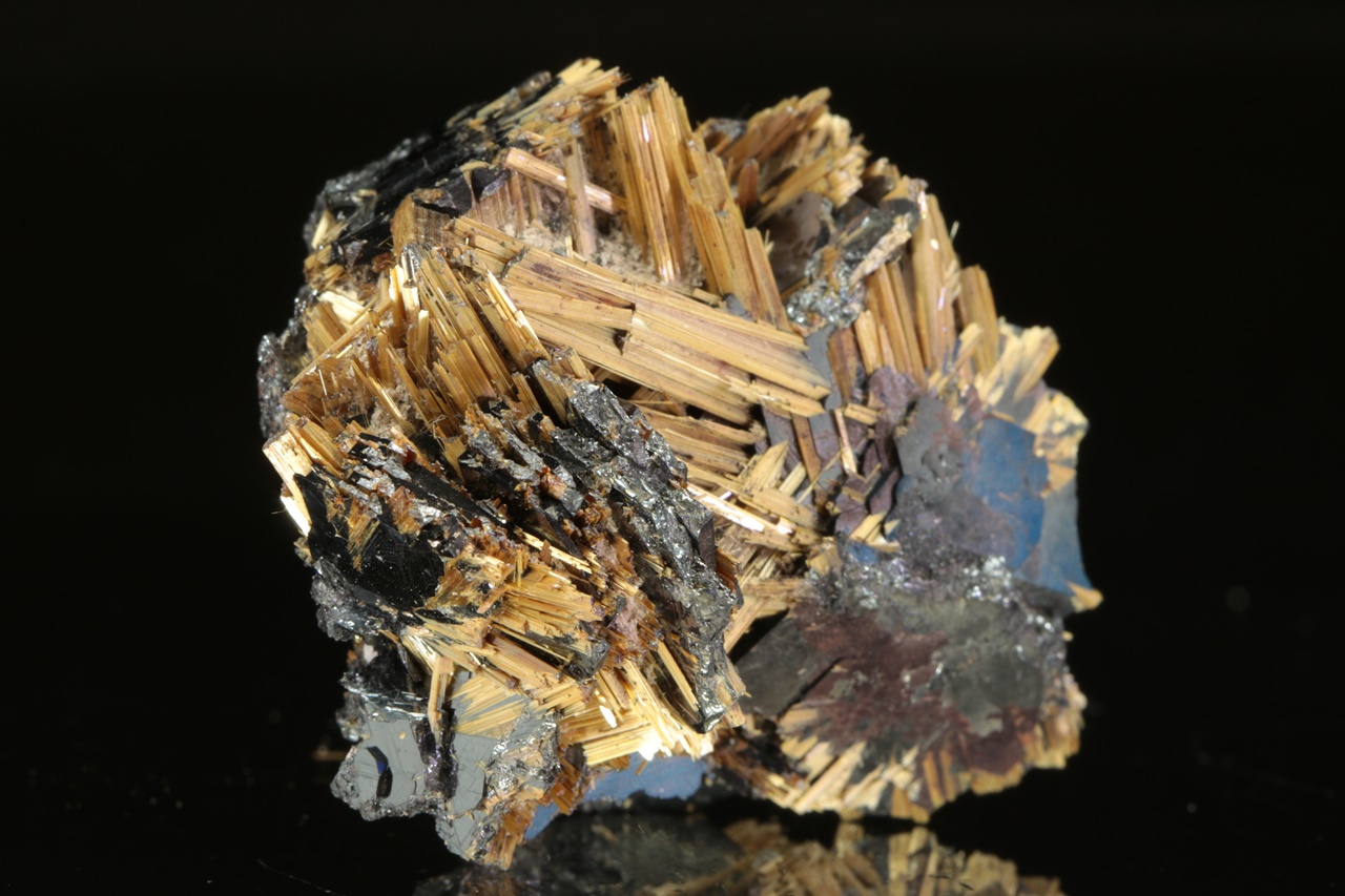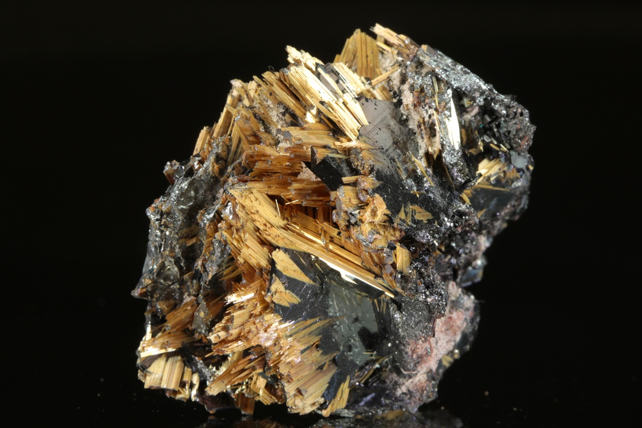 A beautiful specimen of golden rutil needles growing out of a black shiny hematite. The longest rutil needles are 2 cm large.