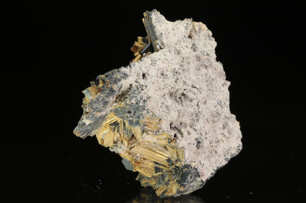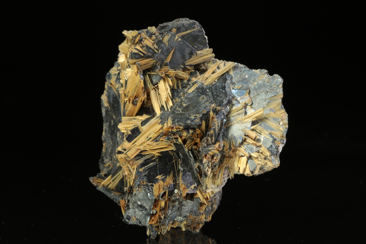 A beautiful specimen of golden bladed rutile sprouting from a black vitreous hematite. The longest rutile blades are 1 cm in size.