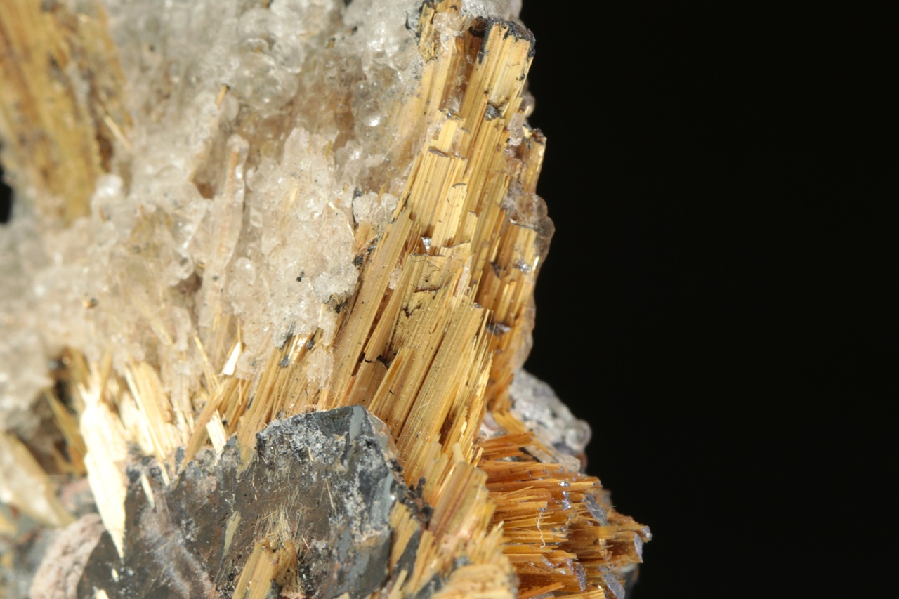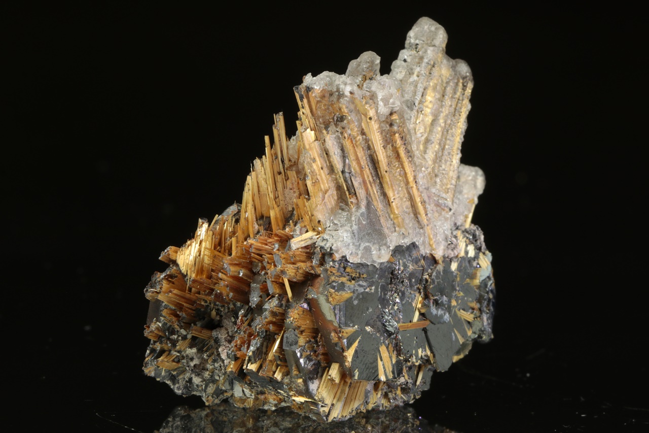 Beautiful specimen of golden rutile stems growing from black shiny hematite, which are partially overgrown with hyalite glowing under UV light. The longest rutile stems are 2 cm in size.
