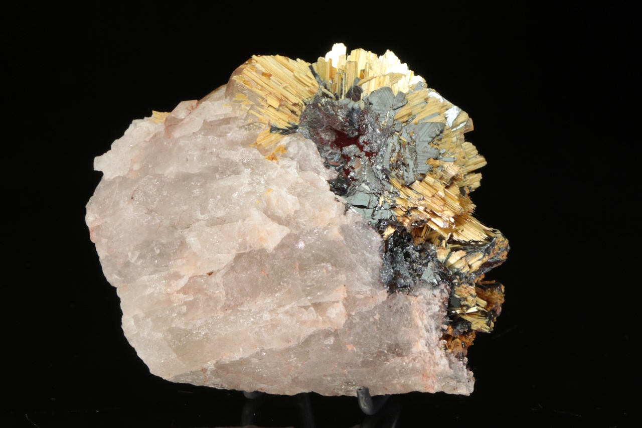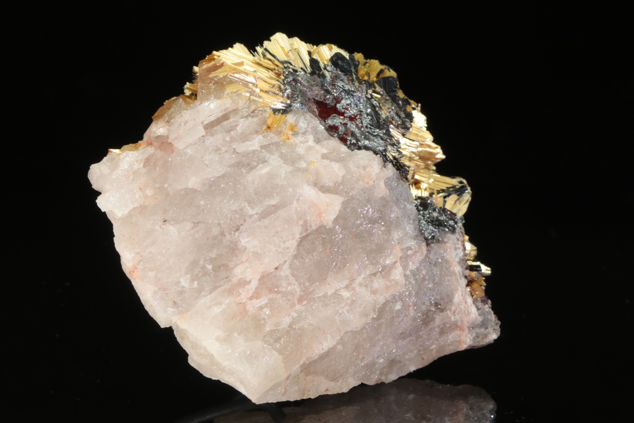 A beautiful specimen of golden rutile stems growing out of shiny black hematite. The longest stems of rutile are 1.5 cm in size.