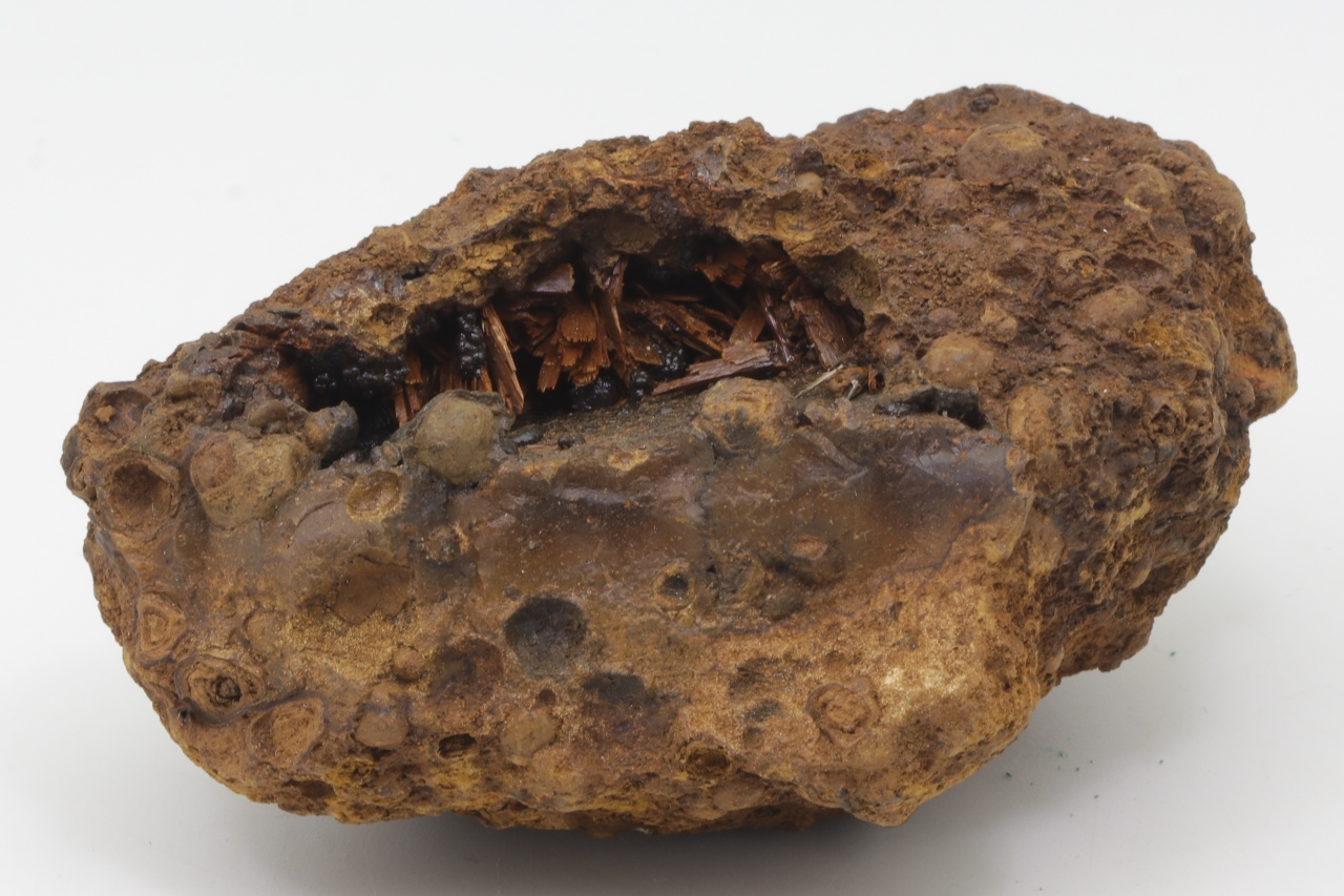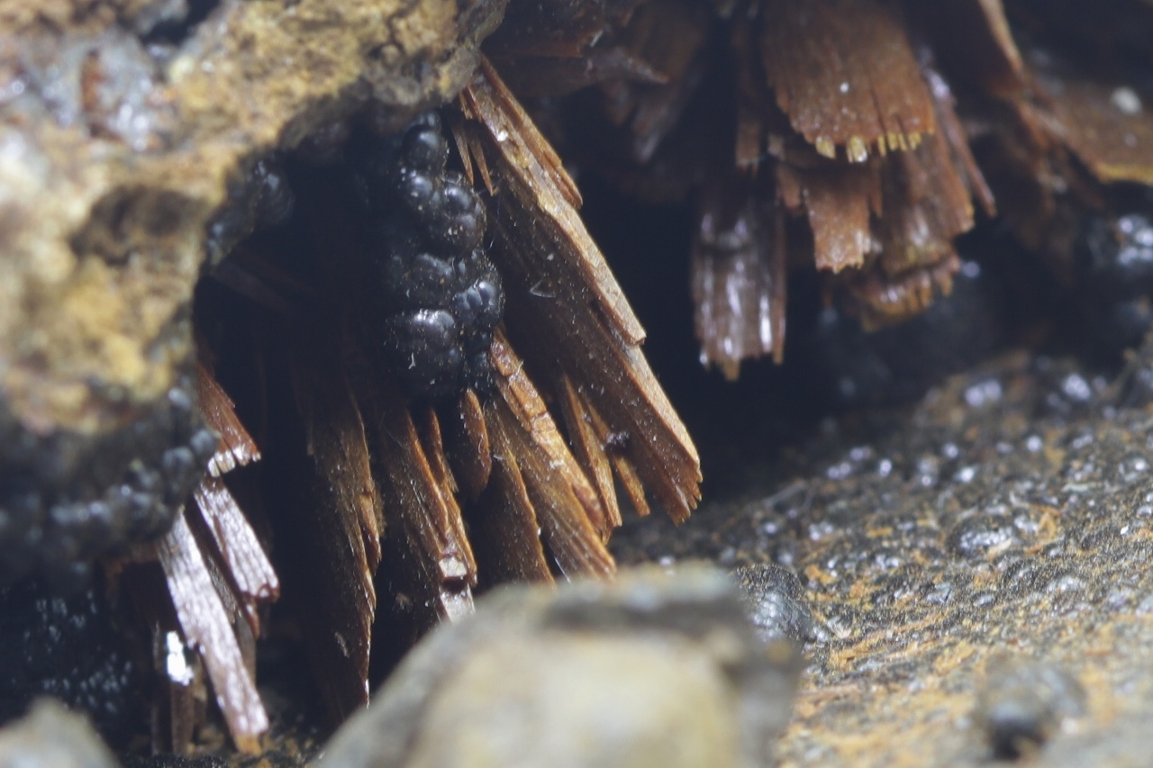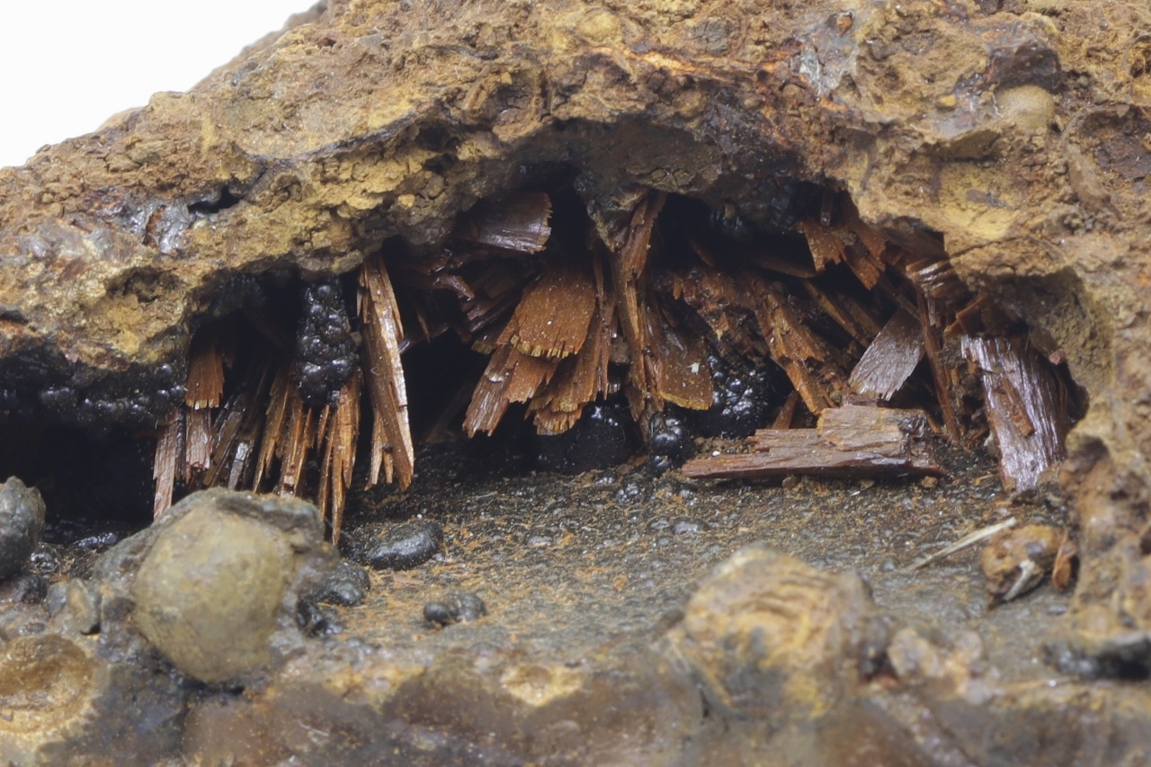 Ocher crystals of the rare iron phosphate grown in a cavity measuring 4 × 2 cm. The largest crystal is 8 mm in size.