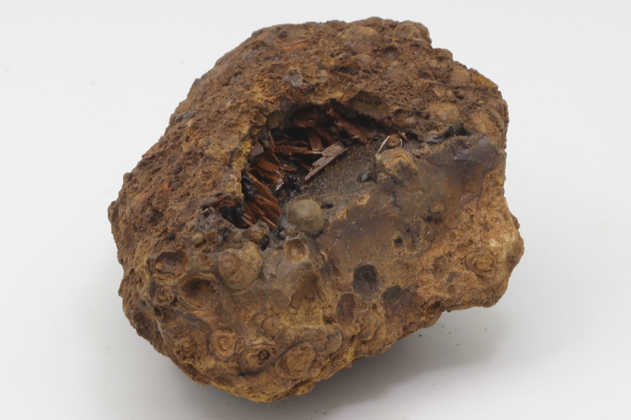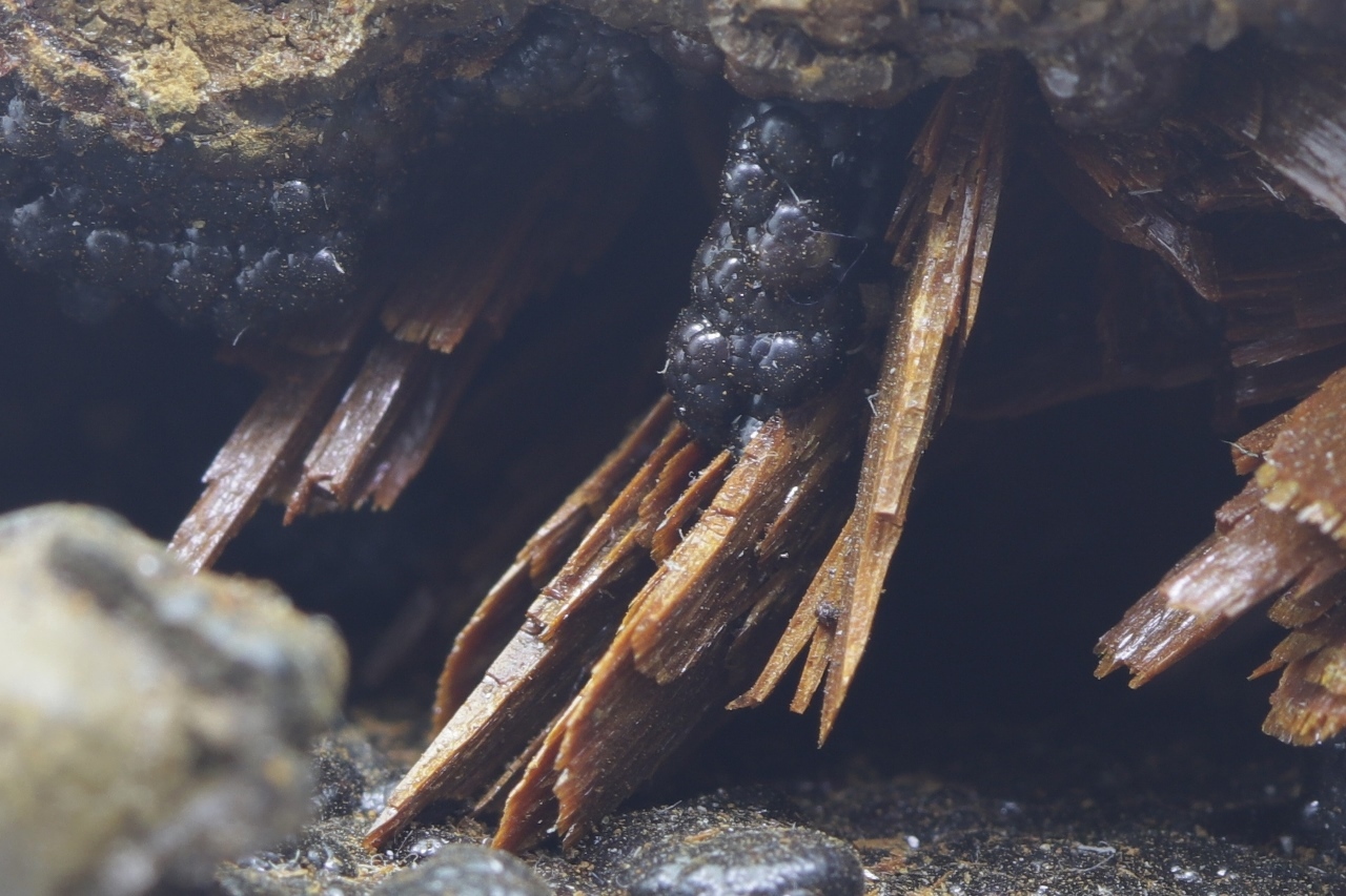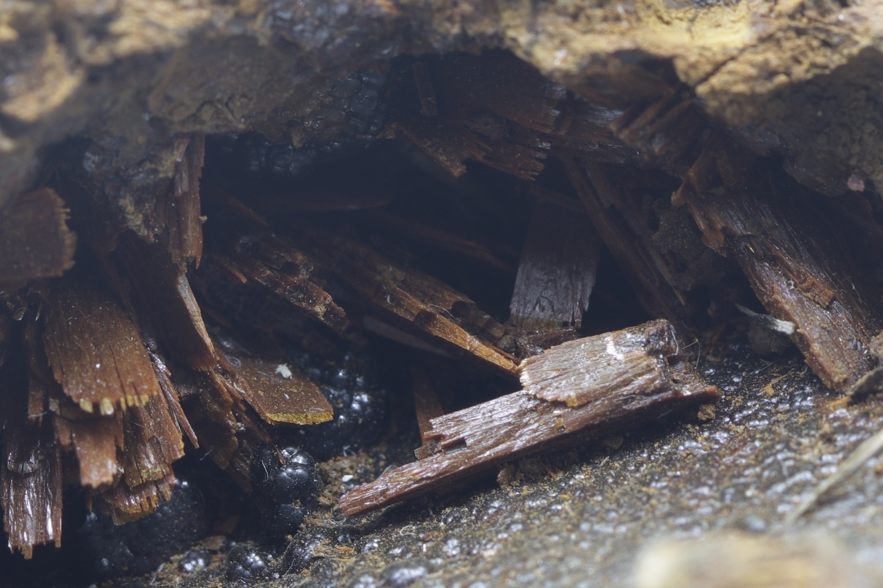 Ocher crystals of the rare iron phosphate grown in a cavity measuring 4 × 2 cm. The largest crystal is 8 mm in size.