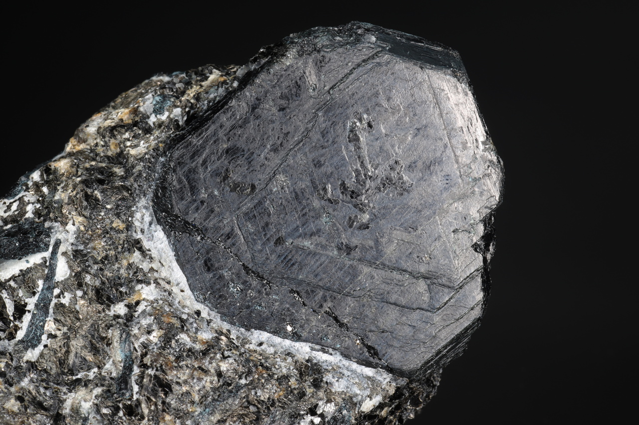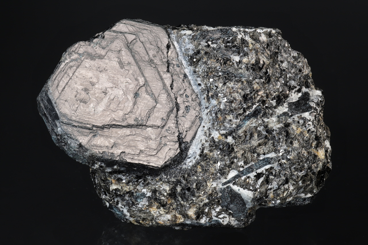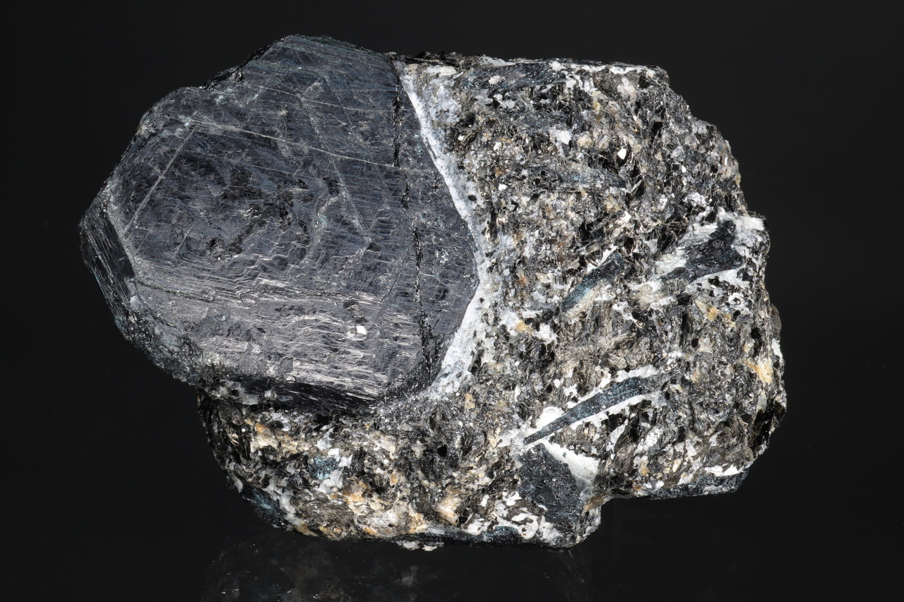 A perfect example of the rare mineral sapphirine in the form of a flat, extremely large crystal from the new discoveries in Madagascar. Sapphirine is a silicate, which at most deposits around the world only forms small grains. It was named for its resemblance to sapphire not only in crystal shape but also in the blue color that is typical for some sapphirines. The offered sample is a flat dark crystal extracted from biotite rock. The size of the crystal is 44 mm, and it is indeed a very large crystal within this mineral species. The crystal is complete; due to a crack in the lower part, it has been gently stabilized in its place so that it would not fall off during preparation. Crystals of sapphirine from the Morafeto deposit are certainly the best and by far the largest crystals of this otherwise systematic mineral in the world. It is a perfect collector’s specimen.