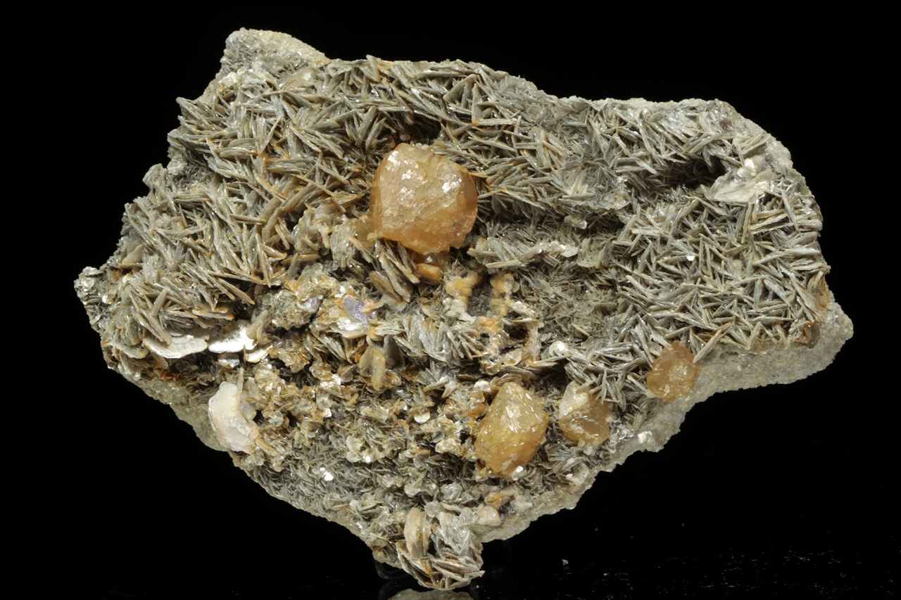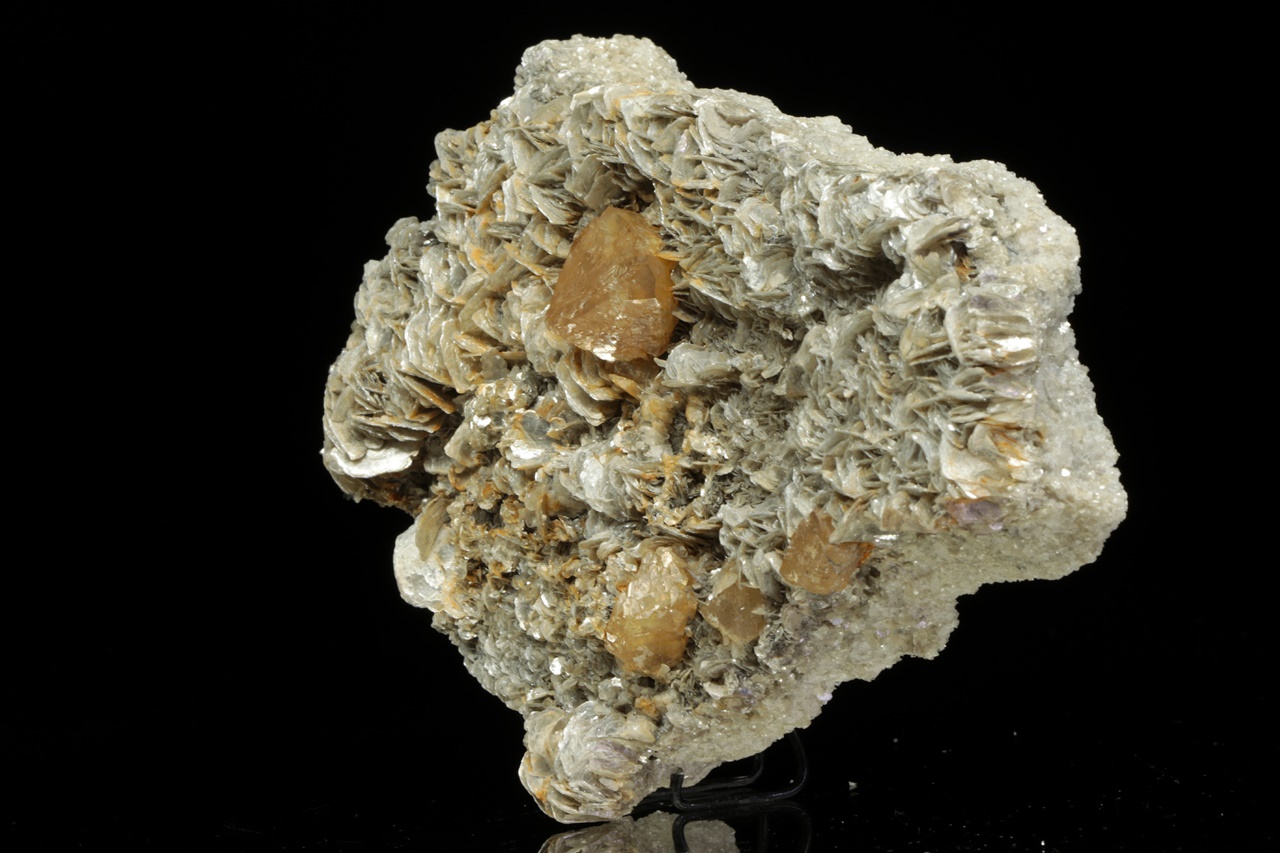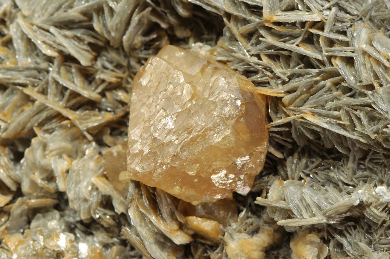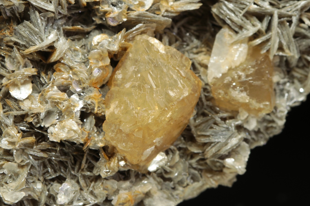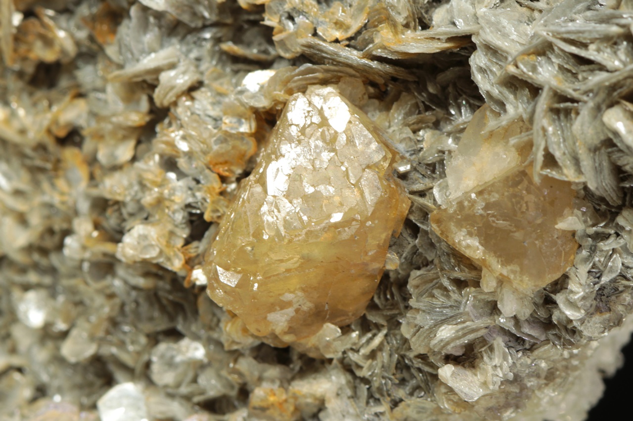 Crystals of shiny honey-colored scheelite up to 2 cm large grown on light muscovite.