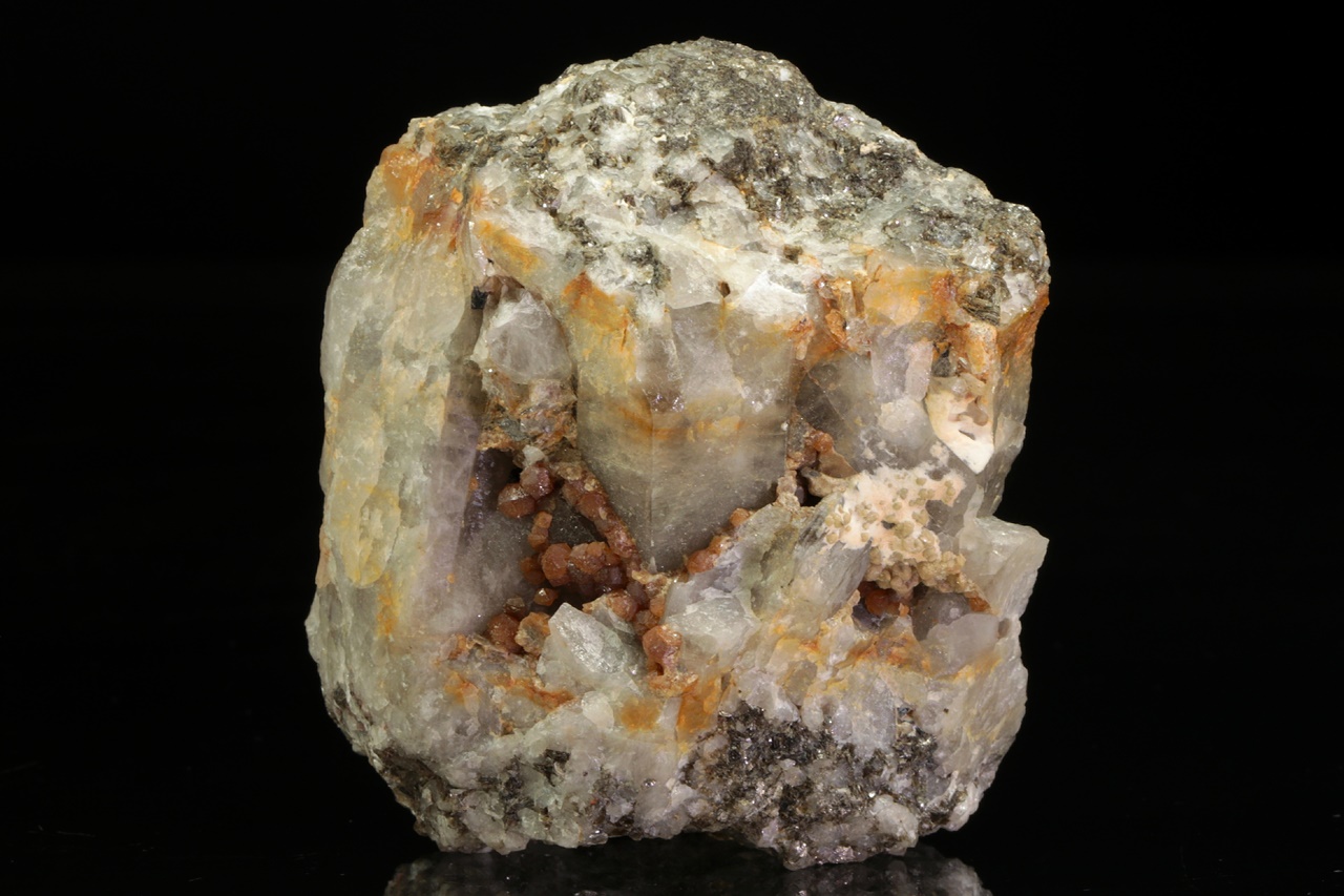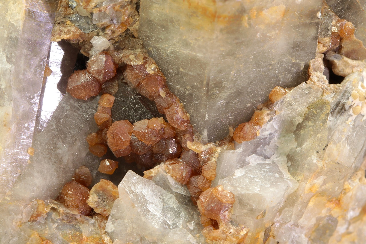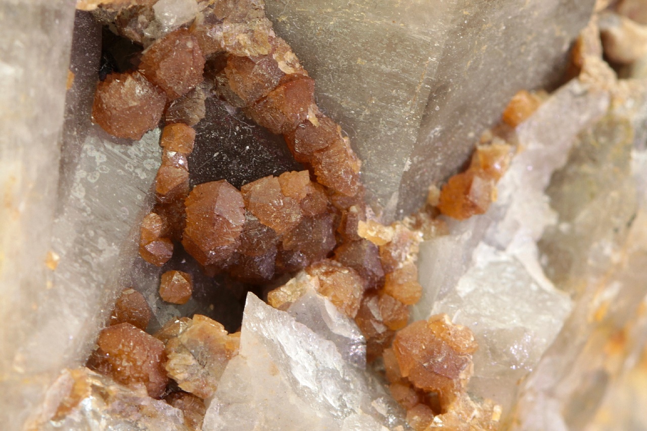 Beige scheelite crystals up to 3 mm large grown in a quartz cavity.