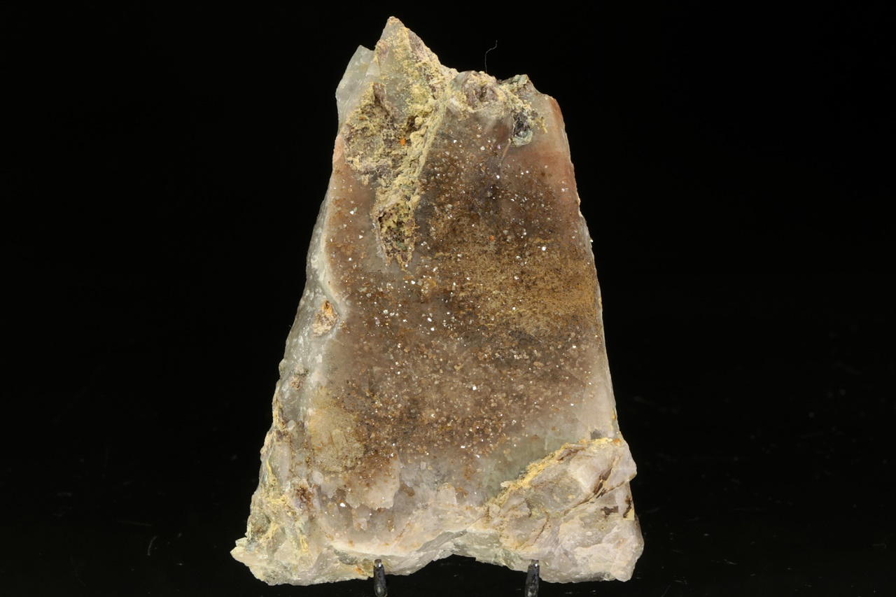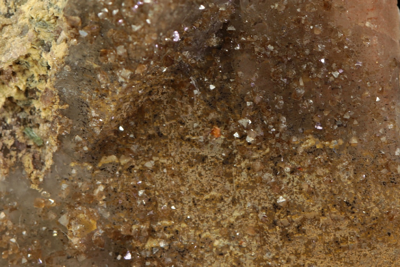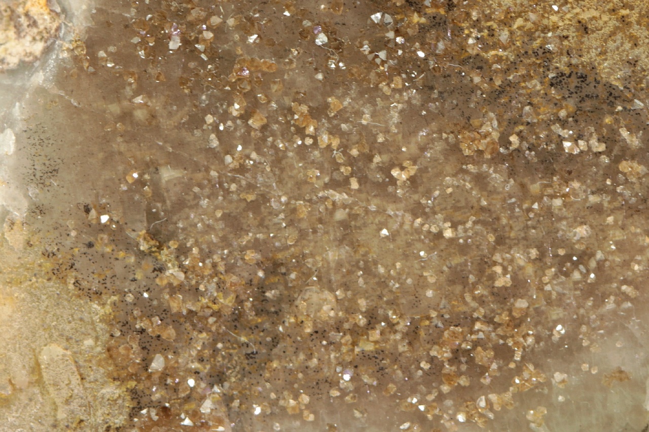 A quartz crystal face richly covered with light beige transparent scheelite crystals. The specimen glows under UV light .