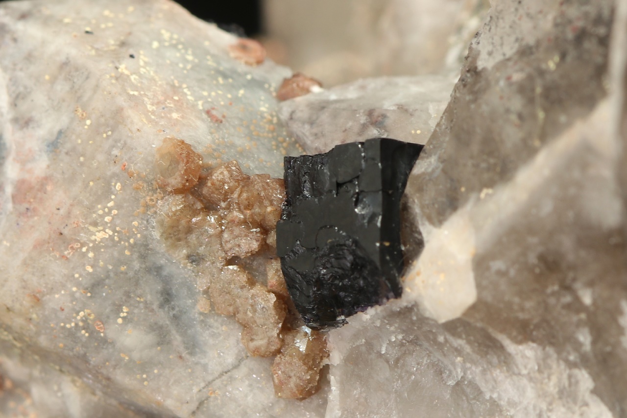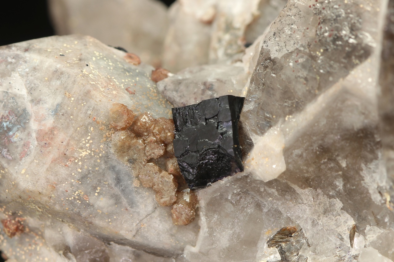 Dark purple Fluorite crystal with beige Scheelite grown on Quartz. The size of the Fluorite is 6 mm.