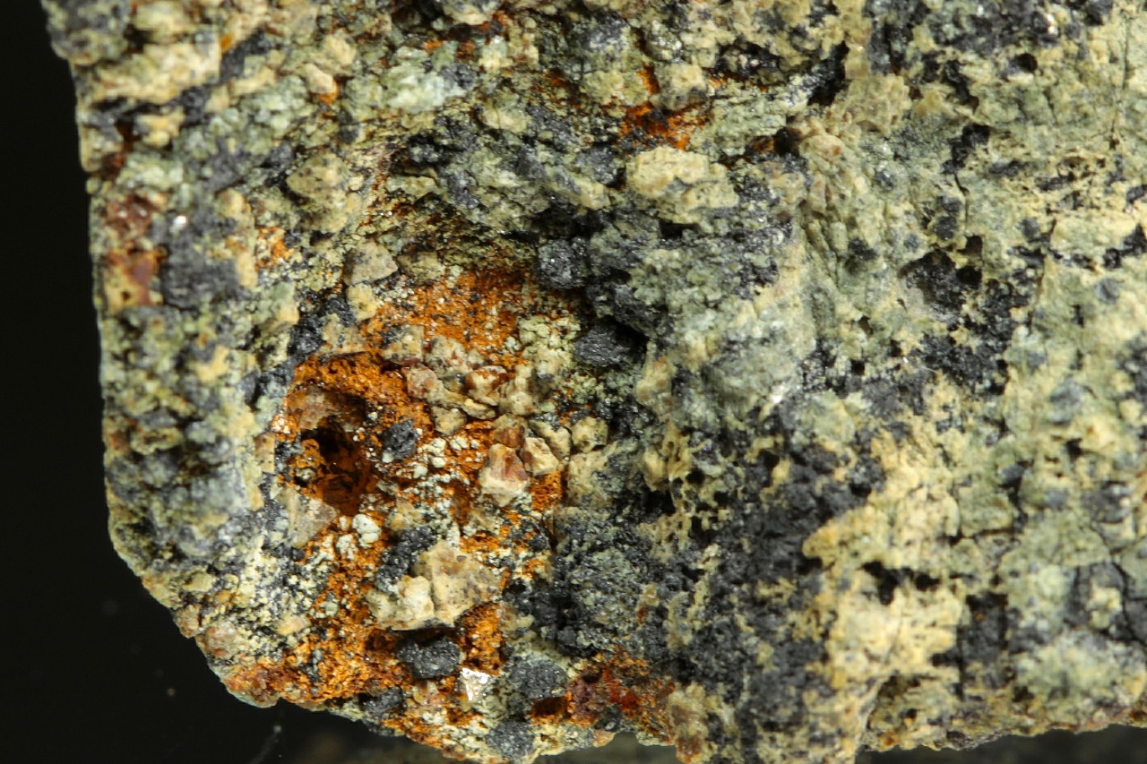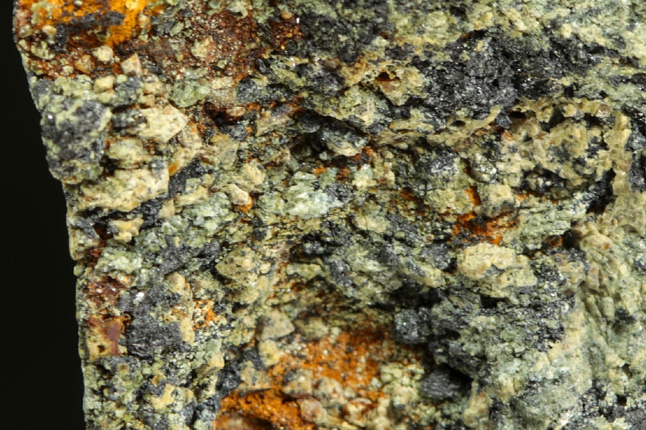 Žluté krystaly a zrna vzácného schoenfliesitu v černém magnetitu. Největší krystaly jsou necelý milimetr velké.