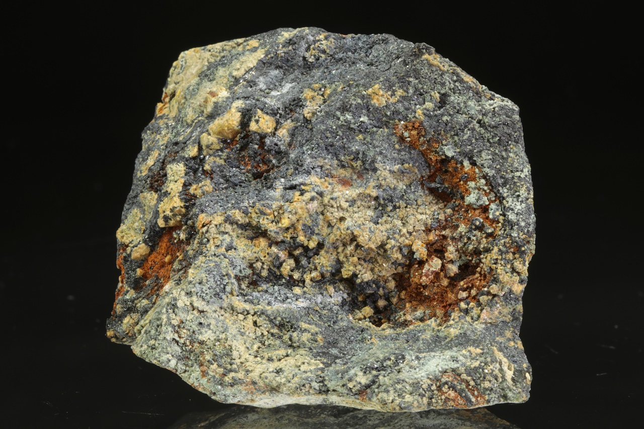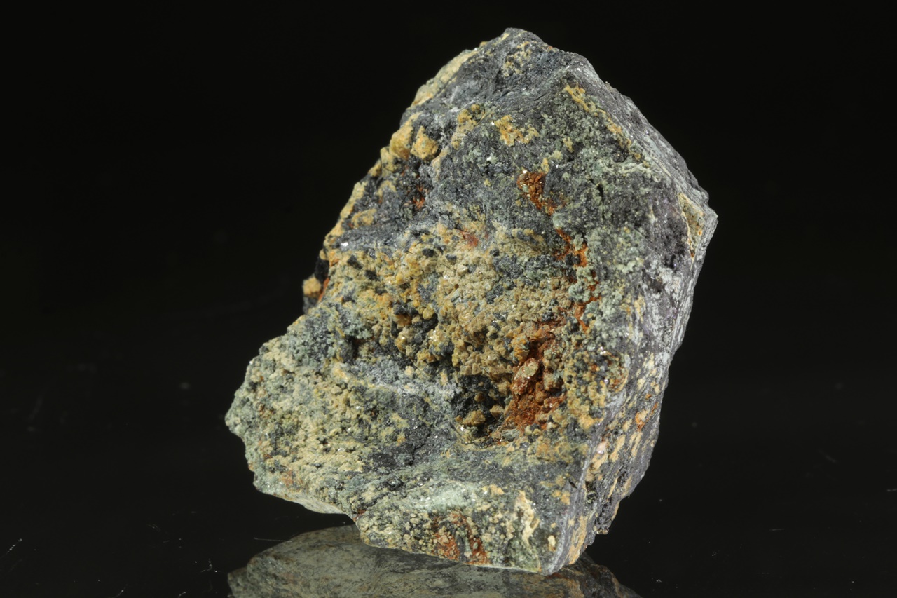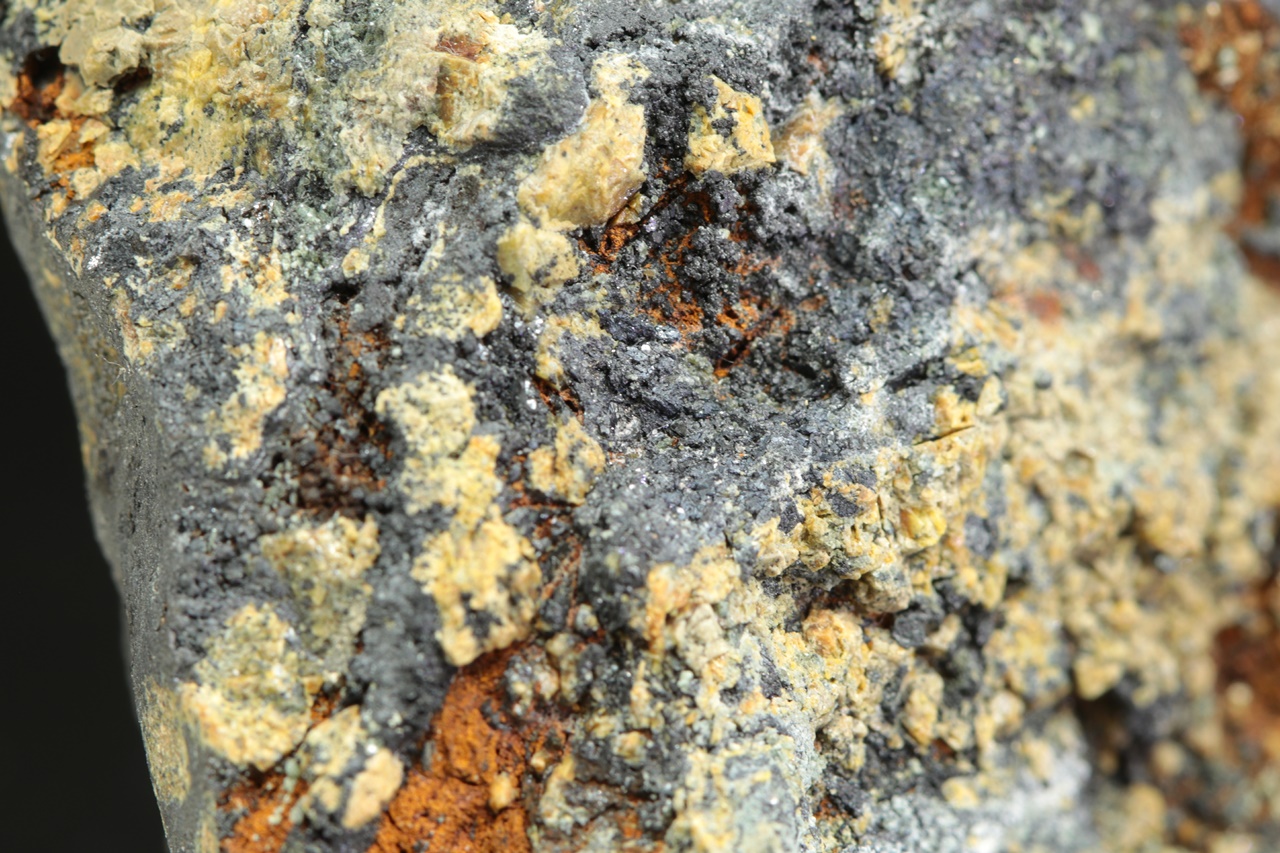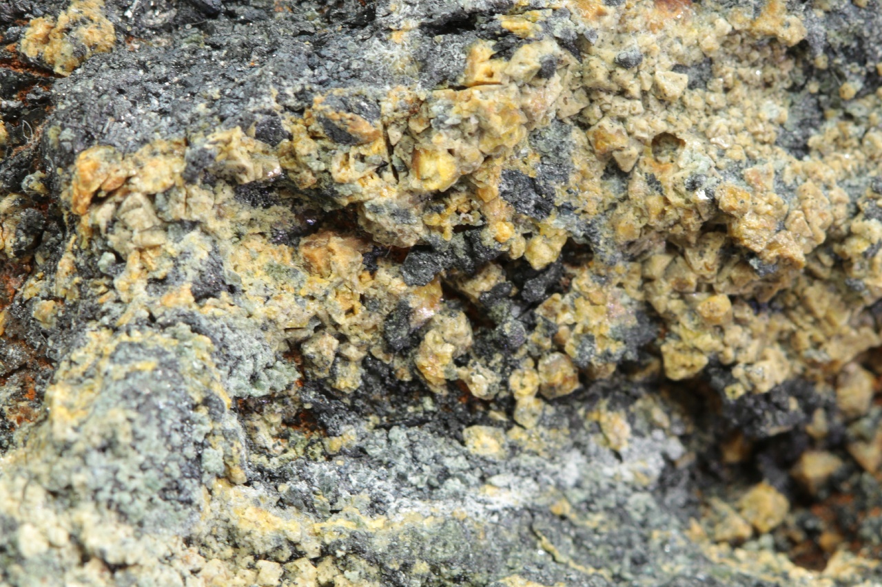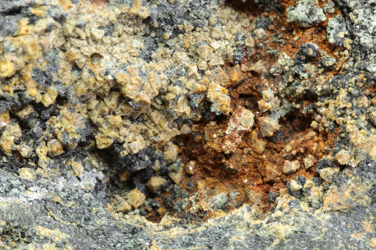 Oktaedrické krystaly světle žlutého hydroxidu hořčíku a cínu rostoucí do dutiny. Krystaly jsou přibližně 1 mm velké.