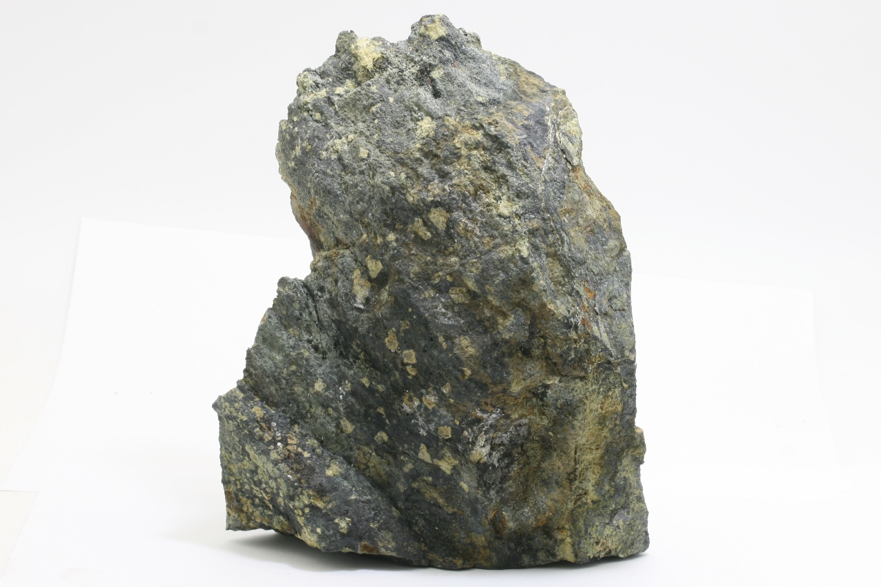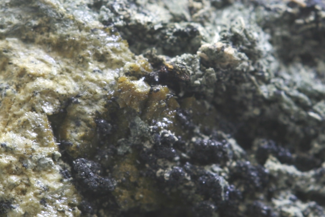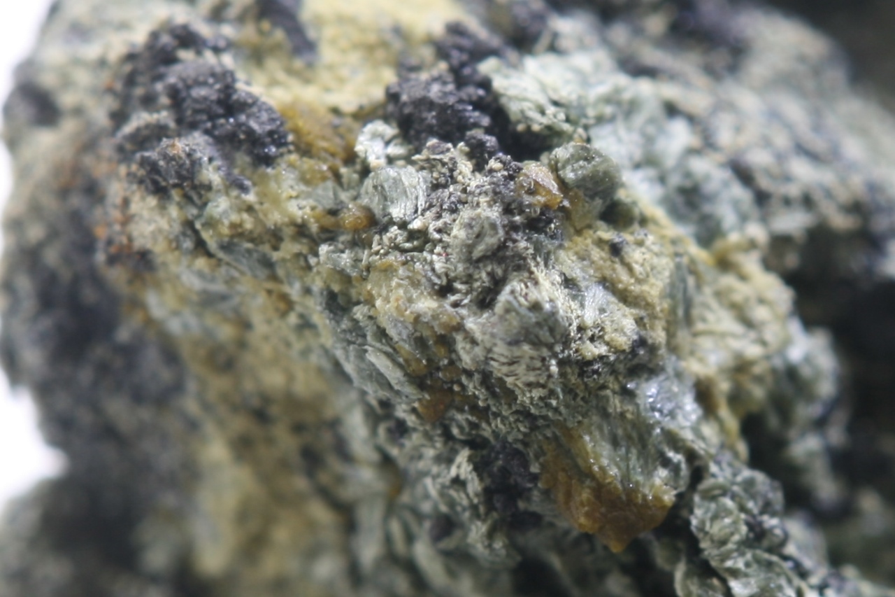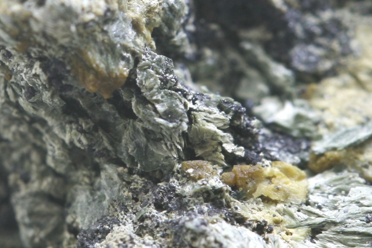 Grains and tiny crystals of schoenfliesite. At the top of the specimen, several well-defined crystals are protruding, with a maximum size of 1 mm.