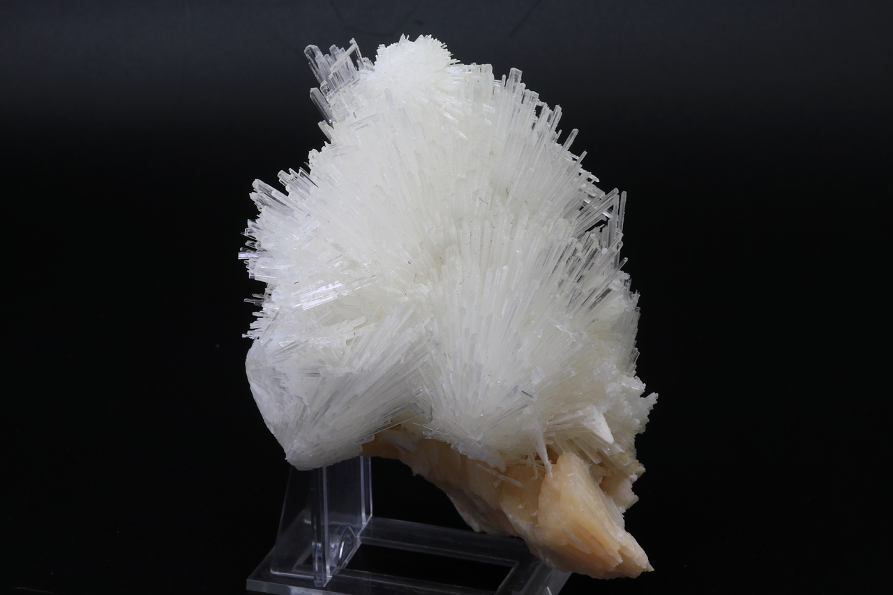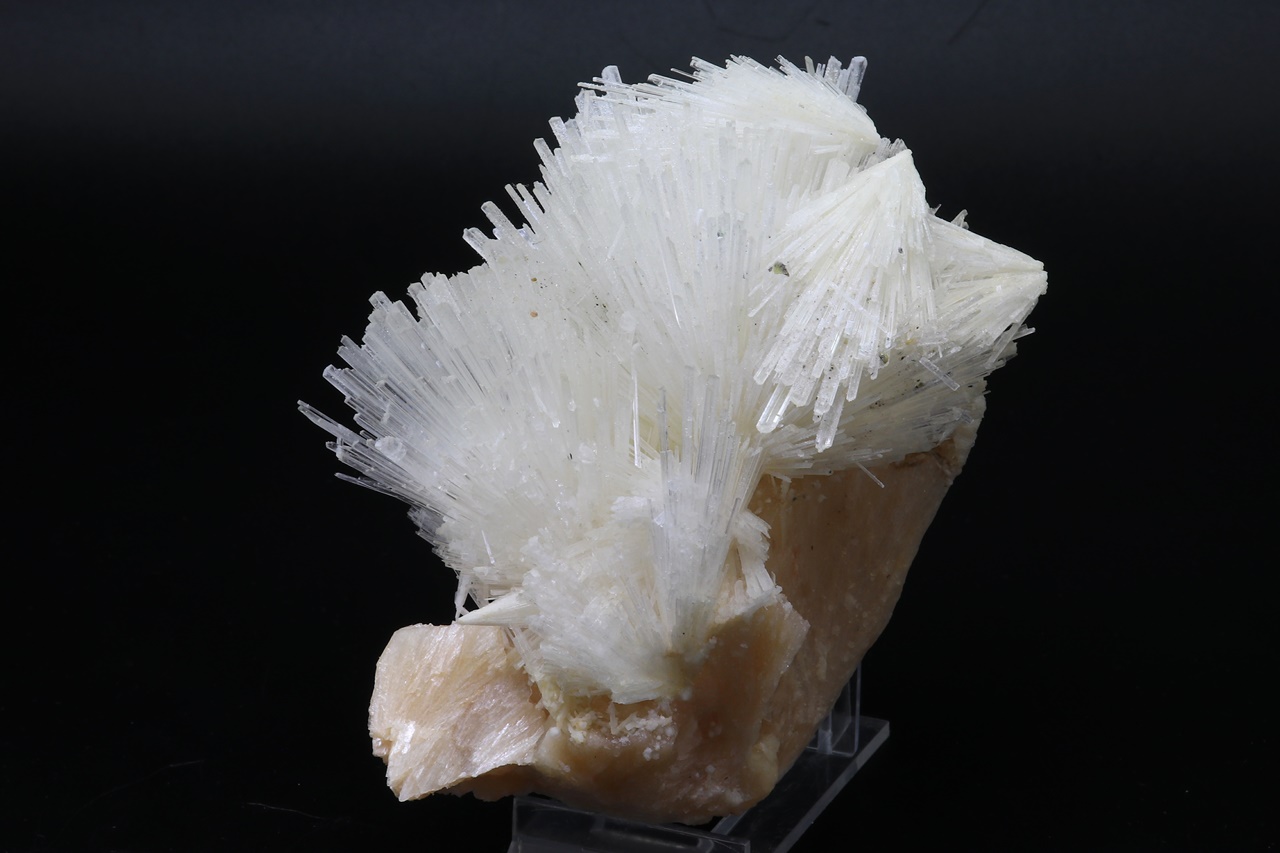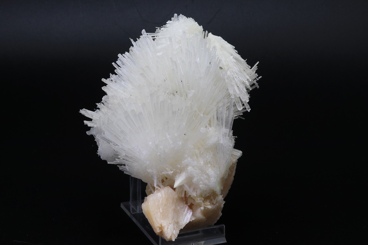 Several intergrown radial aggregates of clear scolecite with crystals up to 4 cm in size grown on light pink stilbite. The sample must be picked up in store.