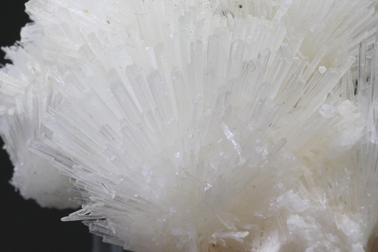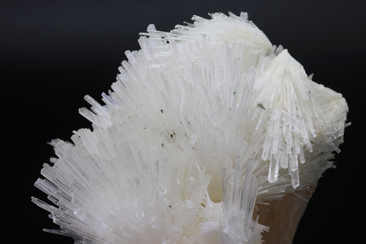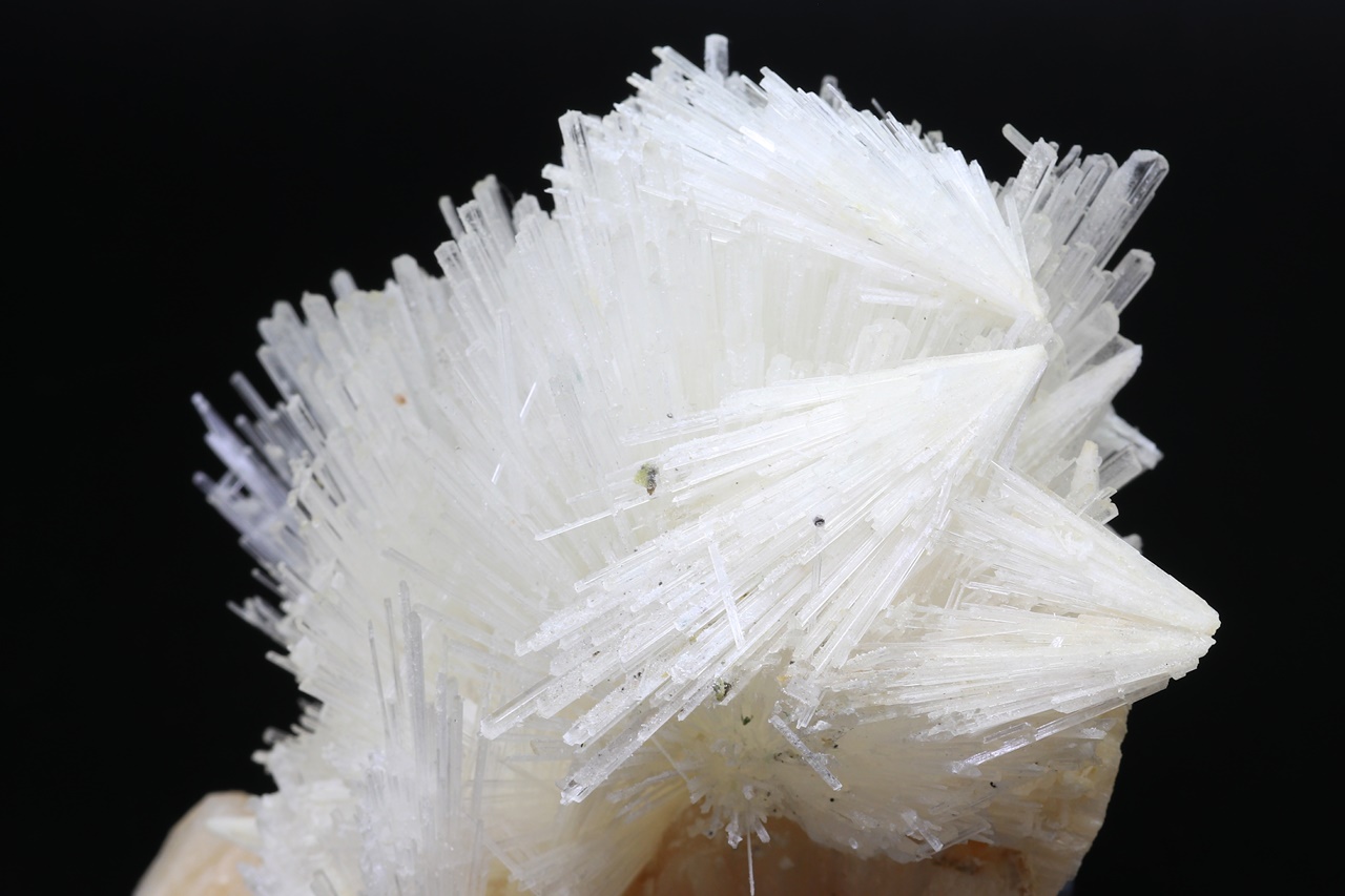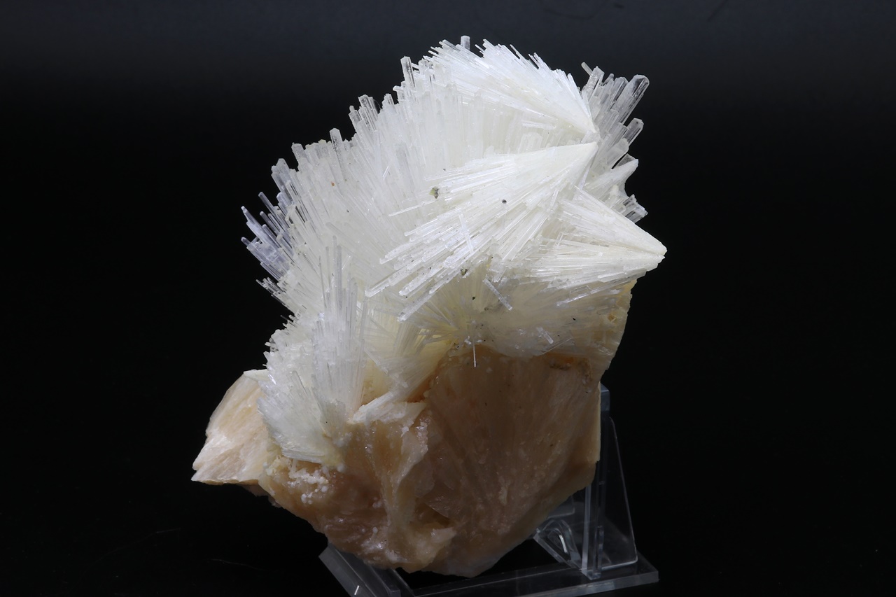 Several intergrown radial aggregates of clear scolecite with crystals up to 4 cm in size grown on light pink stilbite. The sample must be picked up in store.