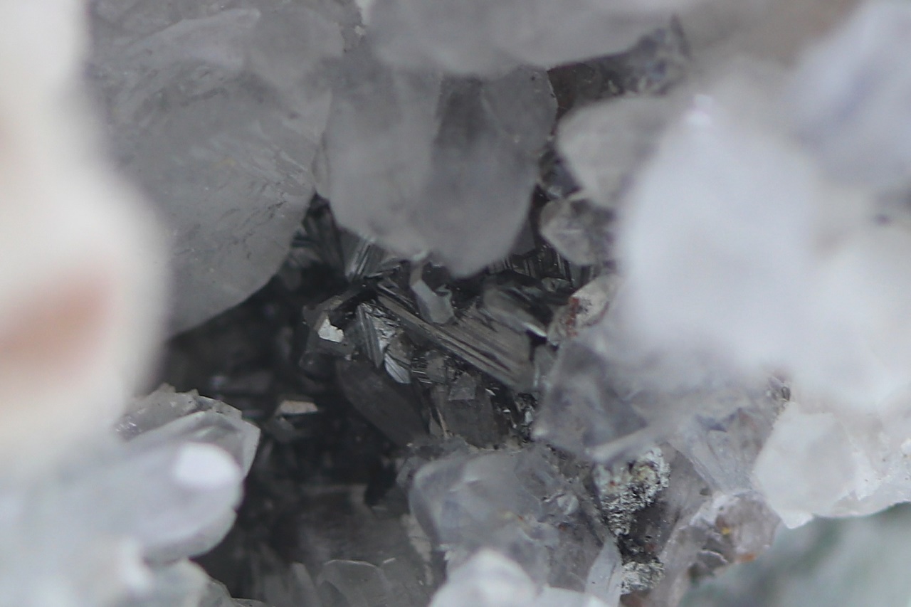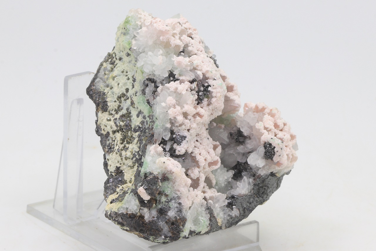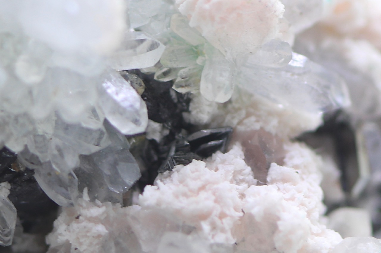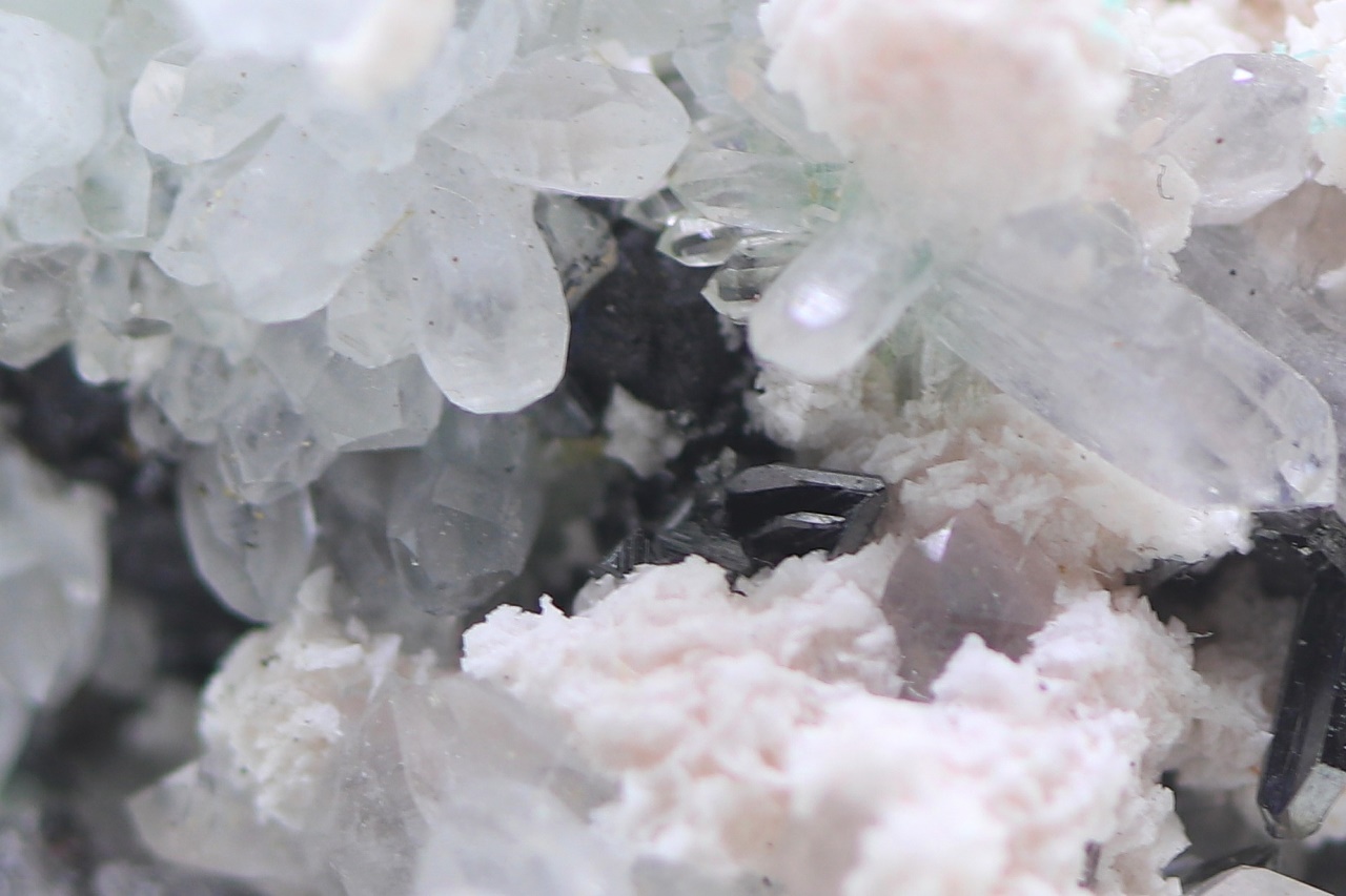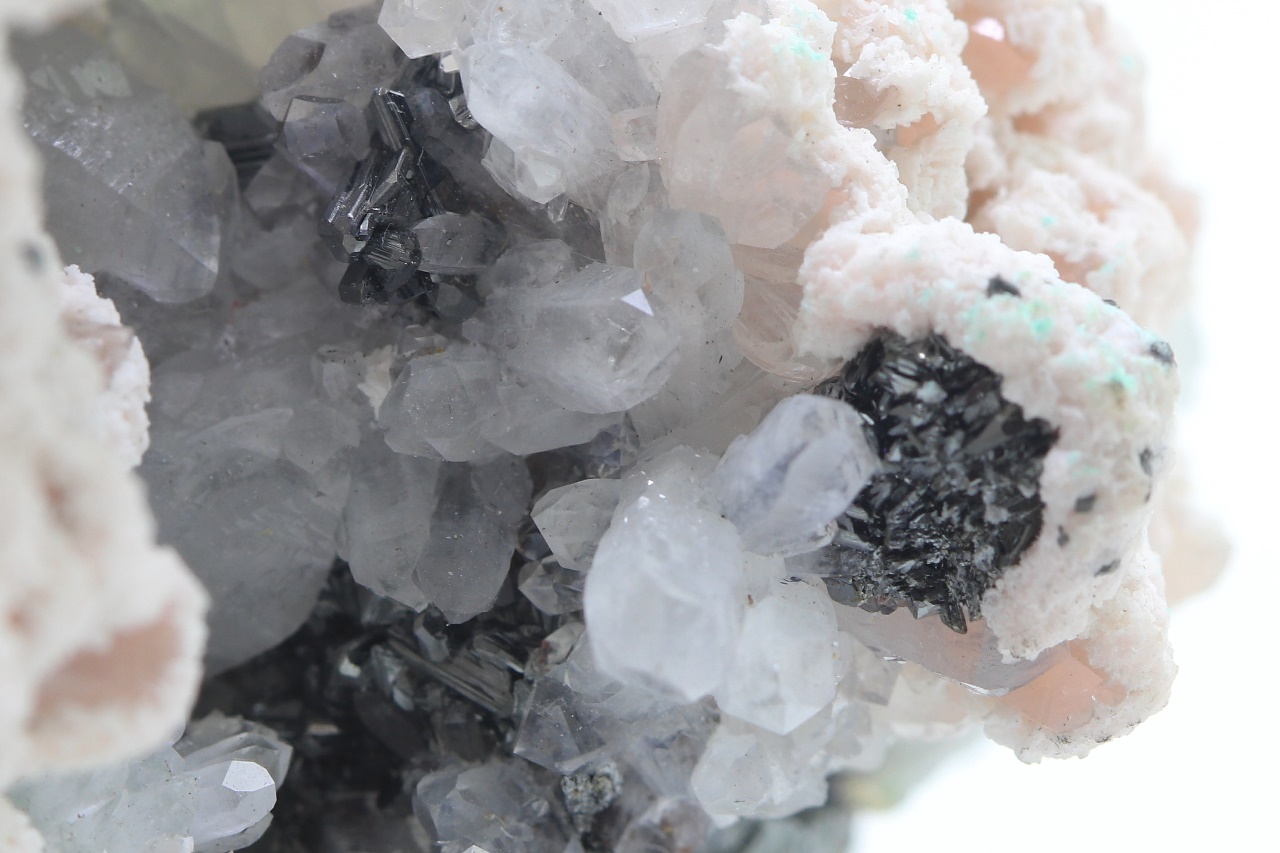 Black, metallic luster crystals of the rare sulfoarsenide of copper and lead growing on white Quartz and overgrowing “roses” of light pink Rhodochrosite.