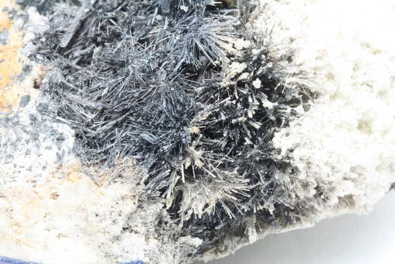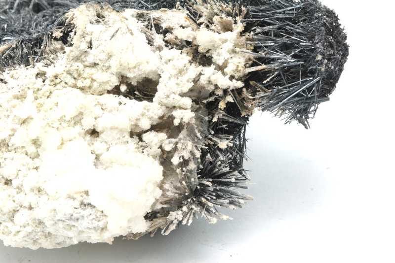 Aesthetic large sample of secondary antimony oxide, Senarmontite, and Antimonite from the Cetine locality, Italy. An aesthetic specimen where fine crystals of shiny Antimonite (up to 15 mm) cover a light substrate and protrude into space. Thin needles of Antimonite are densely overgrown with perfectly bounded, shiny, tabular crystals of Senarmontite.