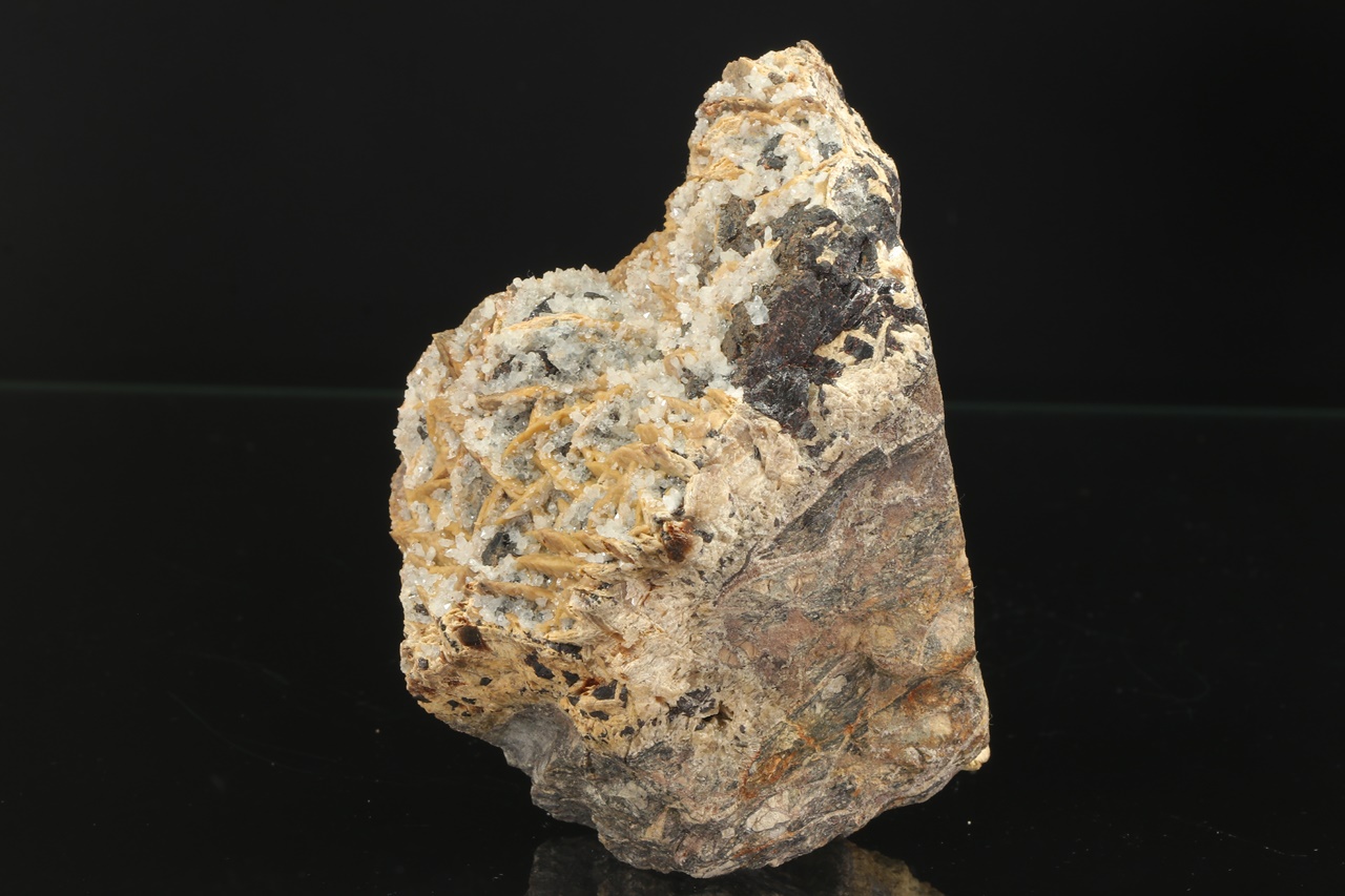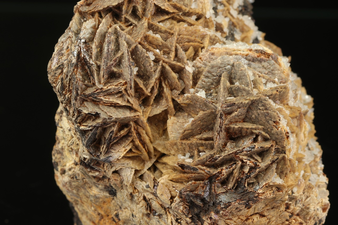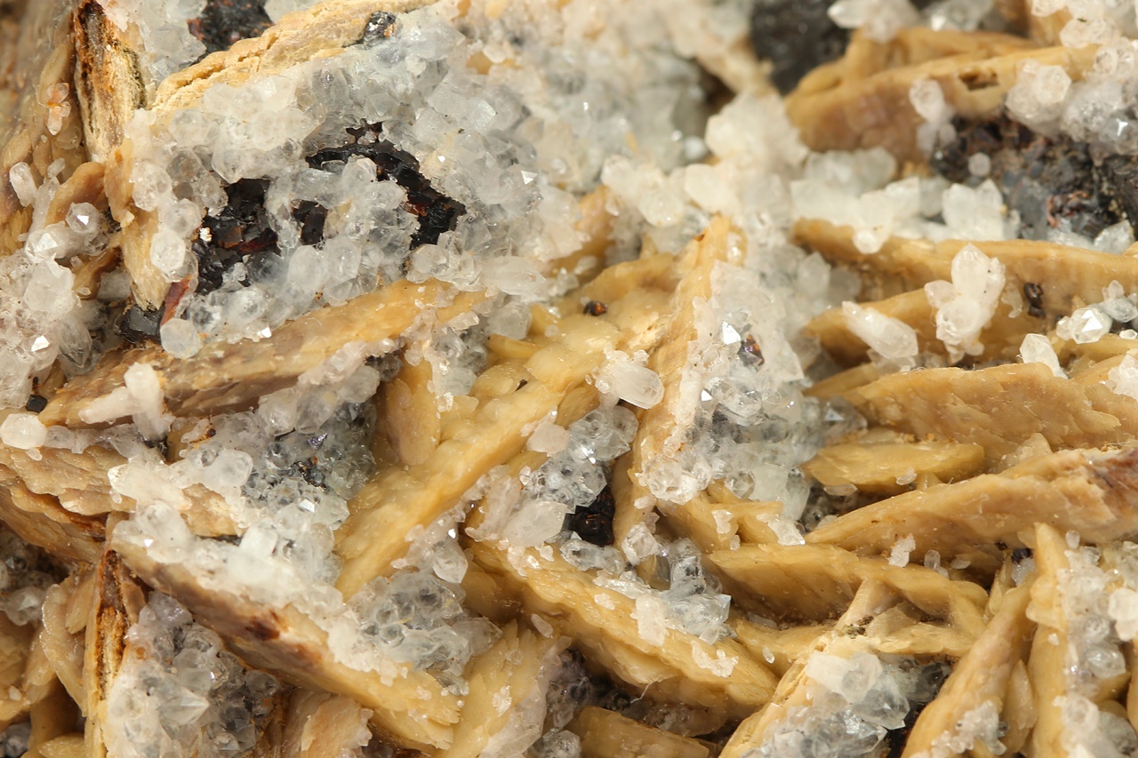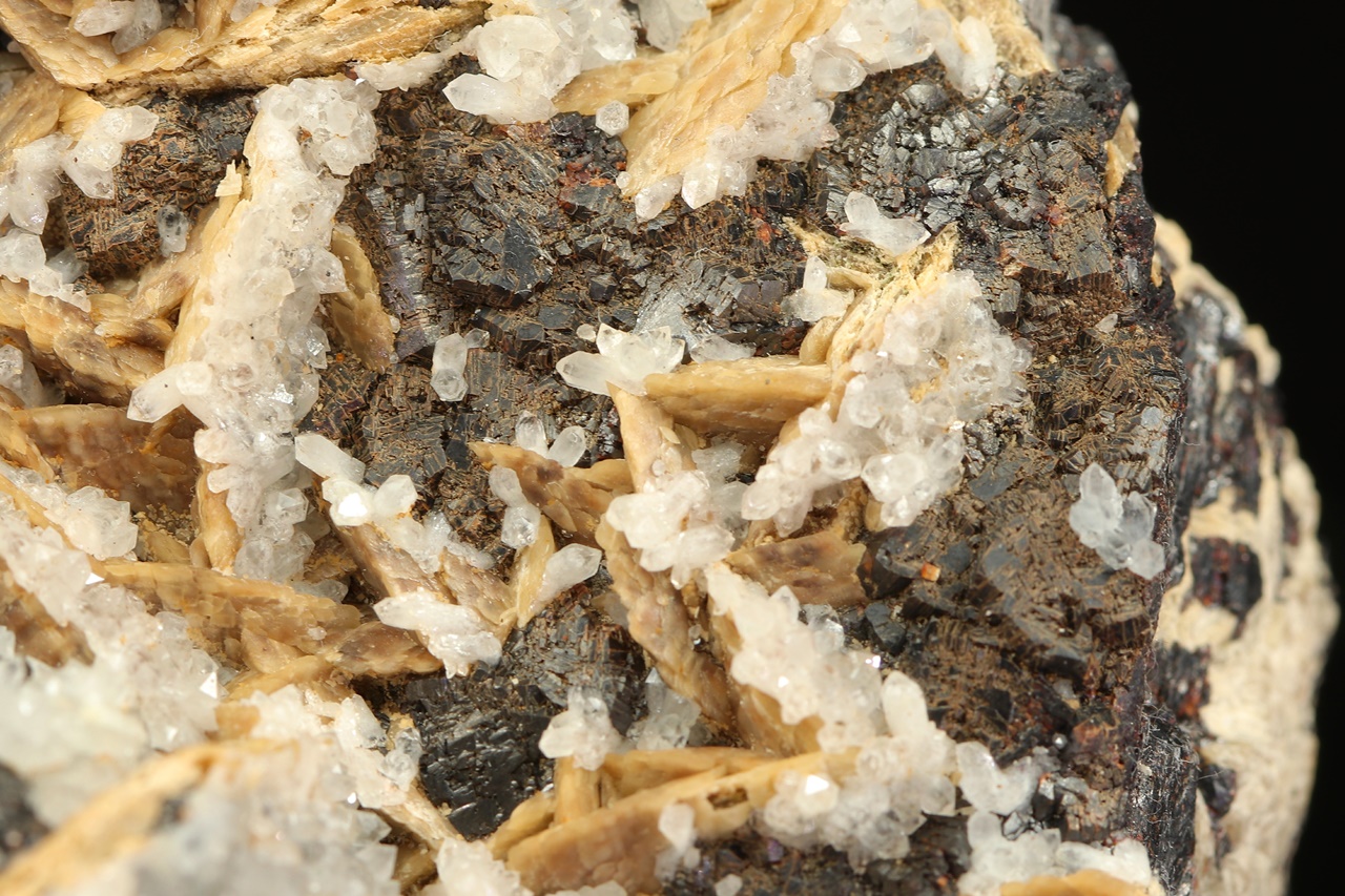 Tabular crystals of beige siderite intergrown with dark brown sphalerite and covered with small quartz crystals.