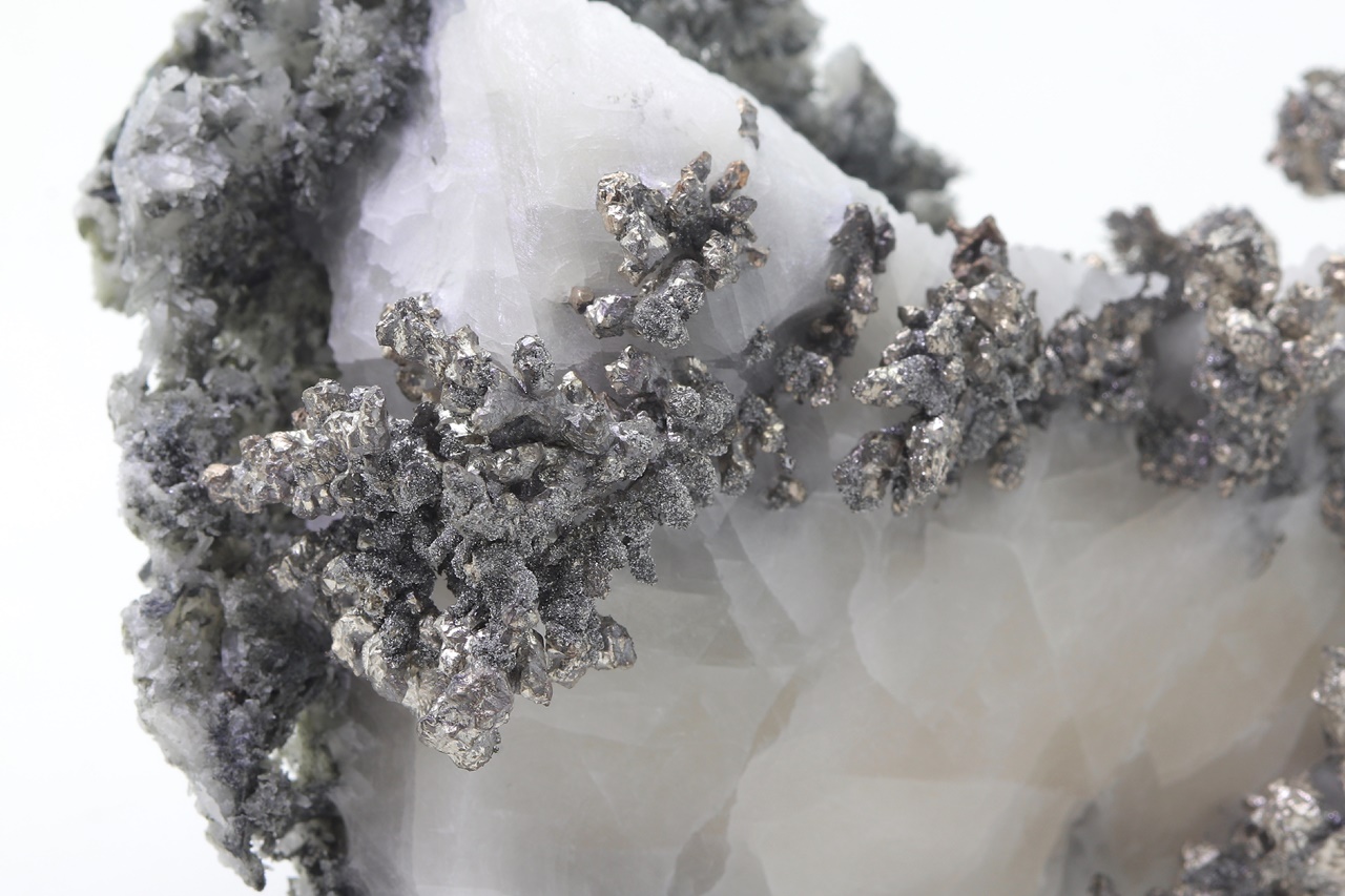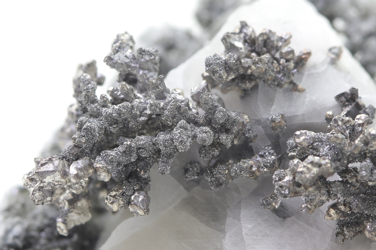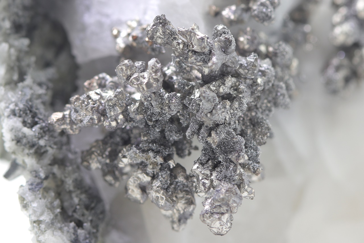 A beautiful specimen of pure silver dendritically growing into space with individual crystals up to 3 mm large emerging from white calcite.