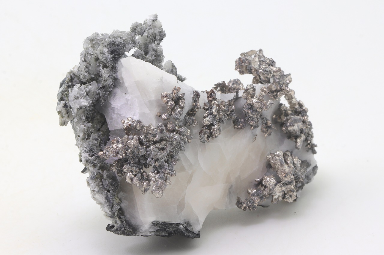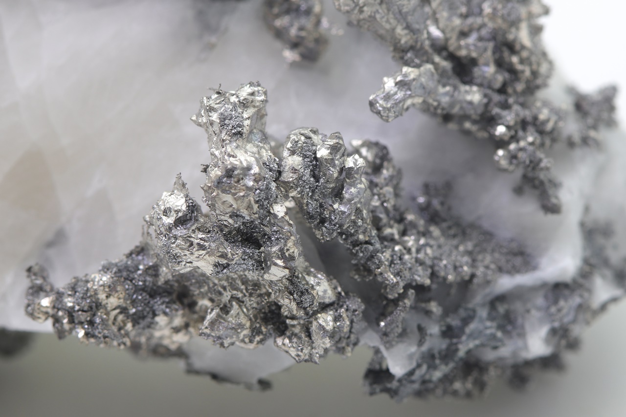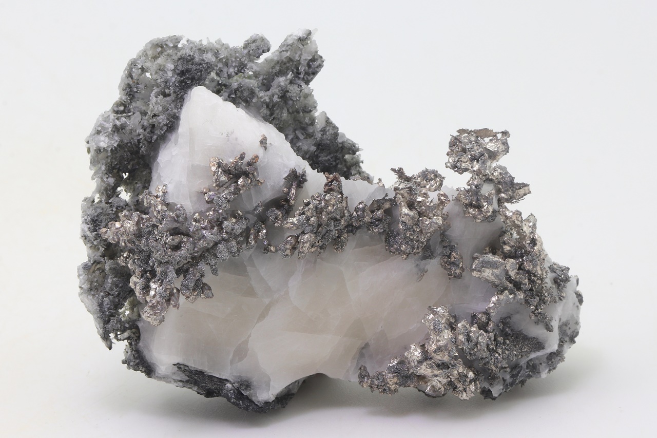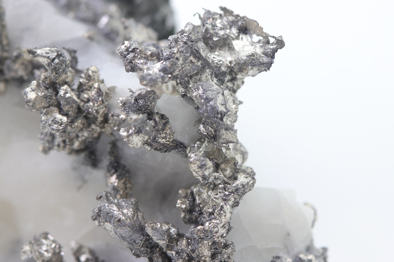 A beautiful specimen of pure silver dendritically growing into space with individual crystals up to 3 mm large emerging from white calcite.
