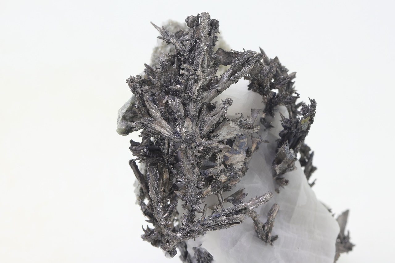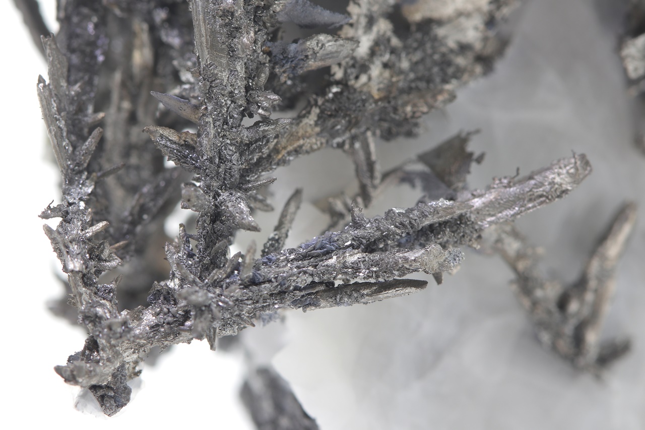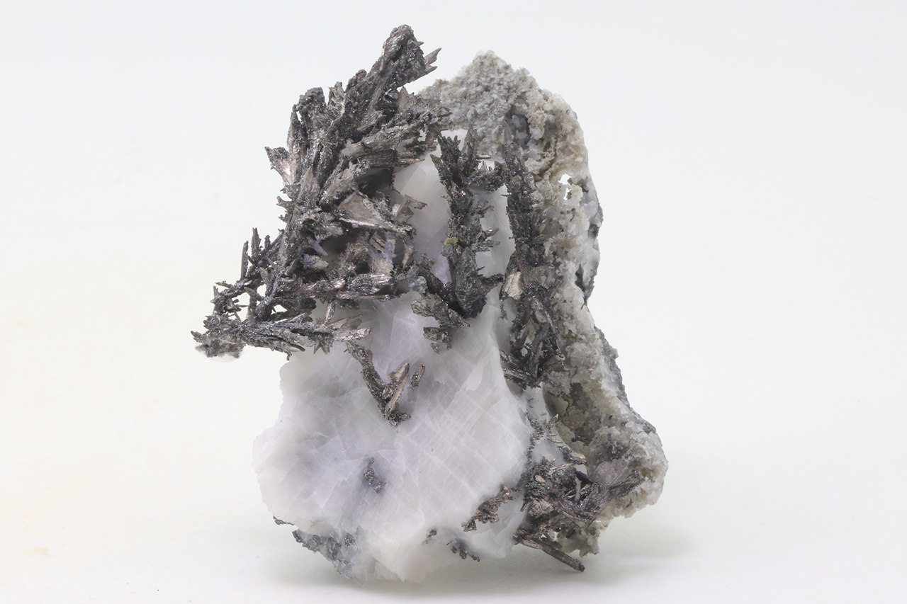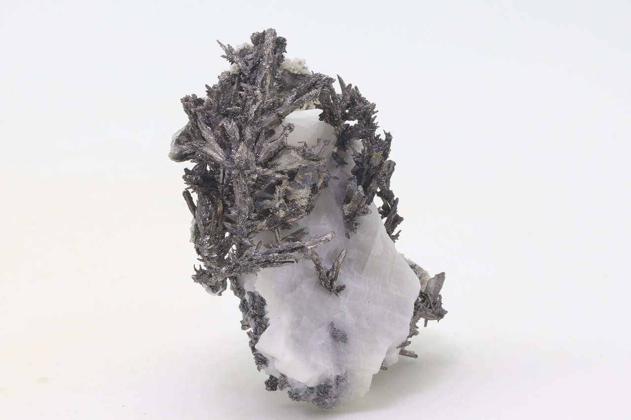 Elongated, slatted, dendritically grown pseudomorphs of native silver after dyskrazite, richly projecting from white calcite.