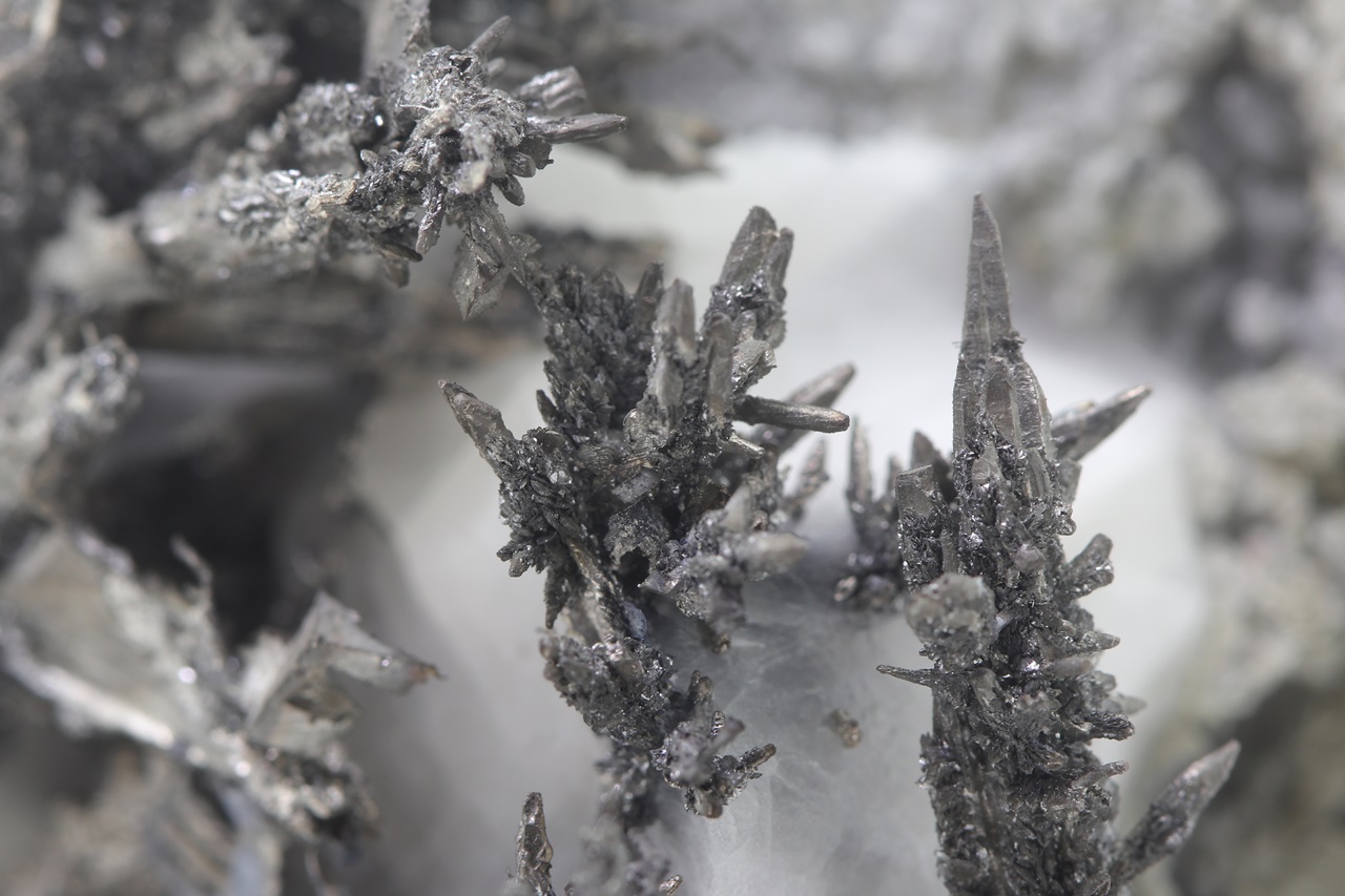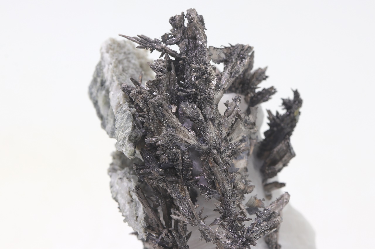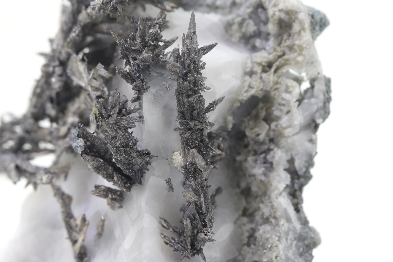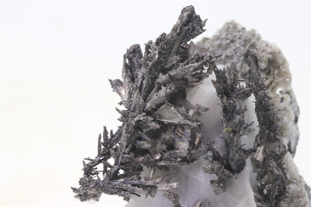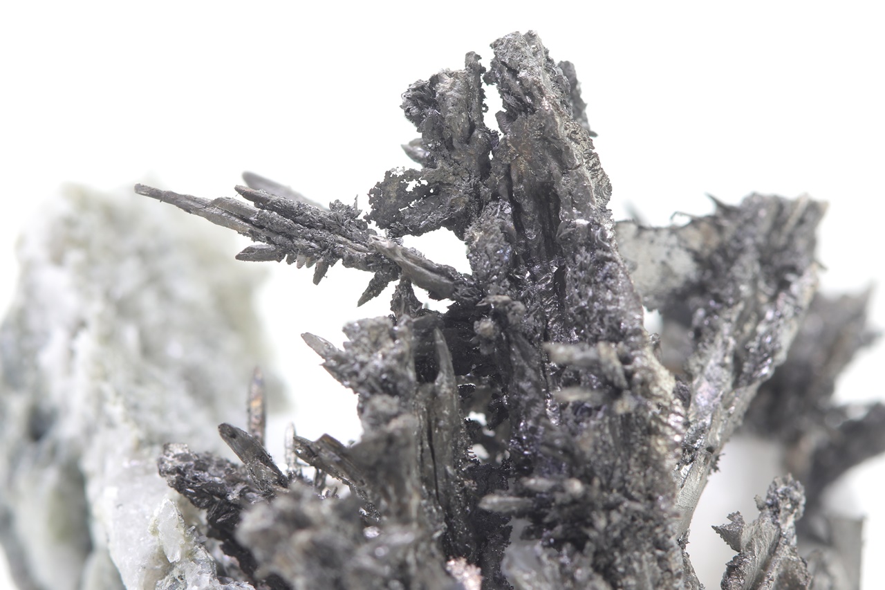 Elongated, slatted, dendritically grown pseudomorphs of native silver after dyskrazite, richly projecting from white calcite.