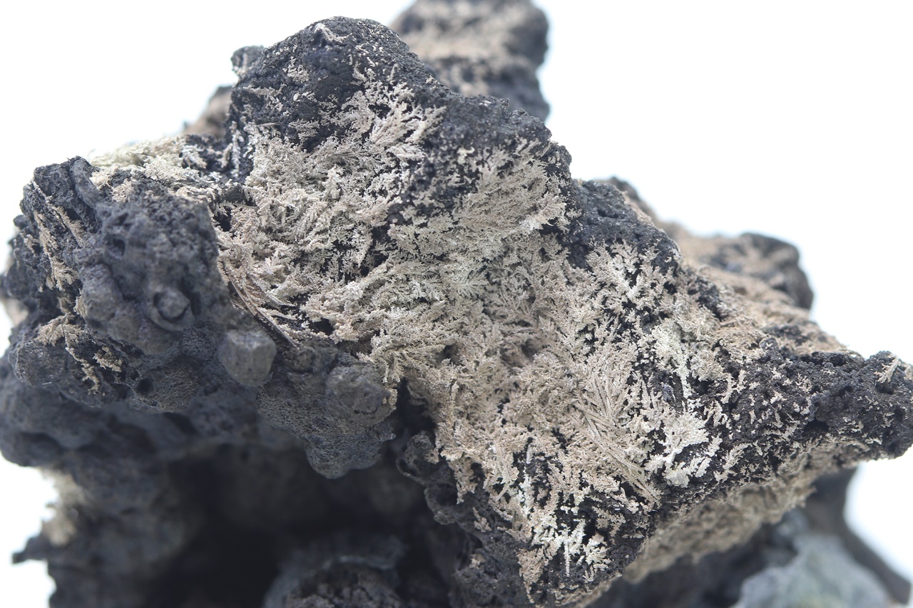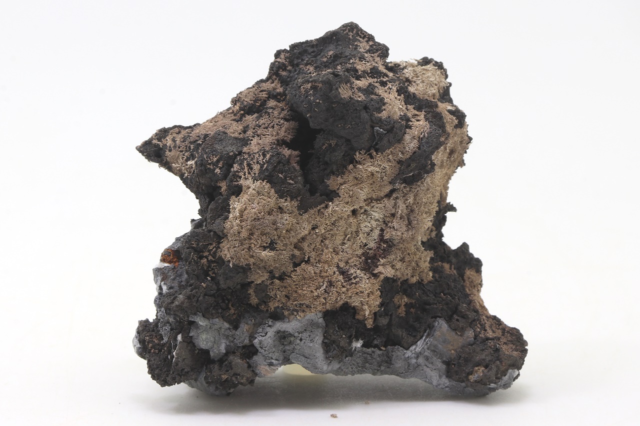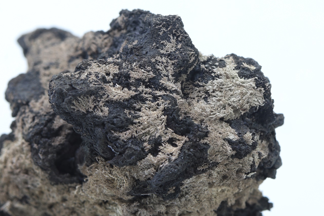 A rich specimen of dendritic aggregates of native silver on black Native Arsenic.