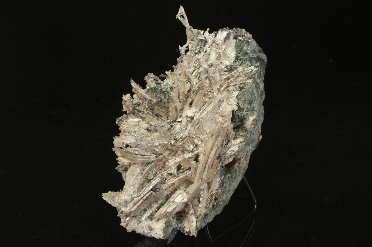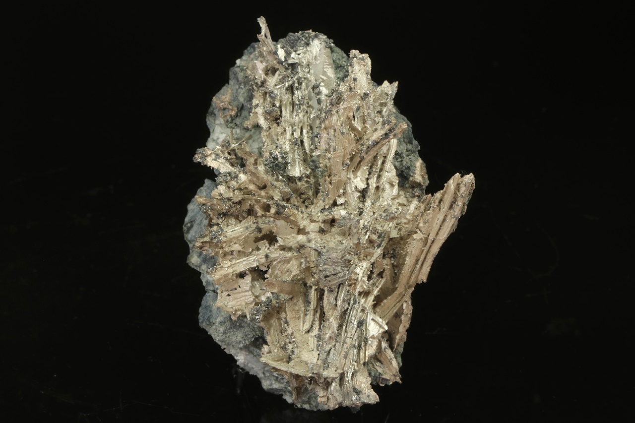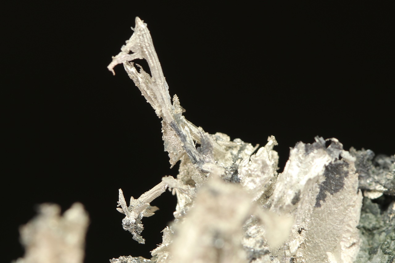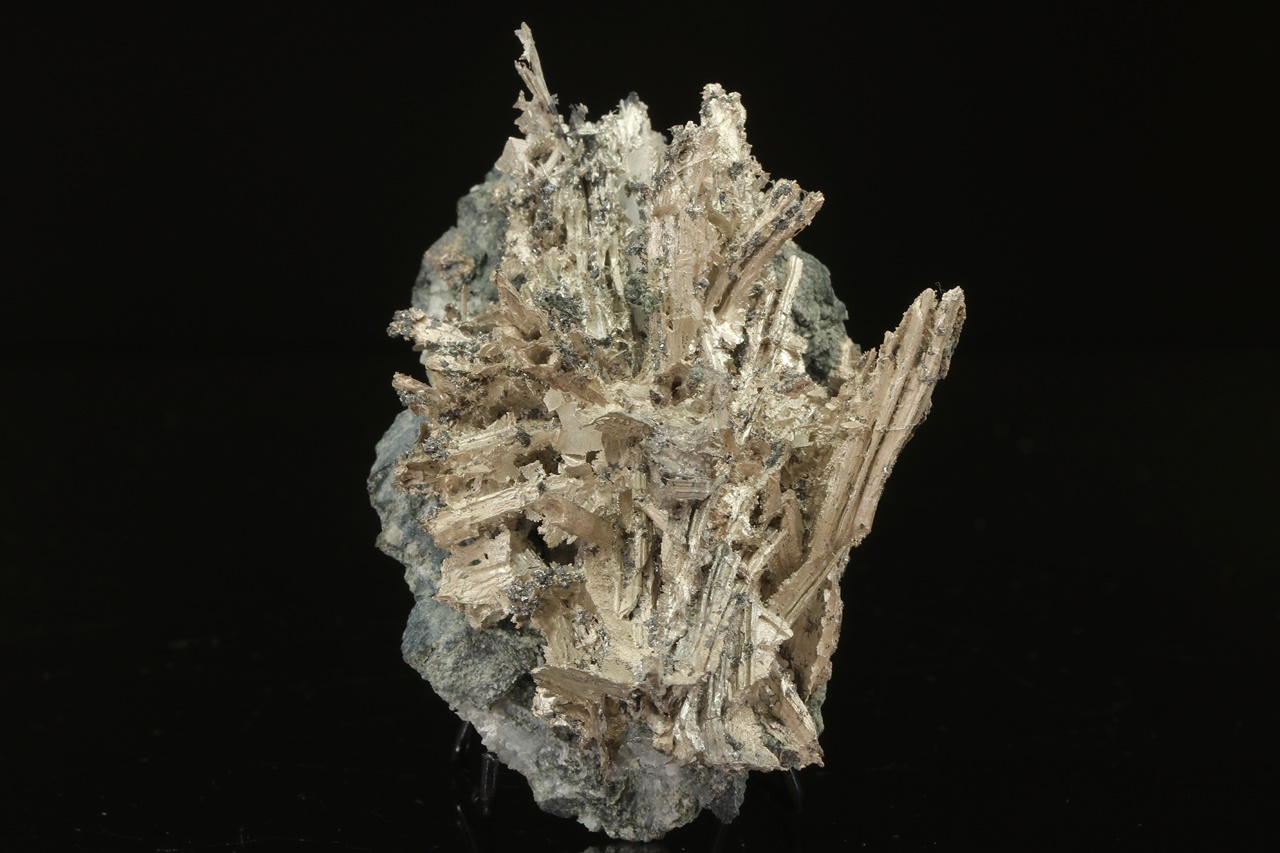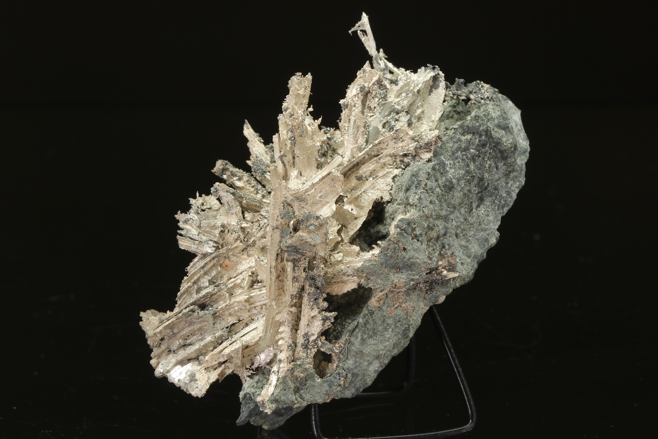 An exceptional sample of pure silver formed by unusually long, lath-like pseudomorphs after dyskrazite crystals. The longest pseudomorphs are 7 cm in length and are intergrown with additional smaller pseudomorphs. The base of this exceptionally aesthetic specimen is composed of grey rock. The silver is locally grown with small löllingite crystals.