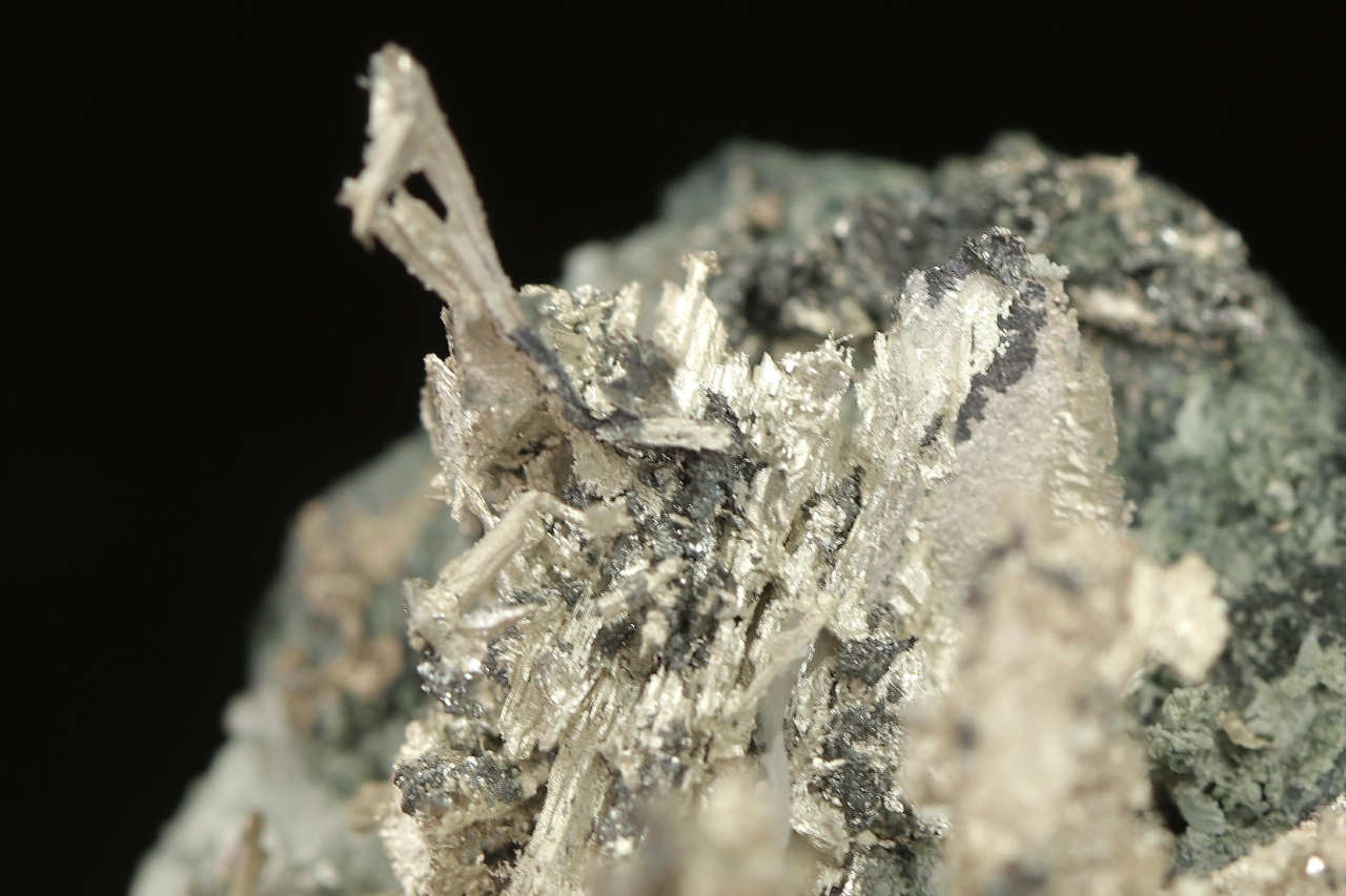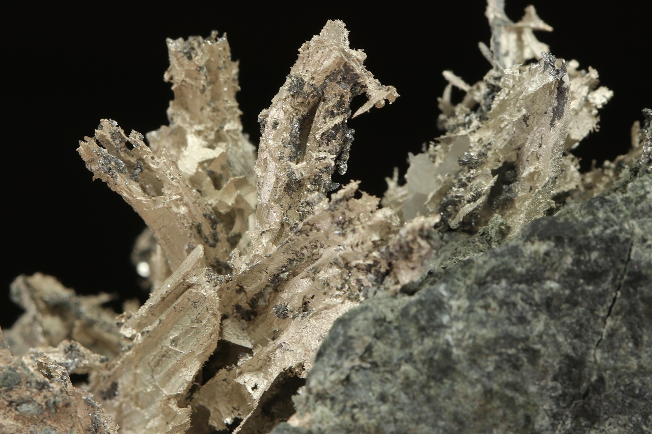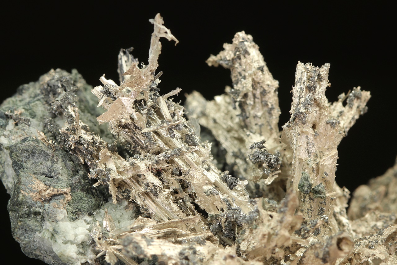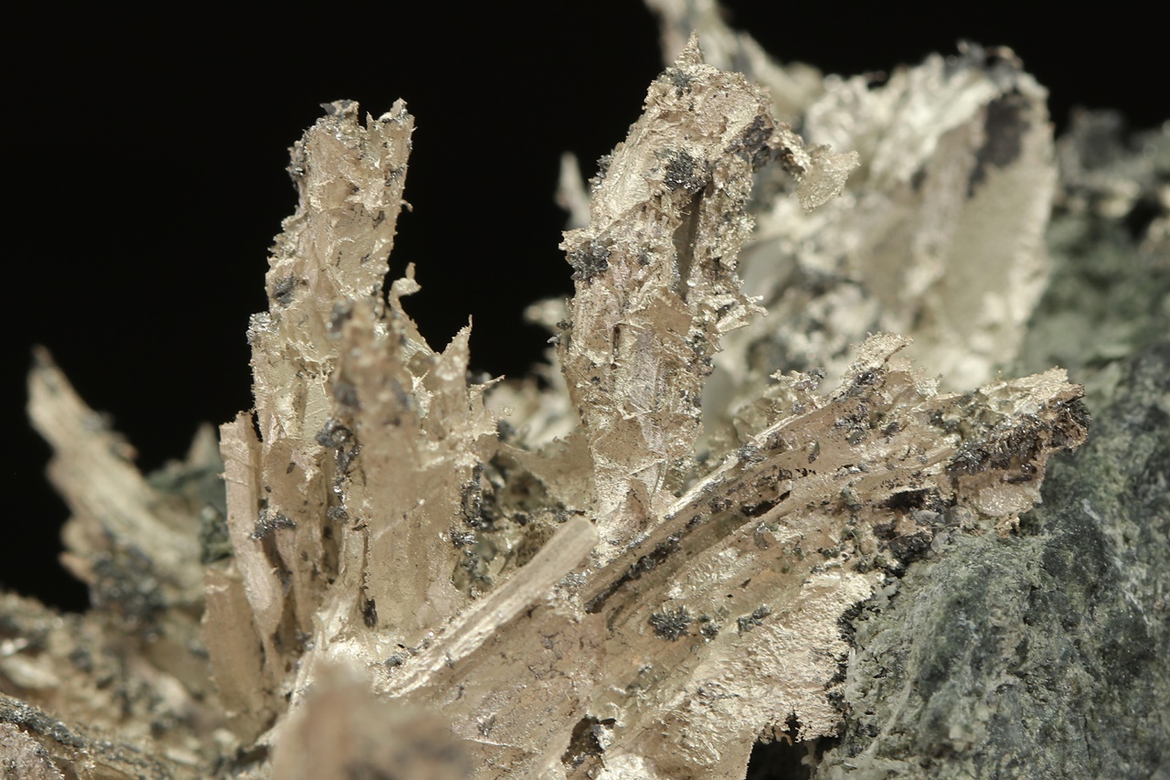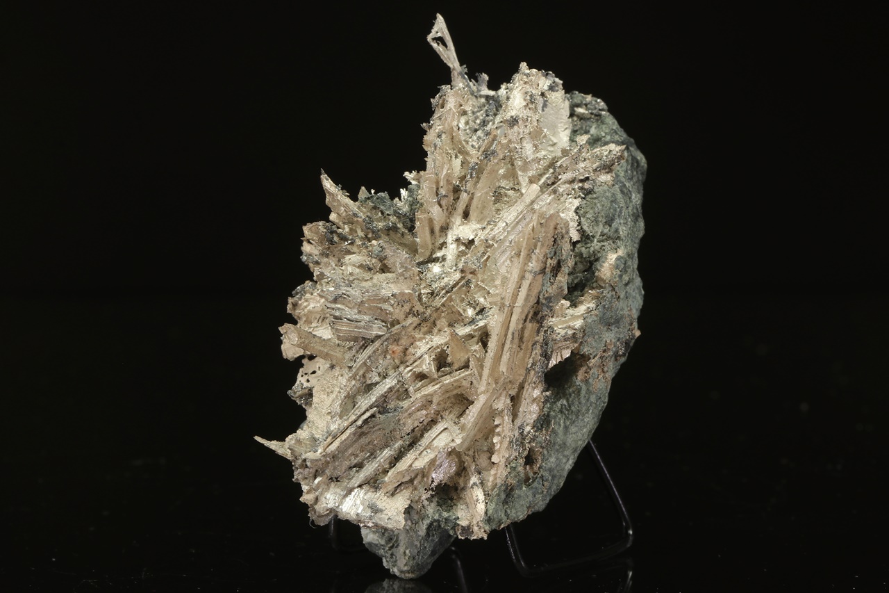 An exceptional sample of pure silver formed by unusually long, lath-like pseudomorphs after dyskrazite crystals. The longest pseudomorphs are 7 cm in length and are intergrown with additional smaller pseudomorphs. The base of this exceptionally aesthetic specimen is composed of grey rock. The silver is locally grown with small löllingite crystals.
