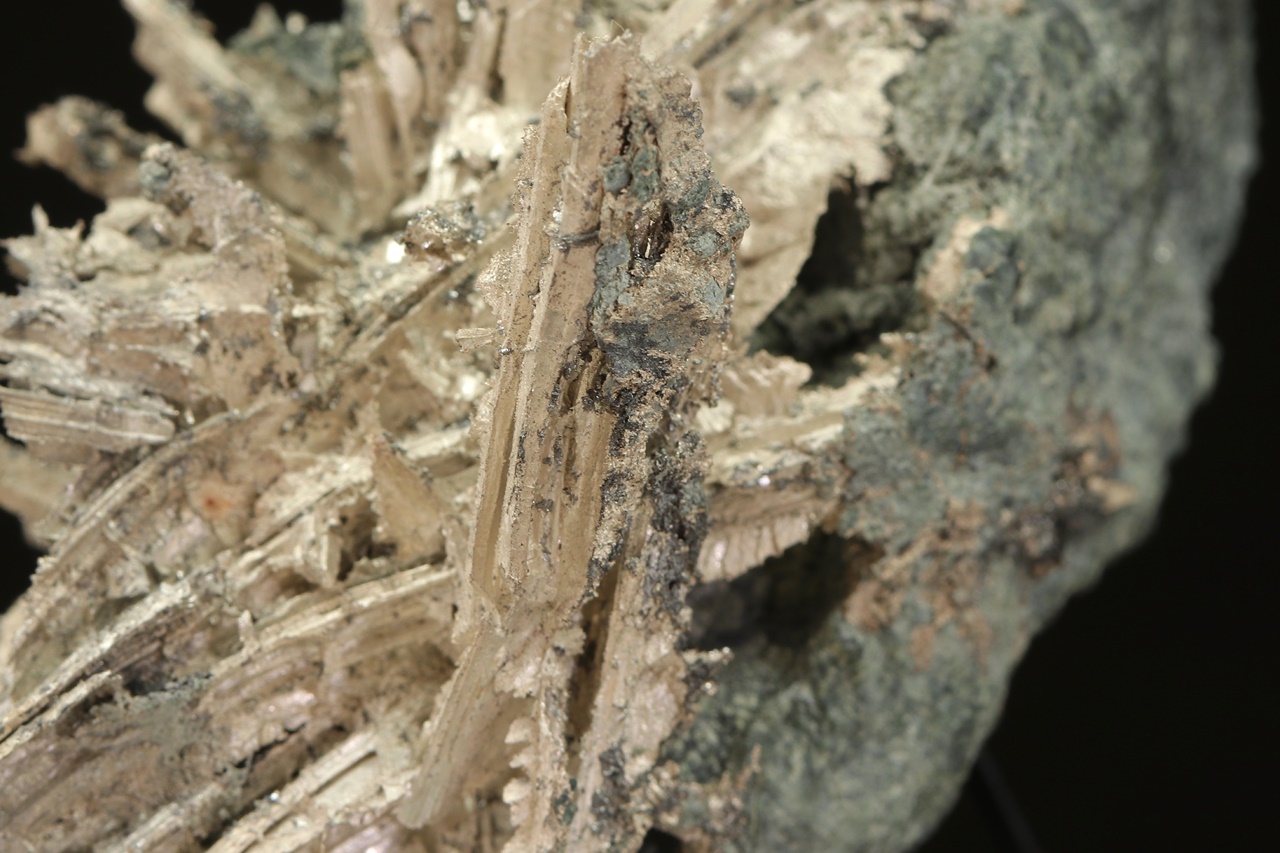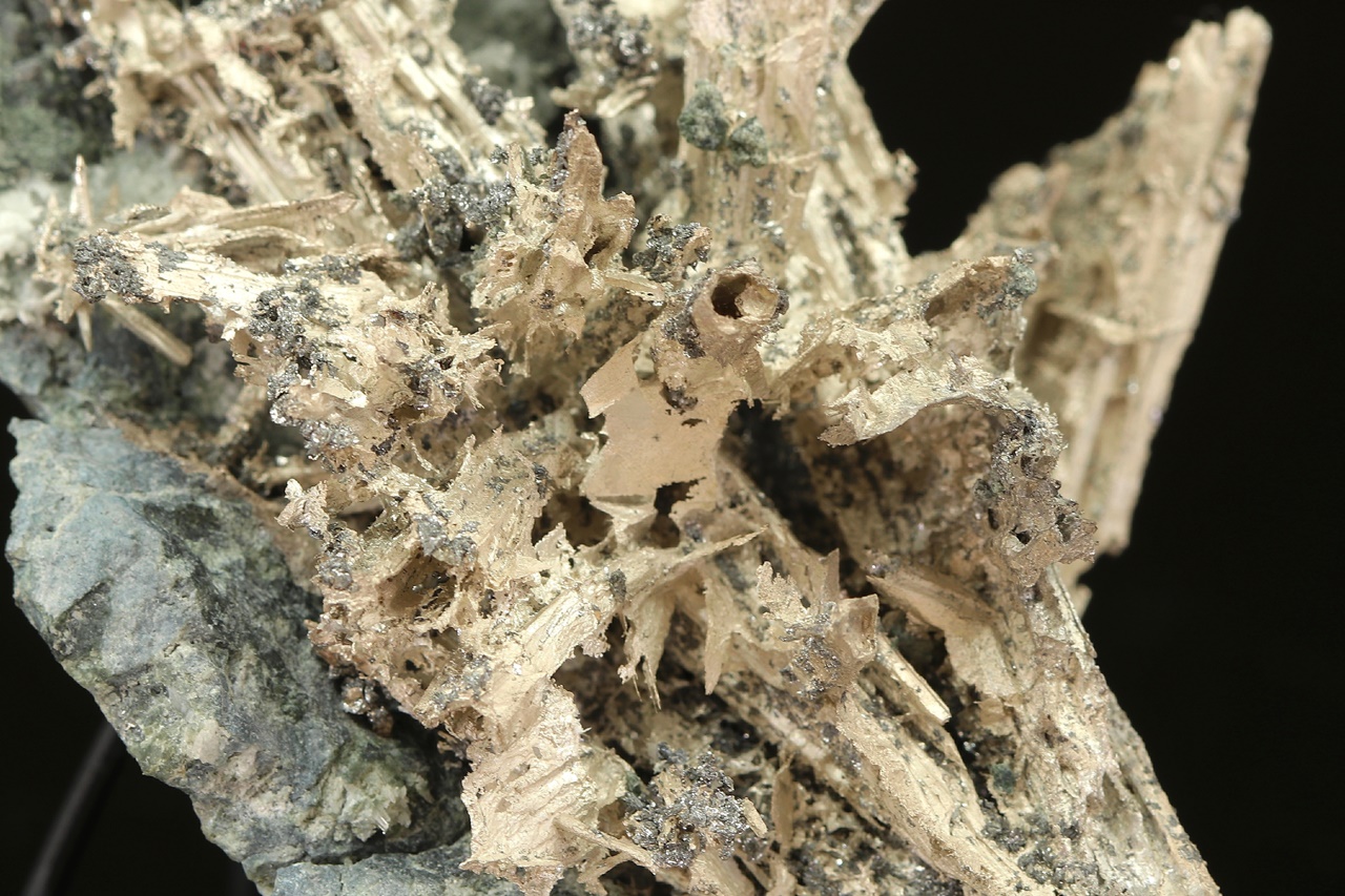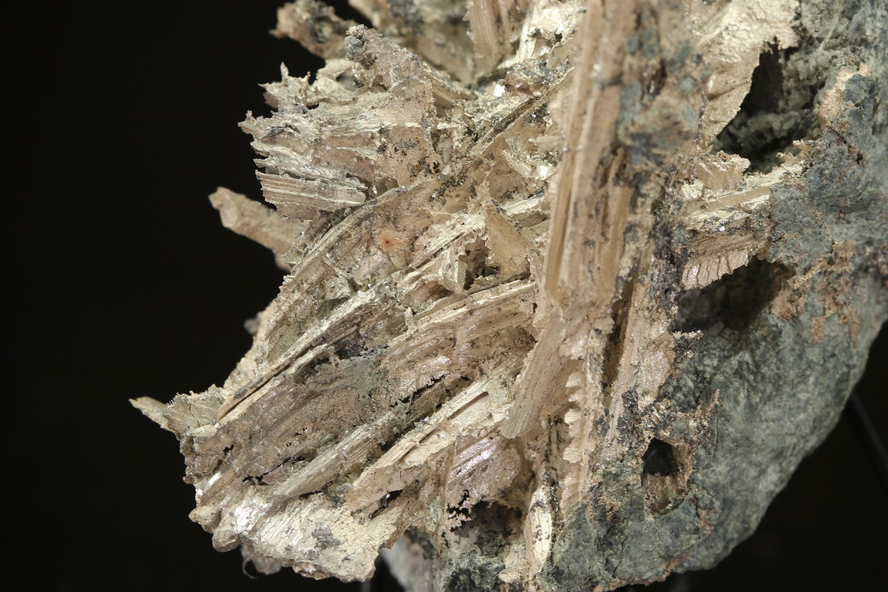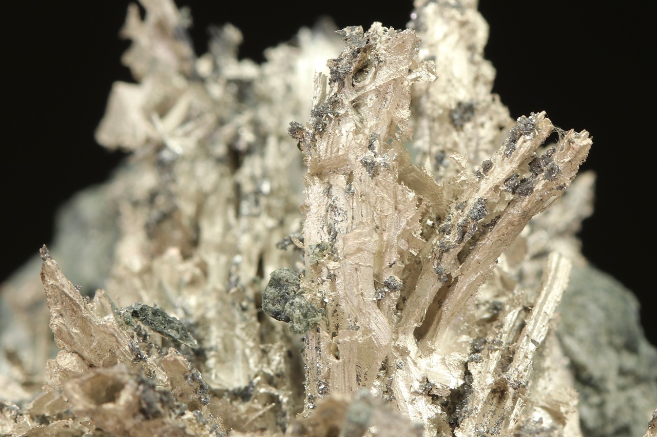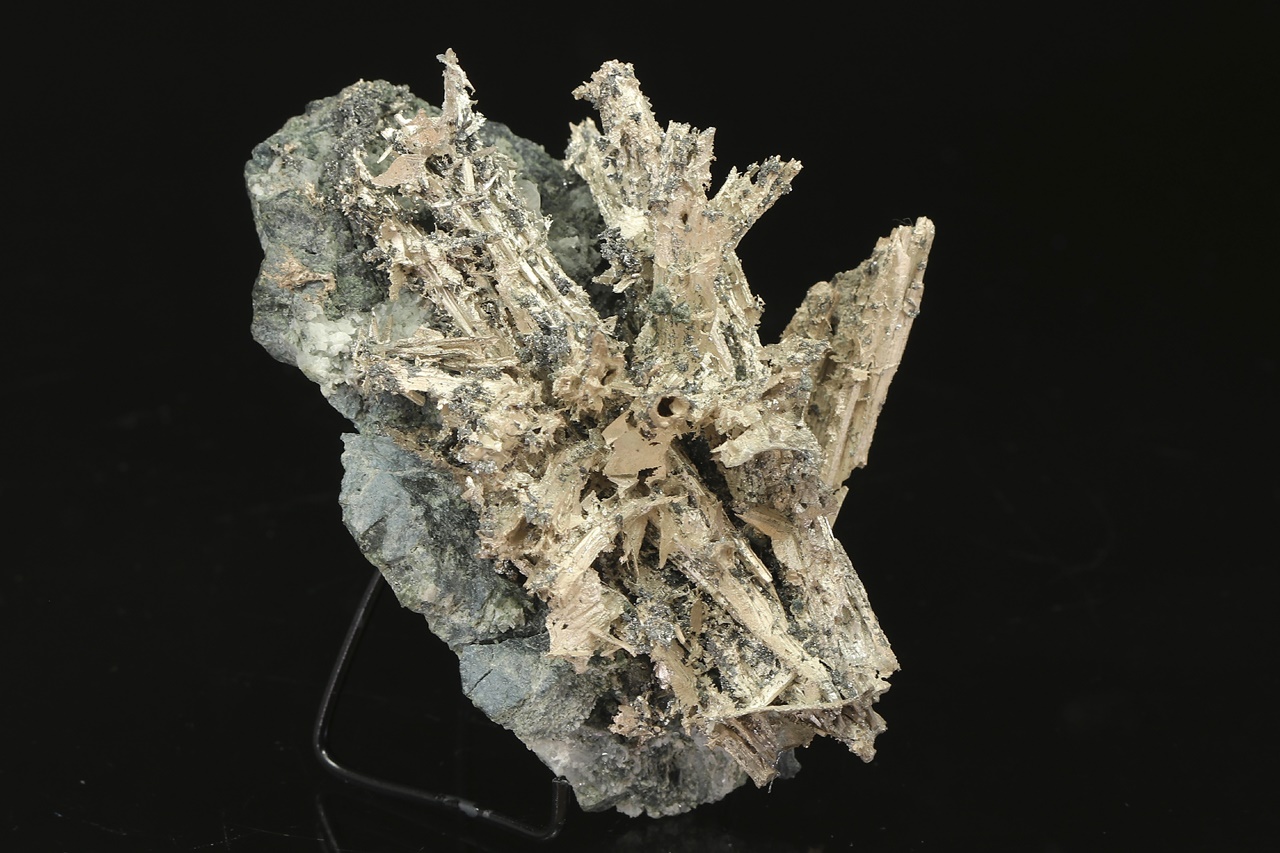 An exceptional sample of pure silver formed by unusually long, lath-like pseudomorphs after dyskrazite crystals. The longest pseudomorphs are 7 cm in length and are intergrown with additional smaller pseudomorphs. The base of this exceptionally aesthetic specimen is composed of grey rock. The silver is locally grown with small löllingite crystals.