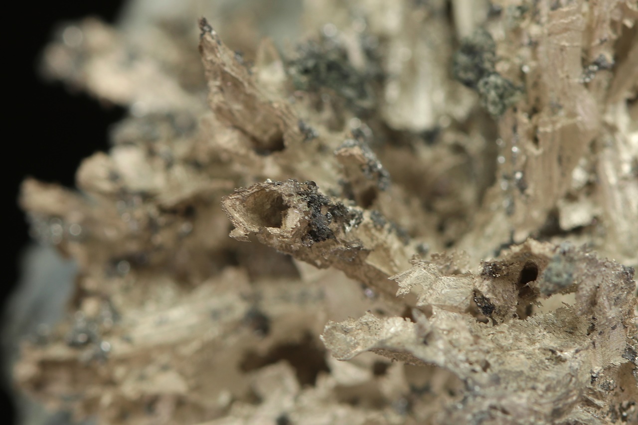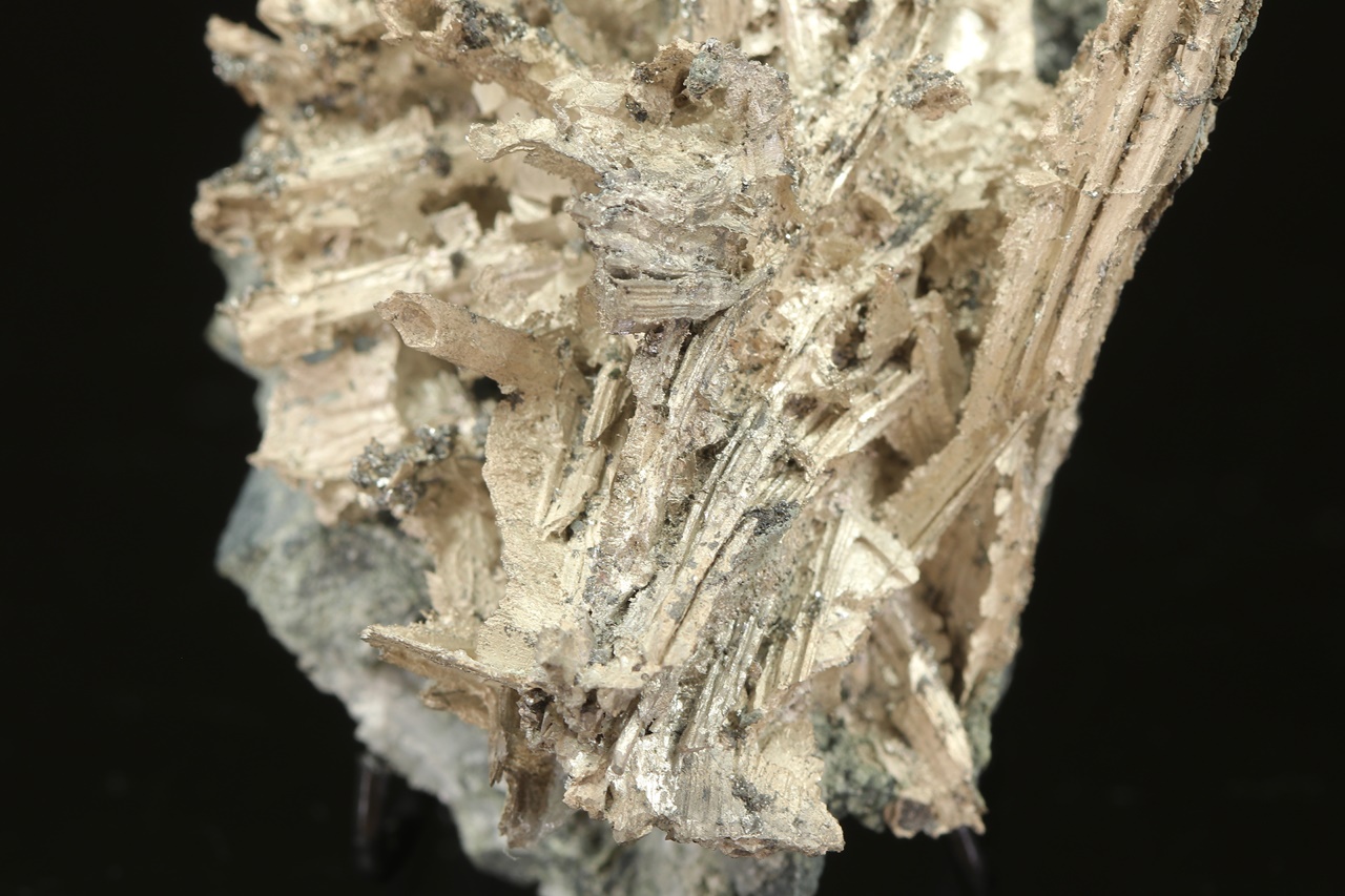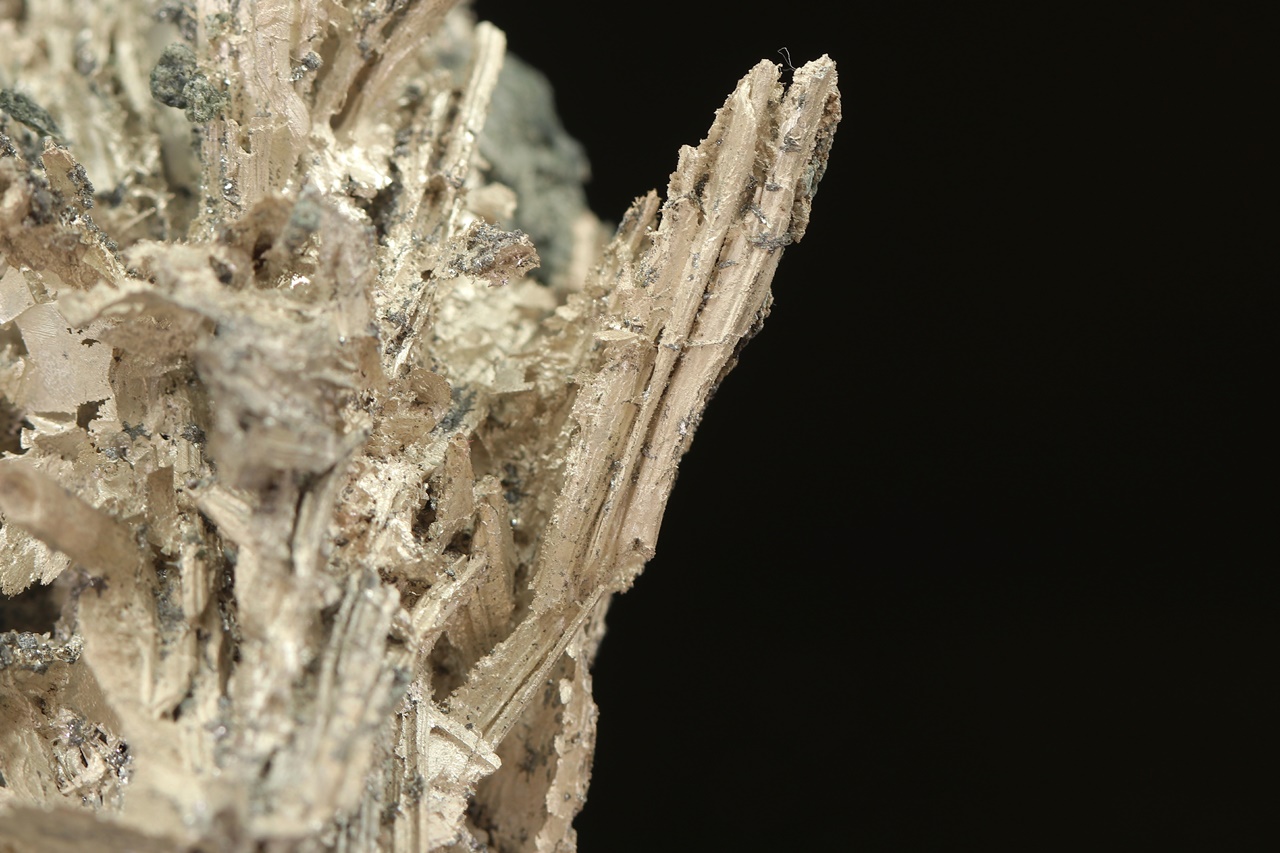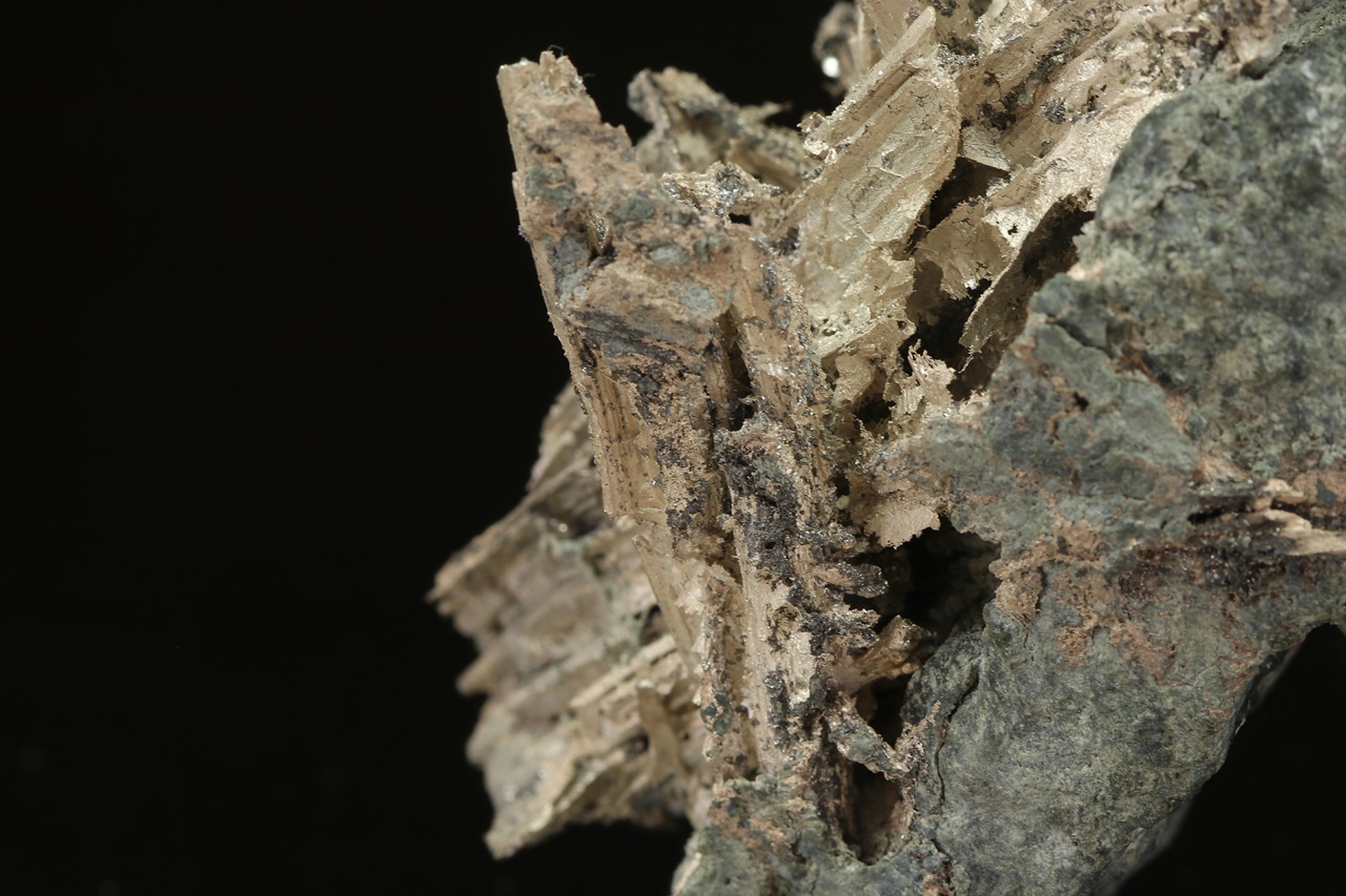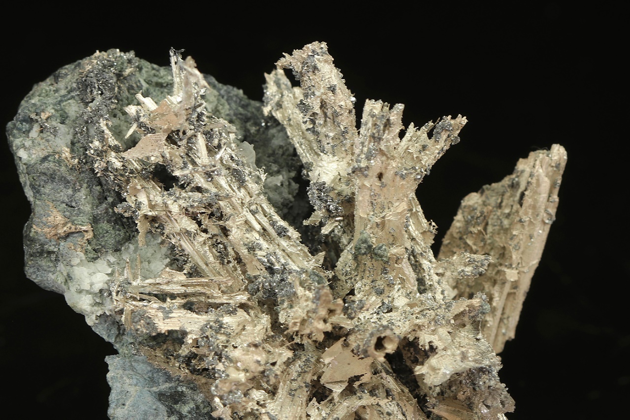 An exceptional sample of pure silver formed by unusually long, lath-like pseudomorphs after dyskrazite crystals. The longest pseudomorphs are 7 cm in length and are intergrown with additional smaller pseudomorphs. The base of this exceptionally aesthetic specimen is composed of grey rock. The silver is locally grown with small löllingite crystals.