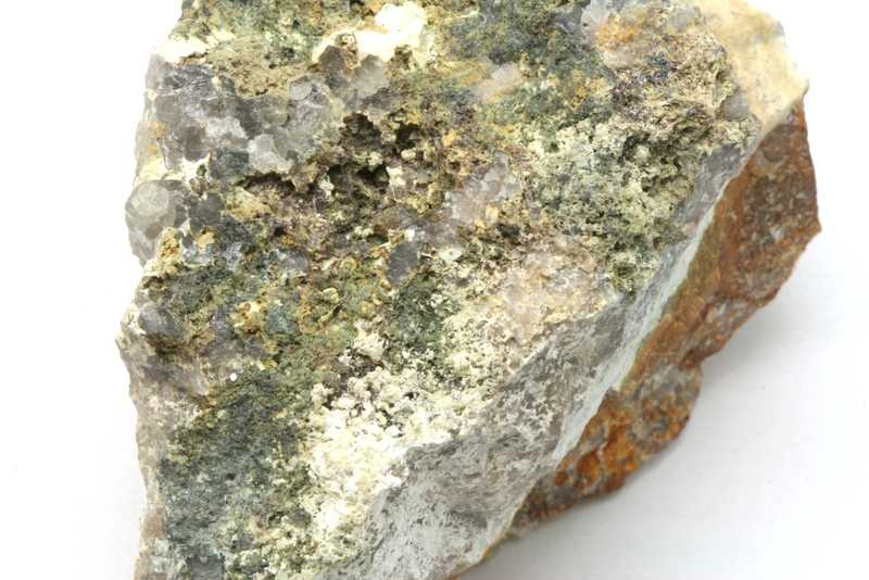 Sample of scorodite from the Preiselberg mining district. Example of light green scorodite beads and dark green pharmacosiderite.