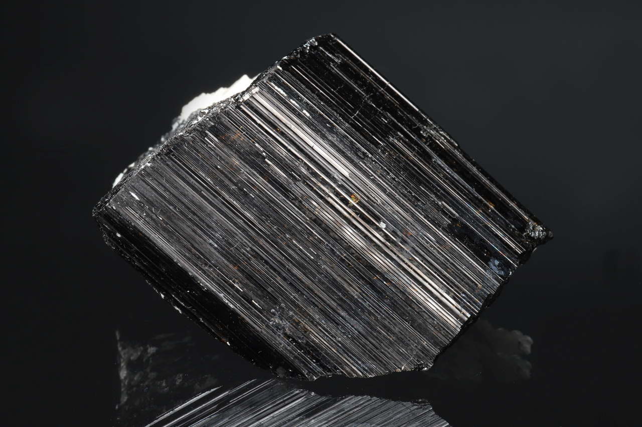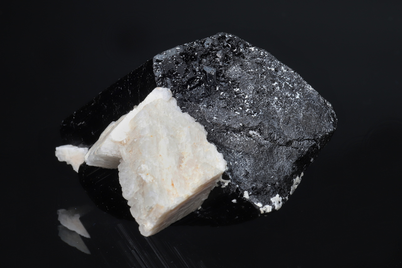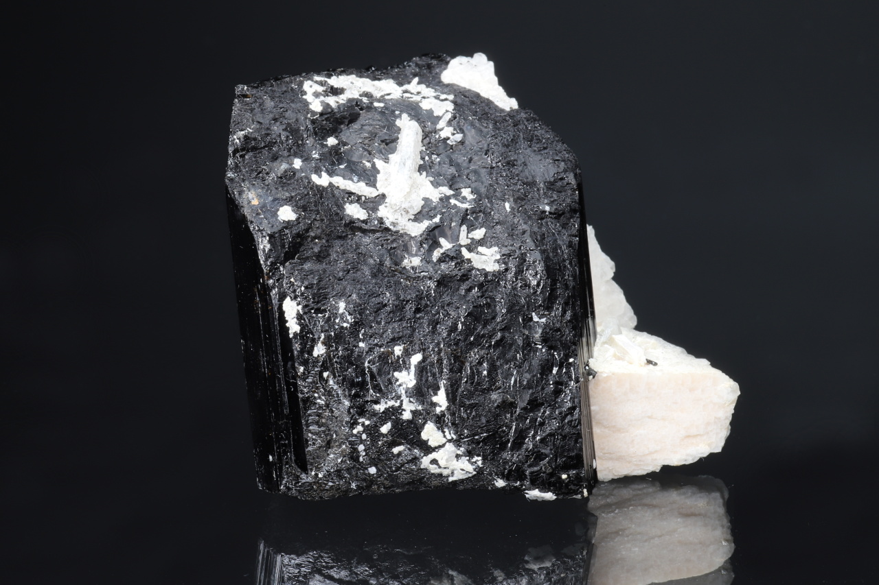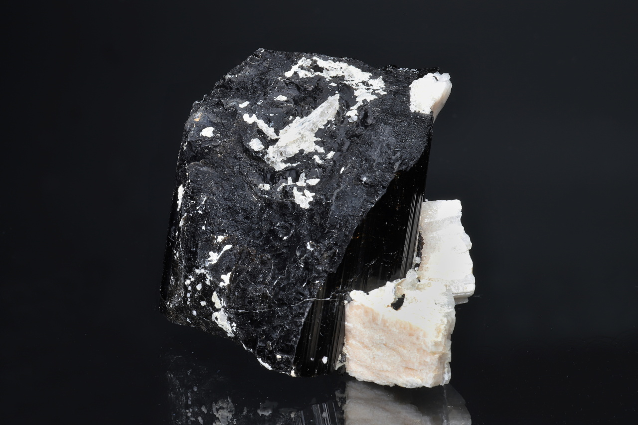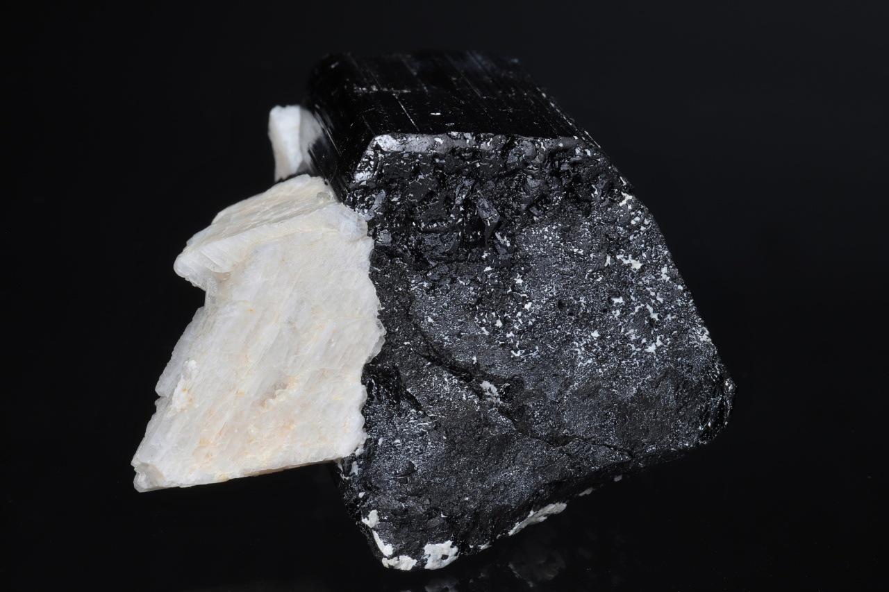 A thick columnar striated lustrous crystal of schorl, which is naturally healed and overgrown with crystals of white albite. A nice example of minerals from the pegmatite cavities in Dolní Bory.