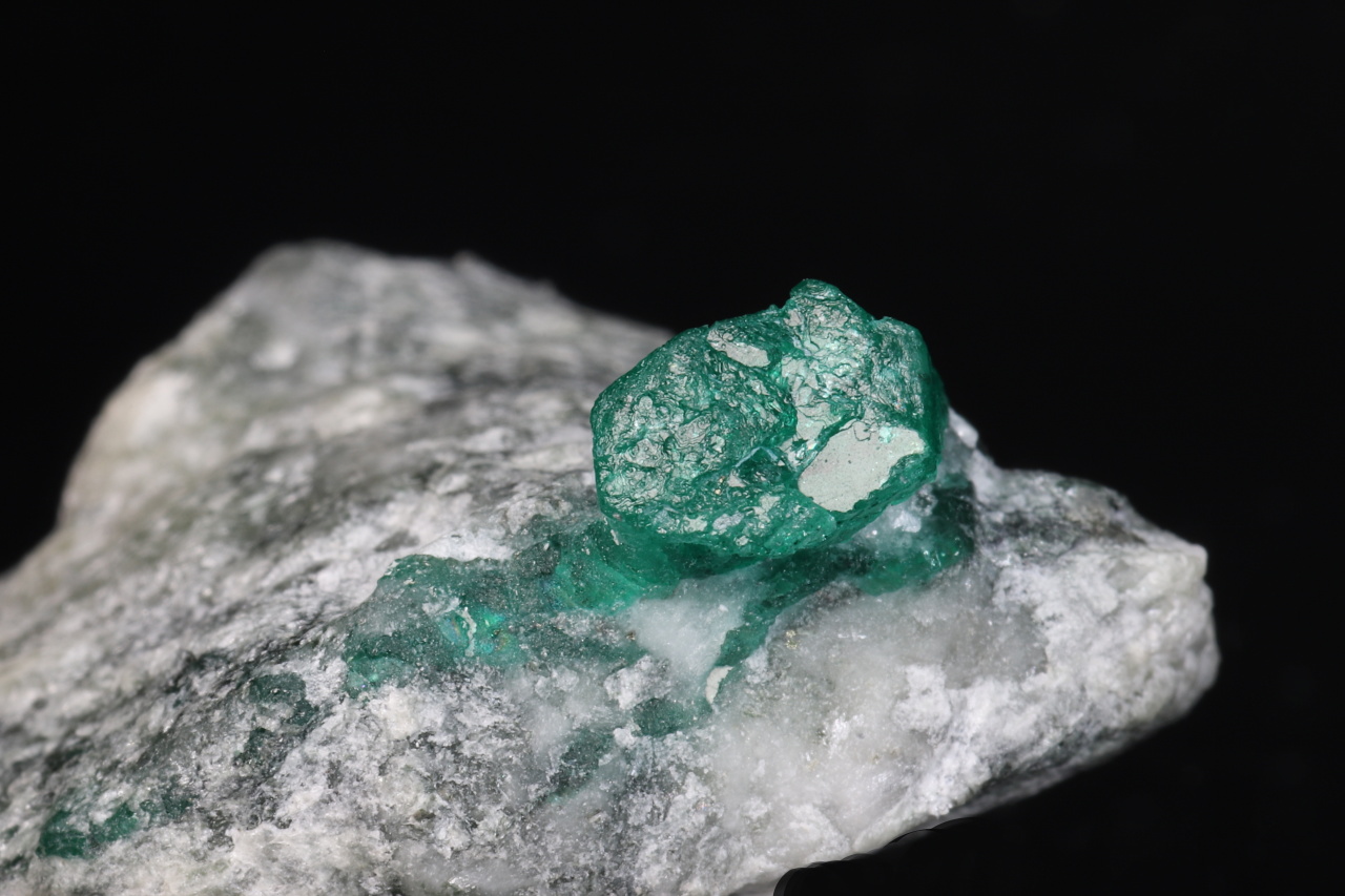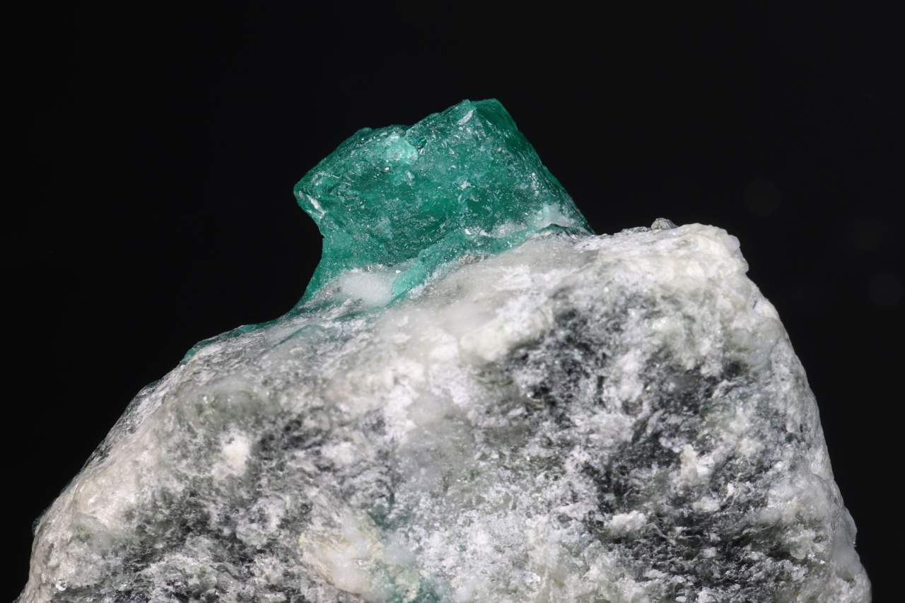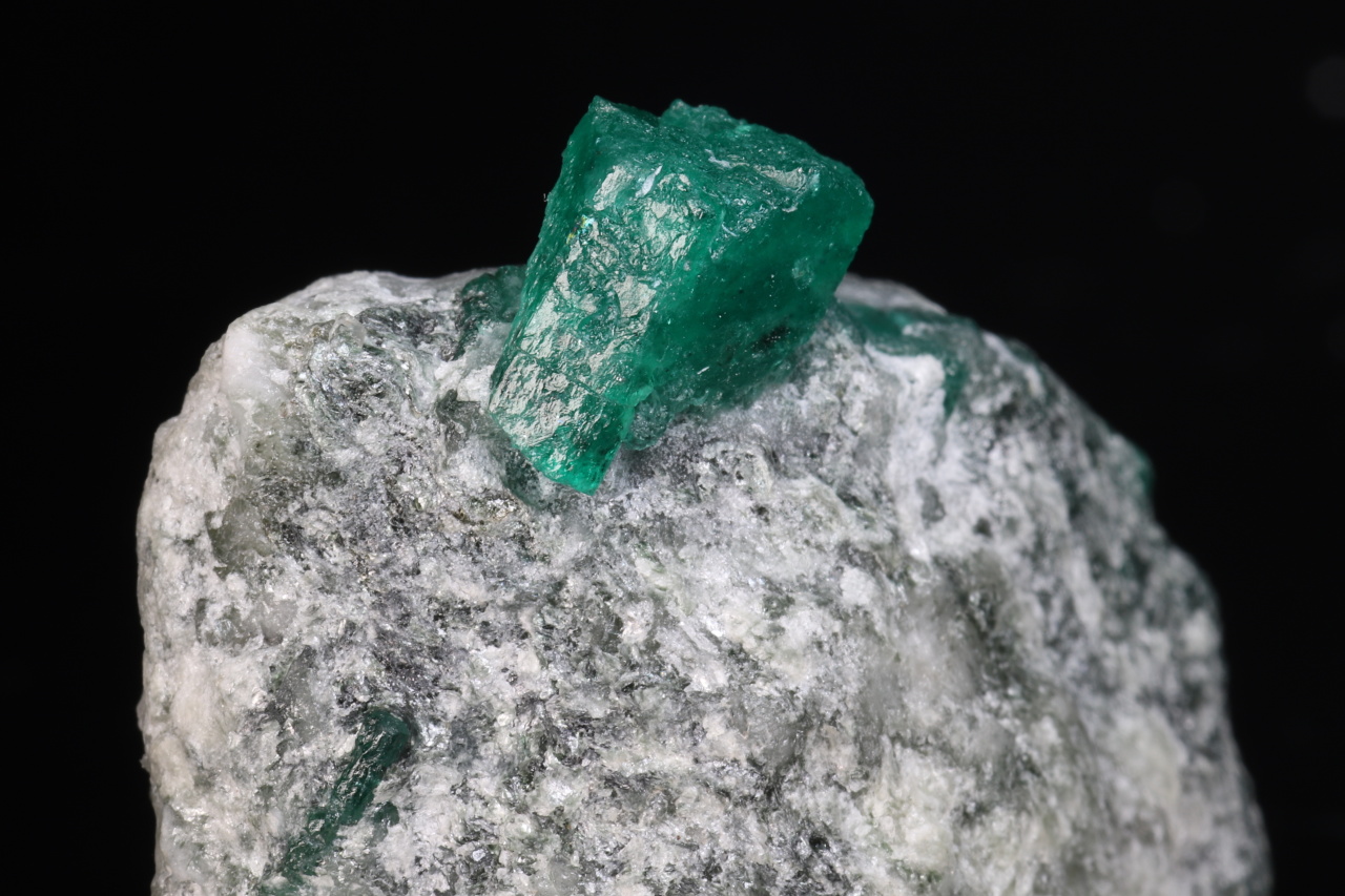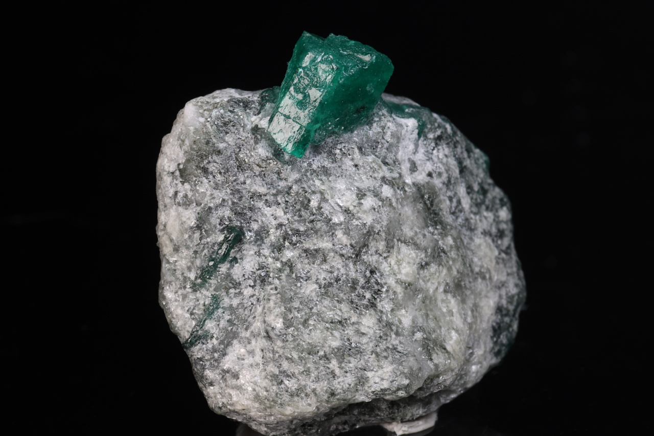 Sytě zelený průsvitný šestiboký ukončený krystal smaragdu o velikosti 8 mm vypreparovaný z horniny. Velmi pěkná sytá menší ukázka smaragdu z naleziště Swat v Pakistánu.