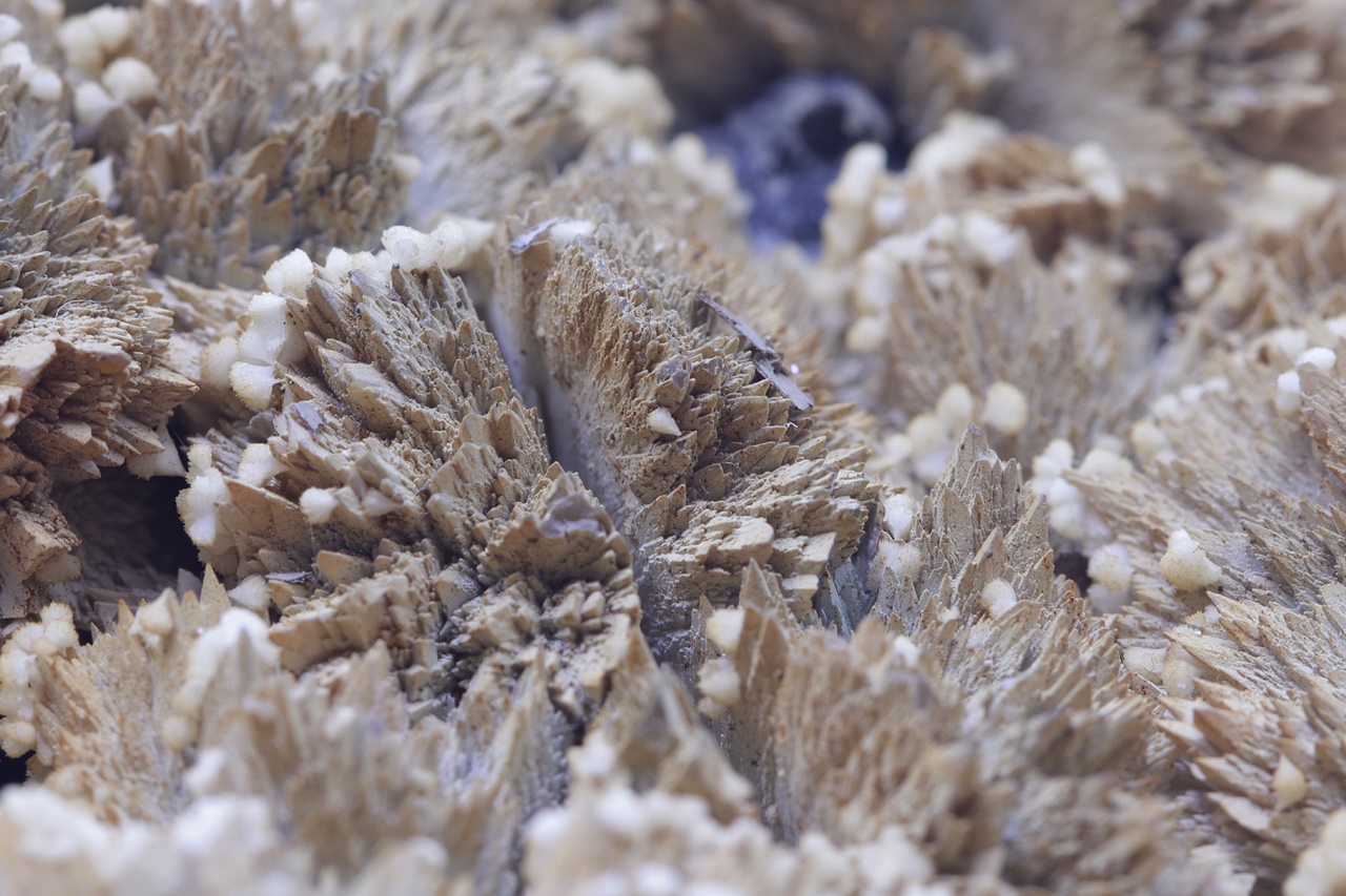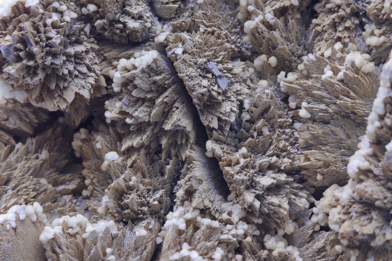 Beige dolomite crystals forming radial aggregates growing on black sphalerite.