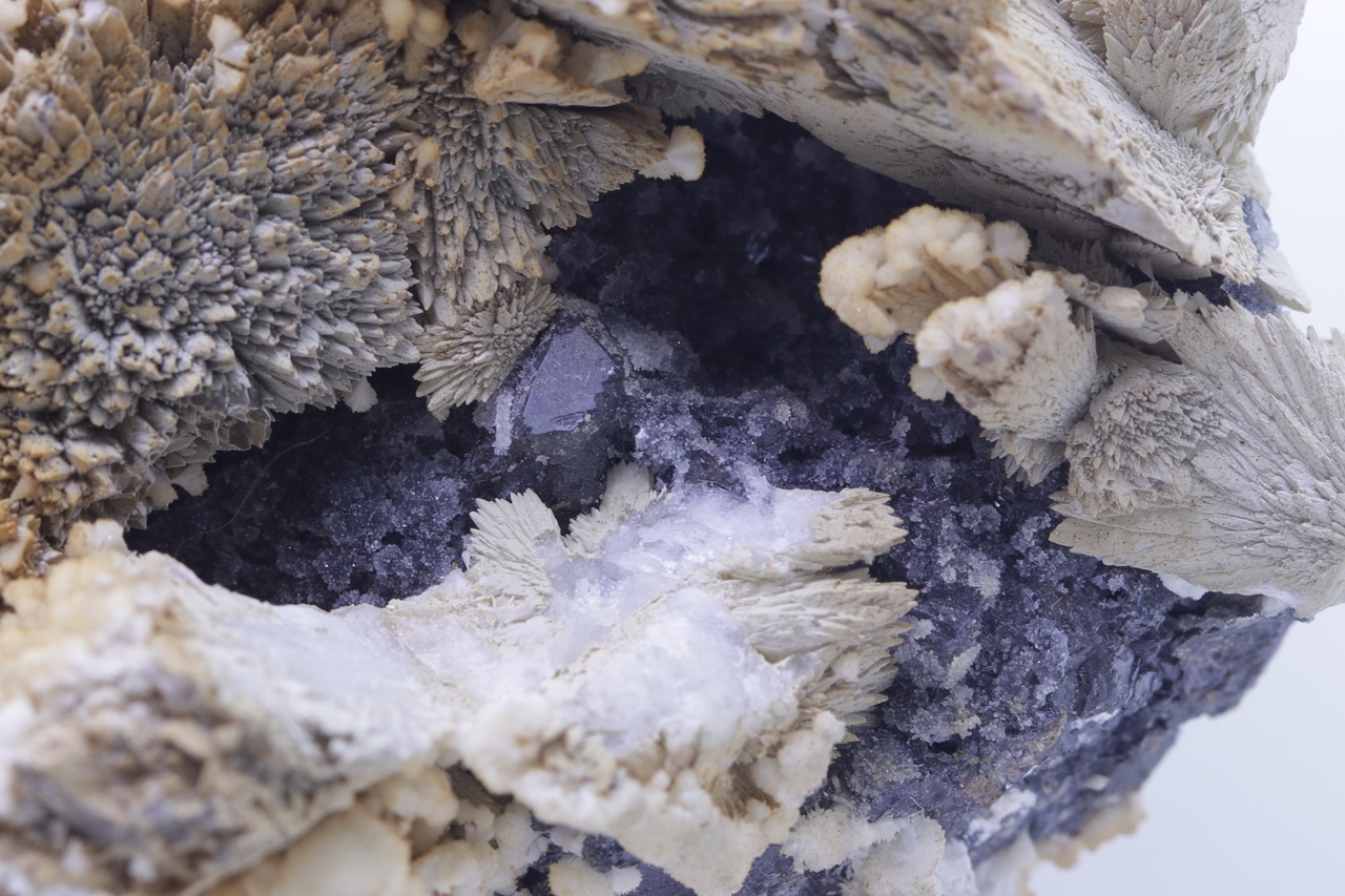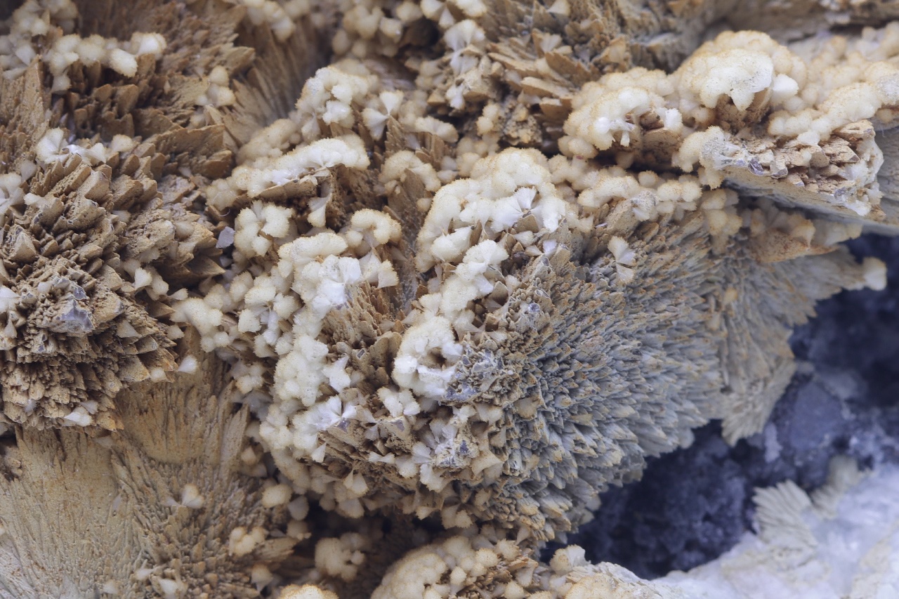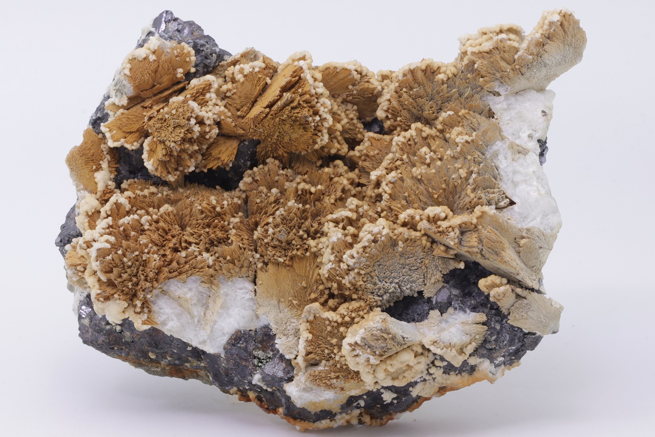 Crystals of beige dolomite forming radial aggregates growing on black sphalerite.