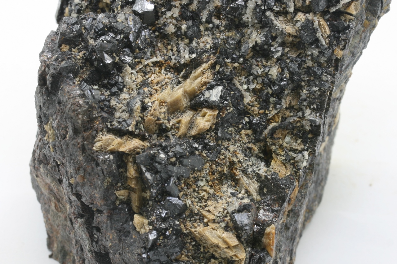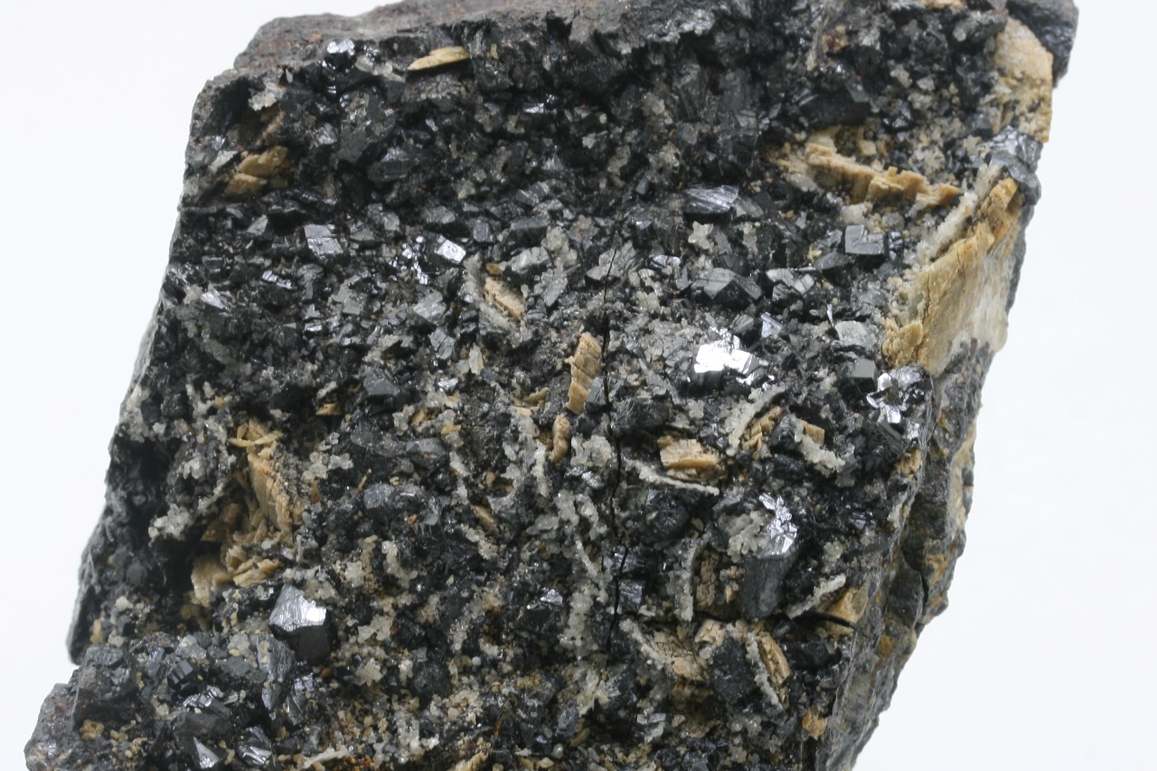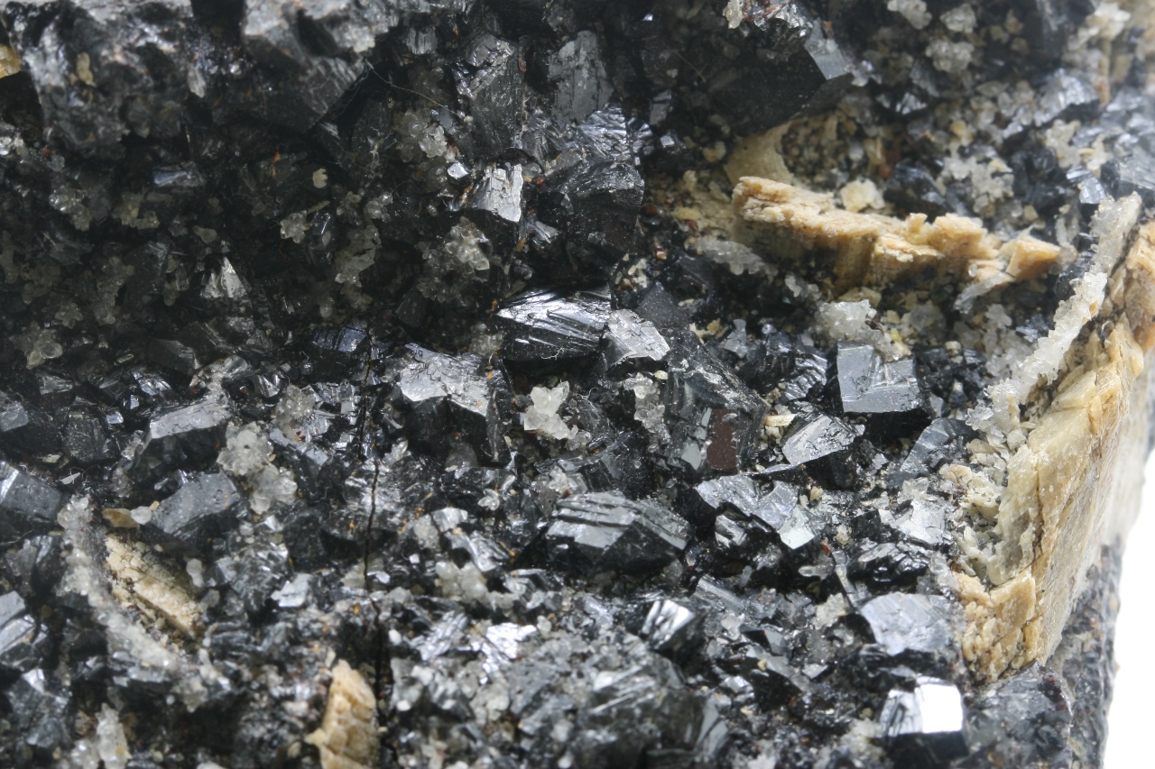 Black, very shiny crystals of sphalerite up to 5 mm in size with beige crystals of siderite.